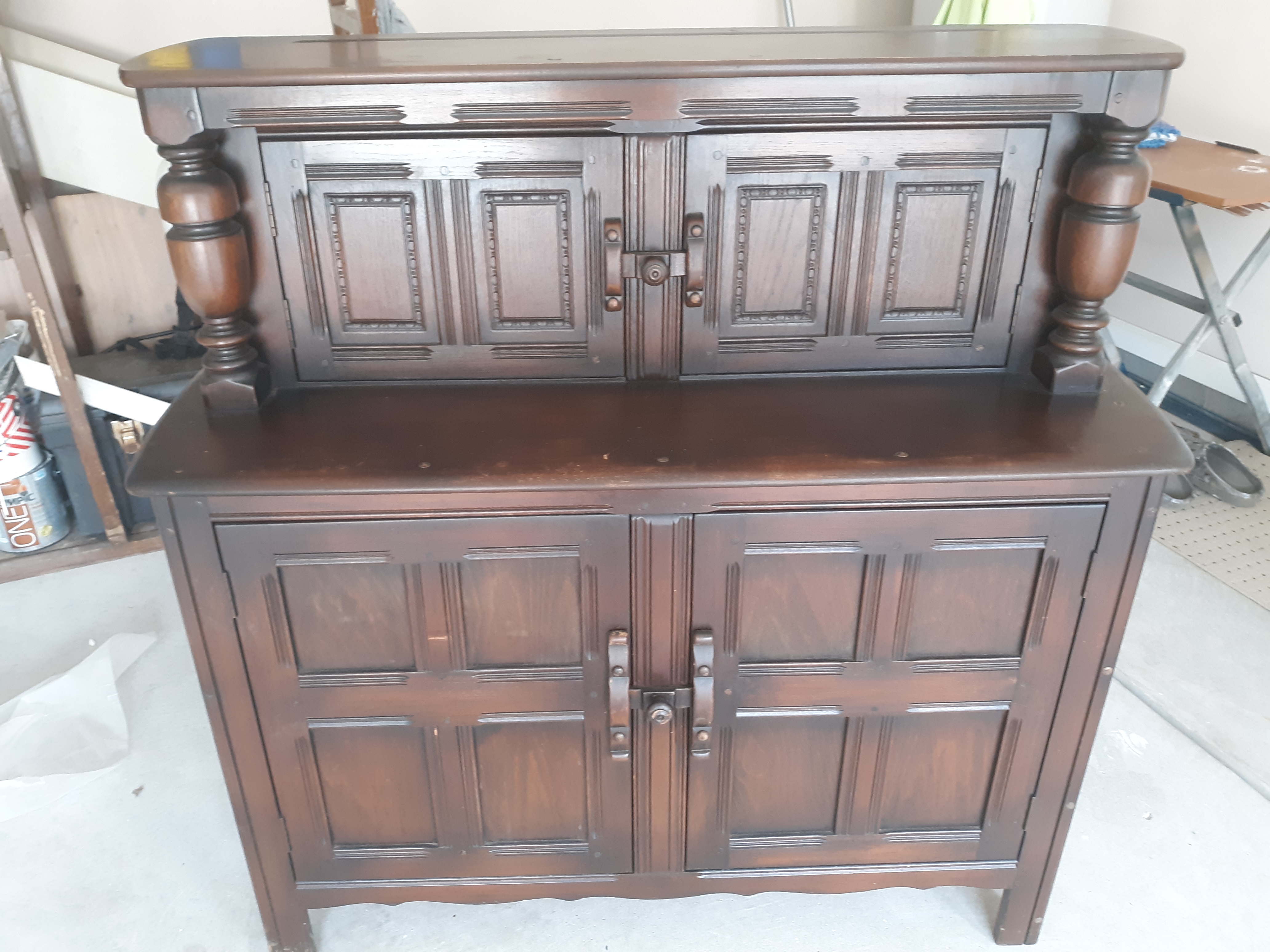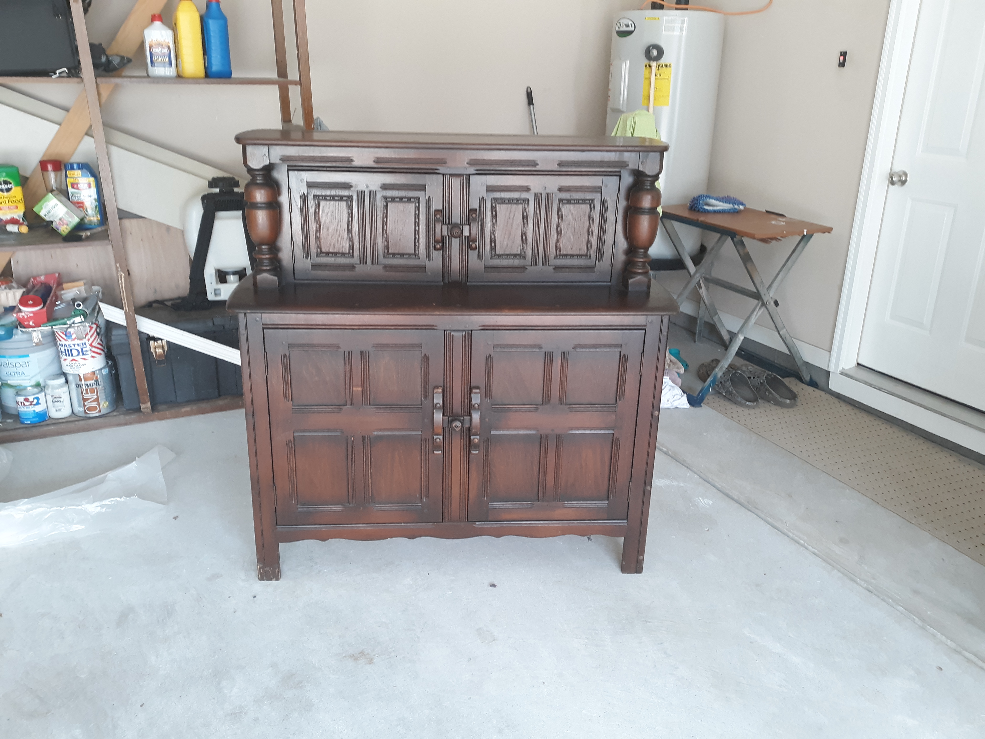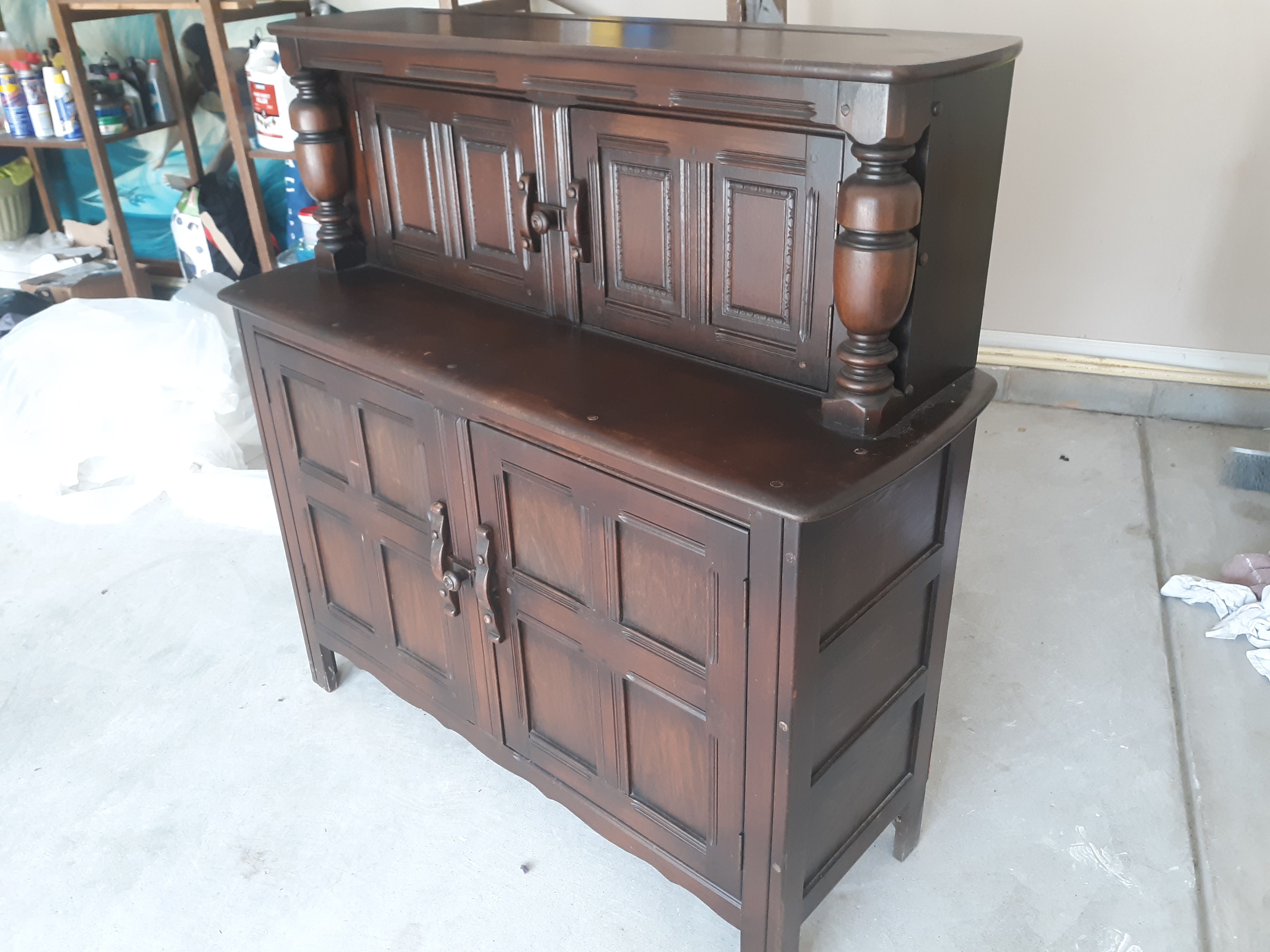 It's a "Court Cupboard" in a style often called "Jacobean Revival" the style loosely based on early English furniture made during 1500 and 1600's. Some are now antiques in their own right, being produced in the Victorian era, later ewamples dating from the 1930's. This one is likely from the 30's, exported over here from England or Europe during the last big demand for such furniture during the 1980's. Demand for furniture like this is now rather modest, comparables at auction now often sell for under $500.00