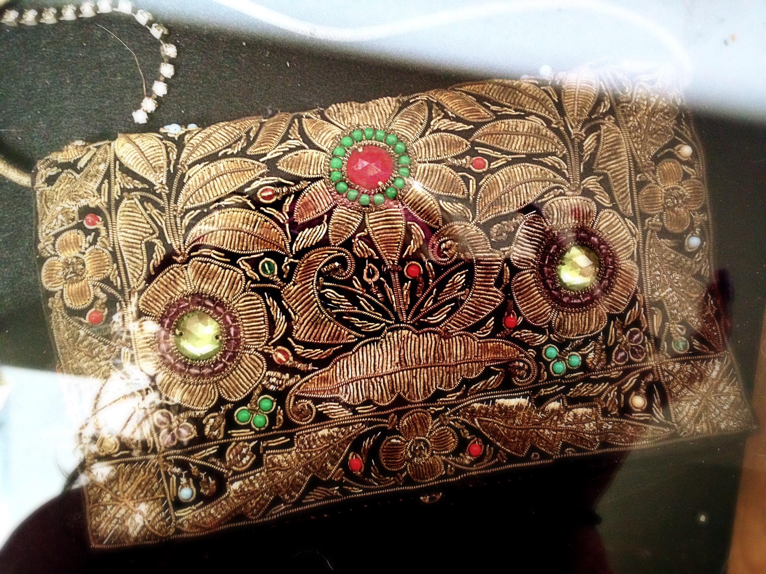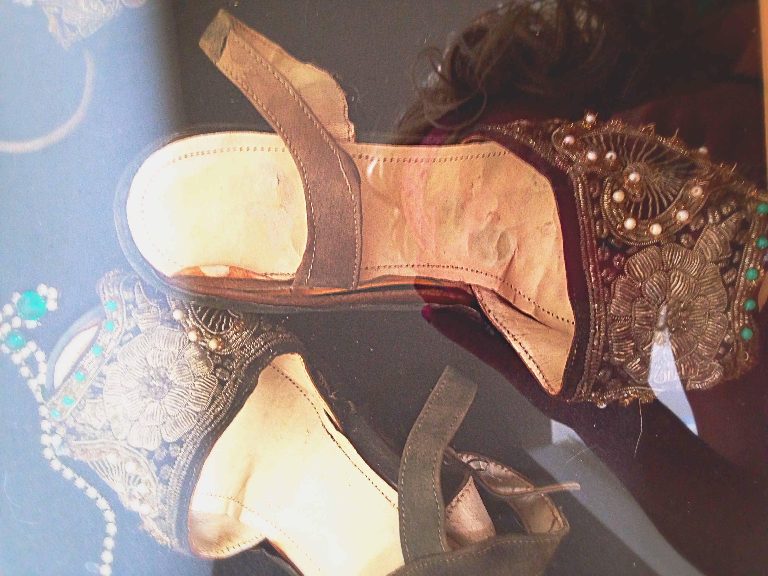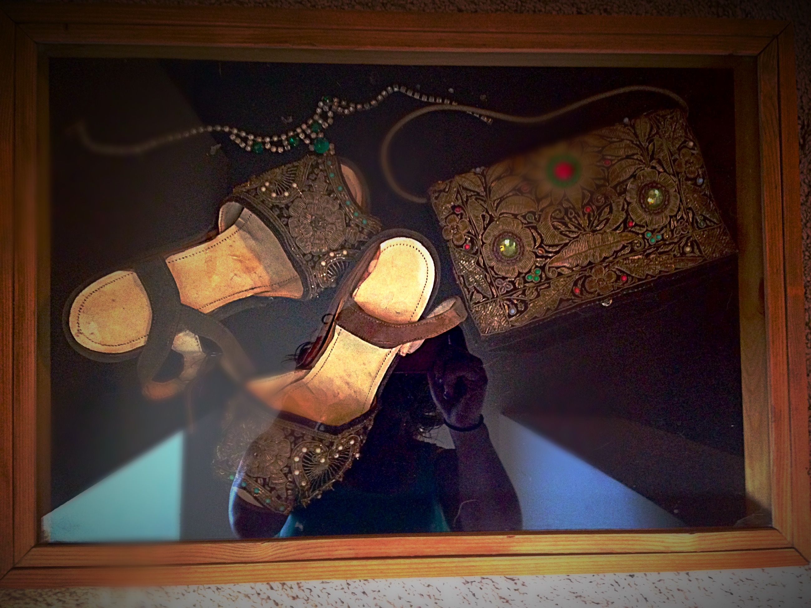 was purchased in auction over 20 years ago from a man who claimed that he was a conducter of broadway shows in disneyland, and the items that were purchased belond to one of the leading actresses in the broadway shows, they were part of here atire in the acts performed. the purse and shoes have the same silver wire work, some missing beads, the inner linning of the shoes are detaching but not bad, they both are still in good shape and have been kept in display case sinse they were purchased. The jewelry is just costume no markings.