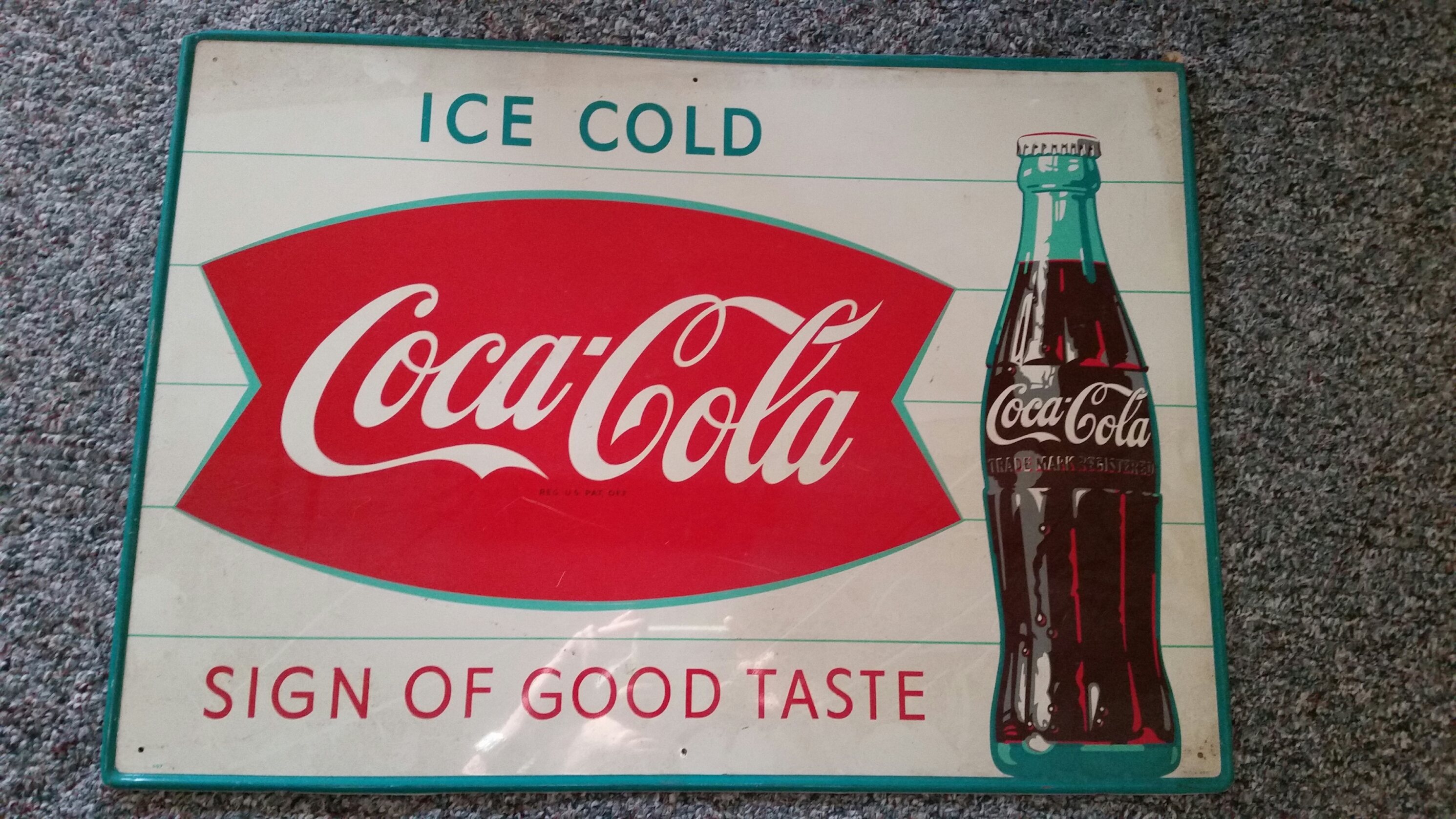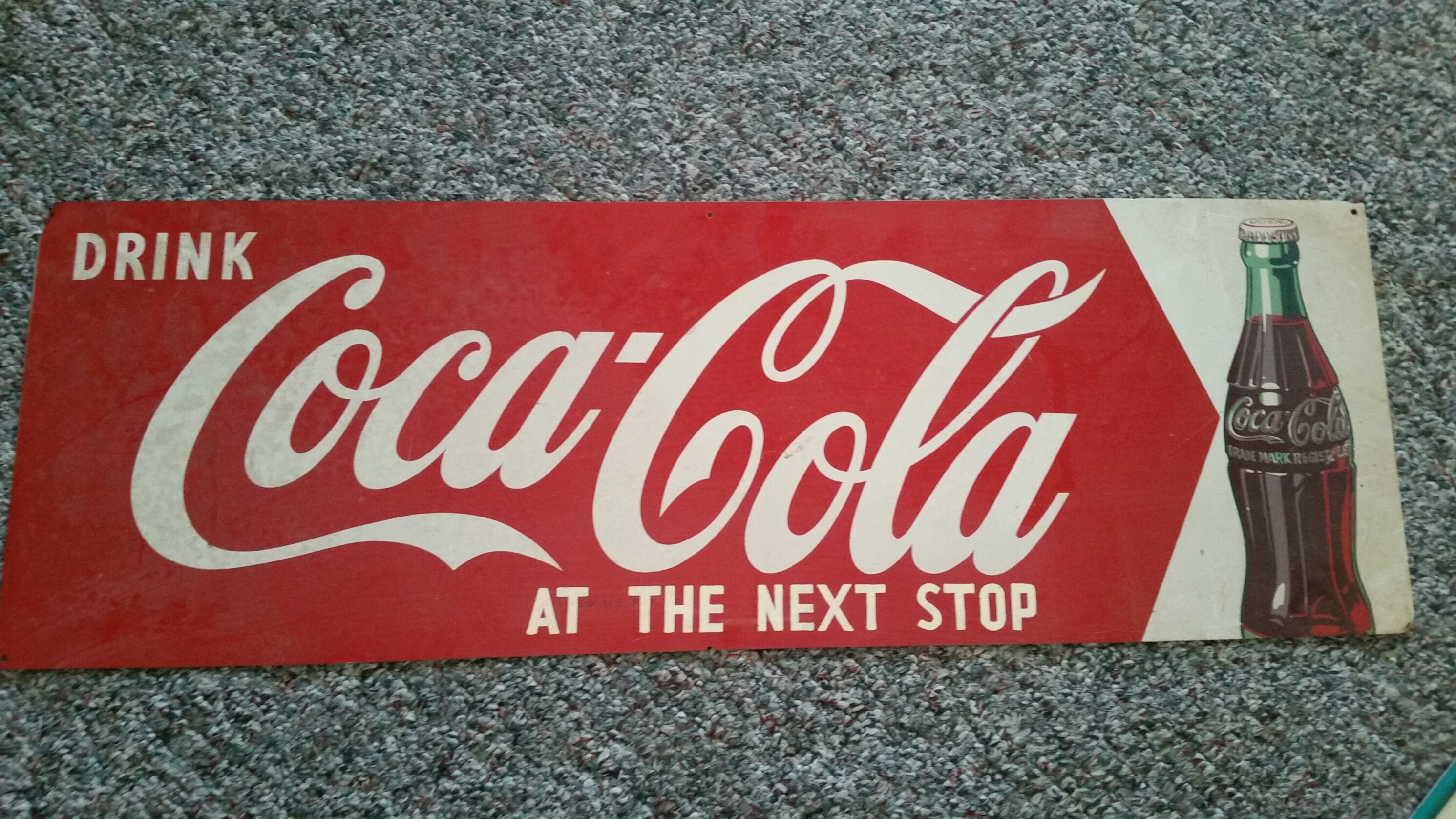 3 soda metal signs 7up is made by stout sign co. Measures 27"x19" the larger coke sign measures 27"x19" and the other red coke sign measures 30"x11" I believe the 7up sign is from the 50s unsure of others.