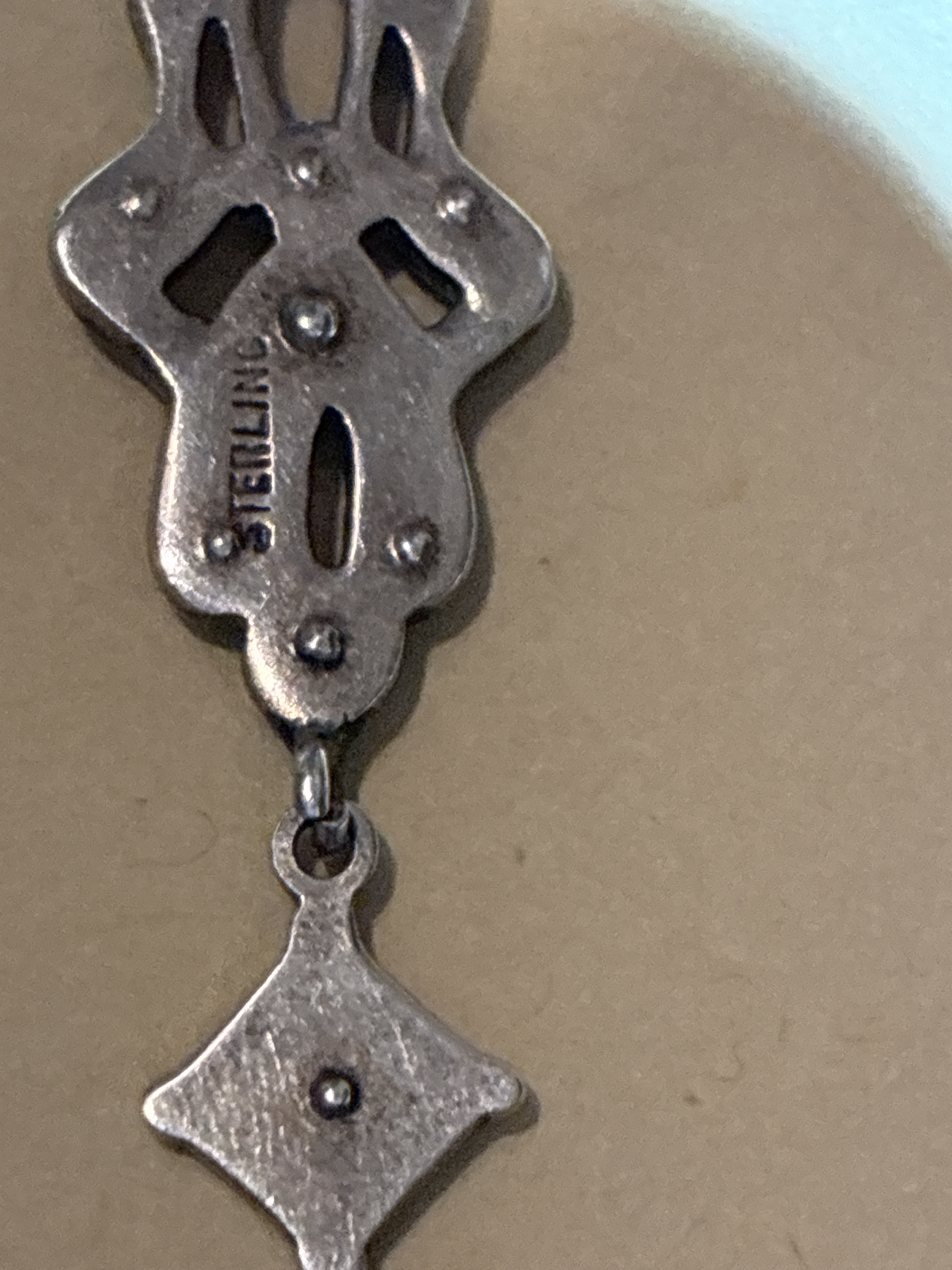 The necklace features a barrel clasp and is stamped "STERLING" on the back, which is indicative of jewelry made in the early to mid-20th century. The design elements also reflect styles popular during this period.