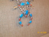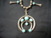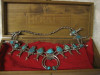 This was passed down my family. It is a navajo vintage sterling silver and turquoise squash blossom necklace. It has 18 pieces of turquoise, 10 squash blossoms, with a hook closure.