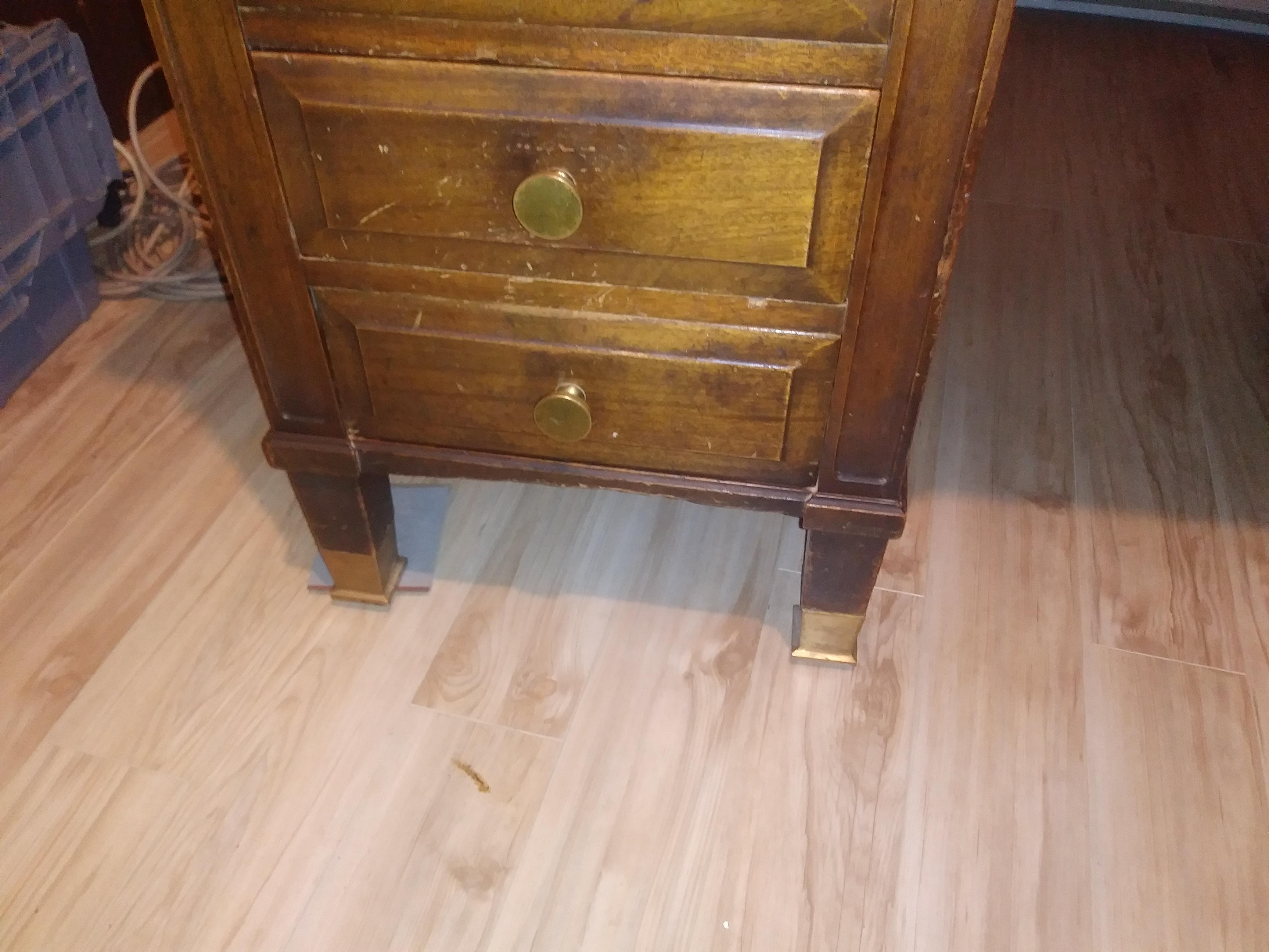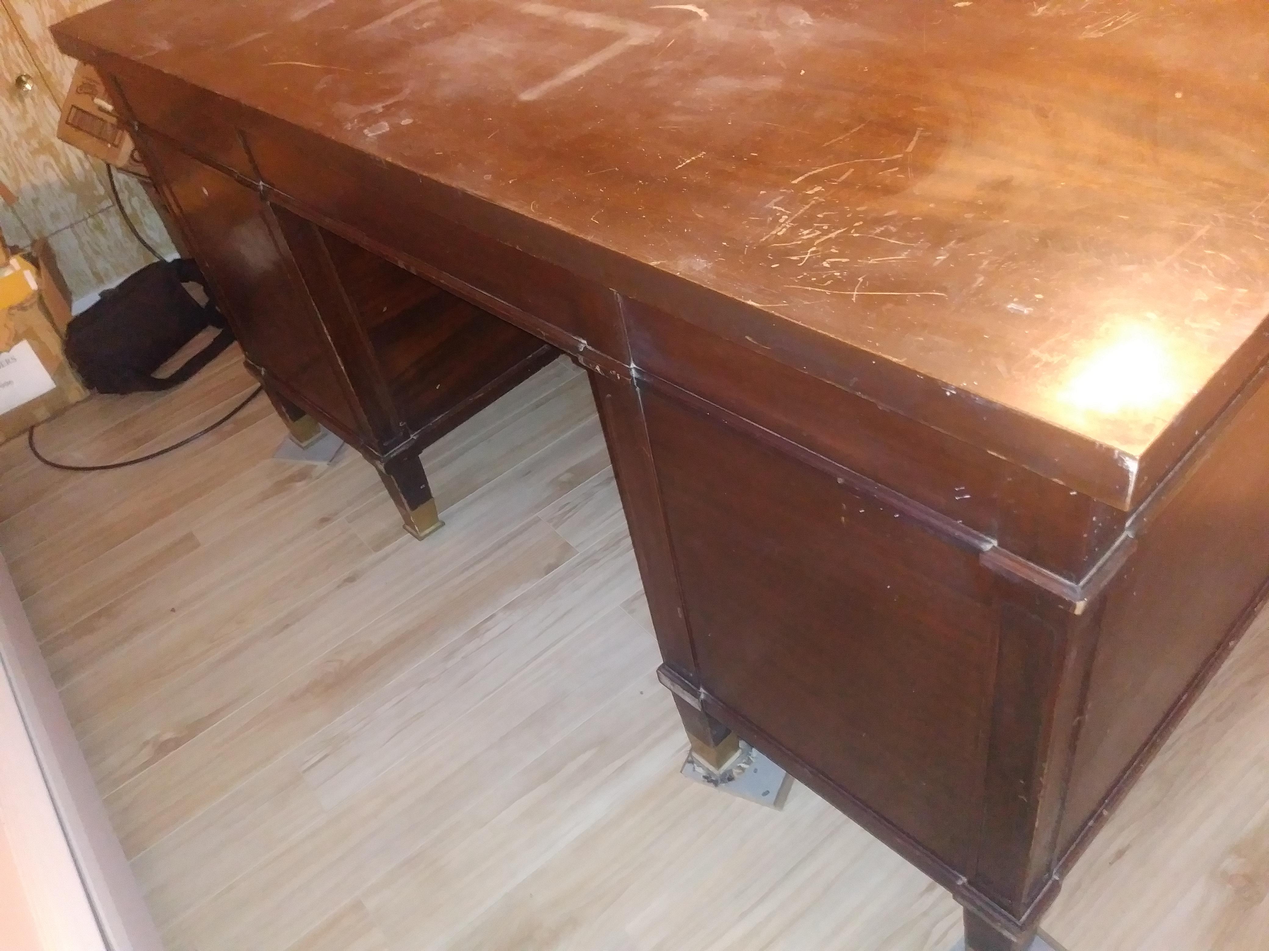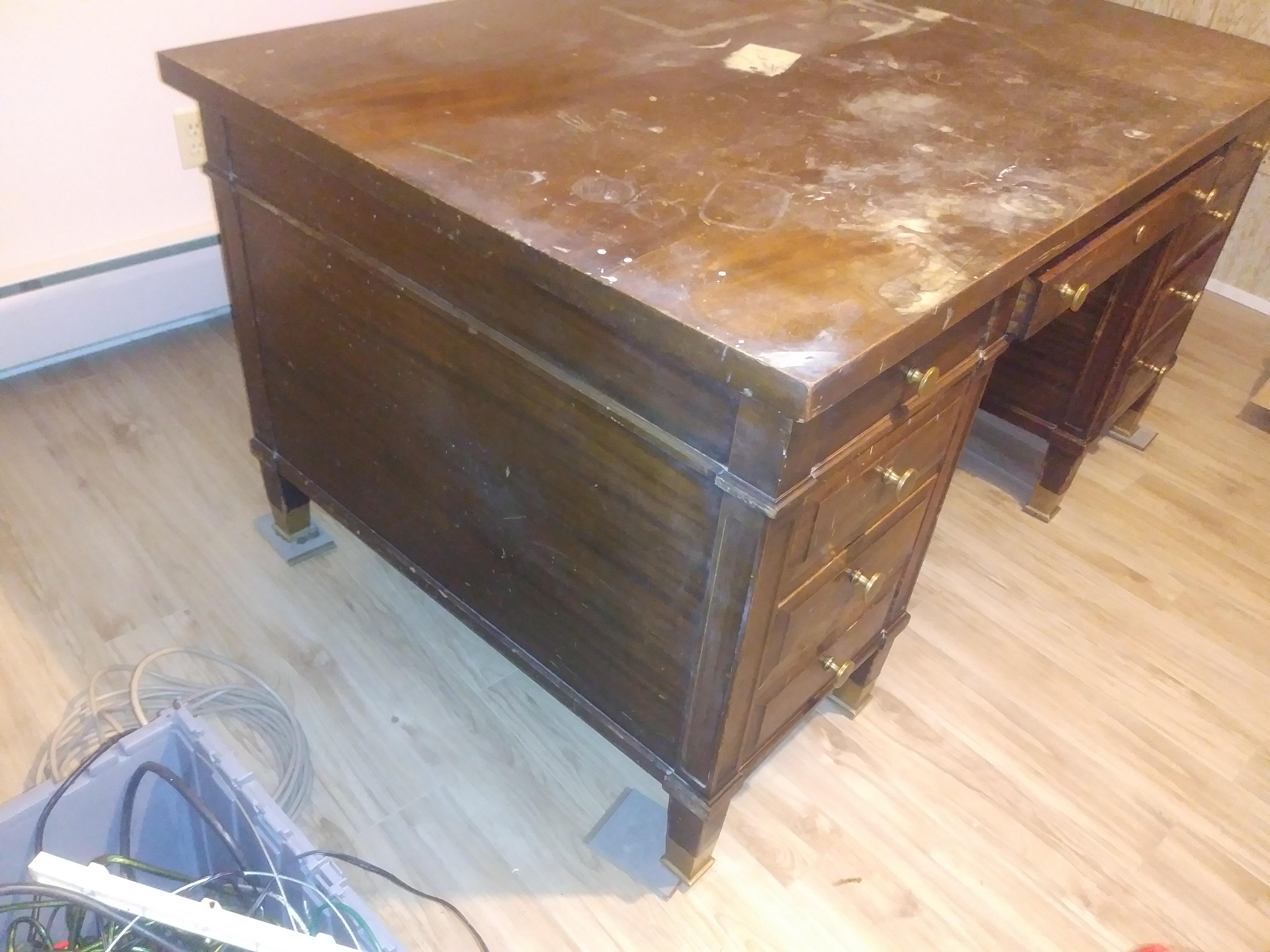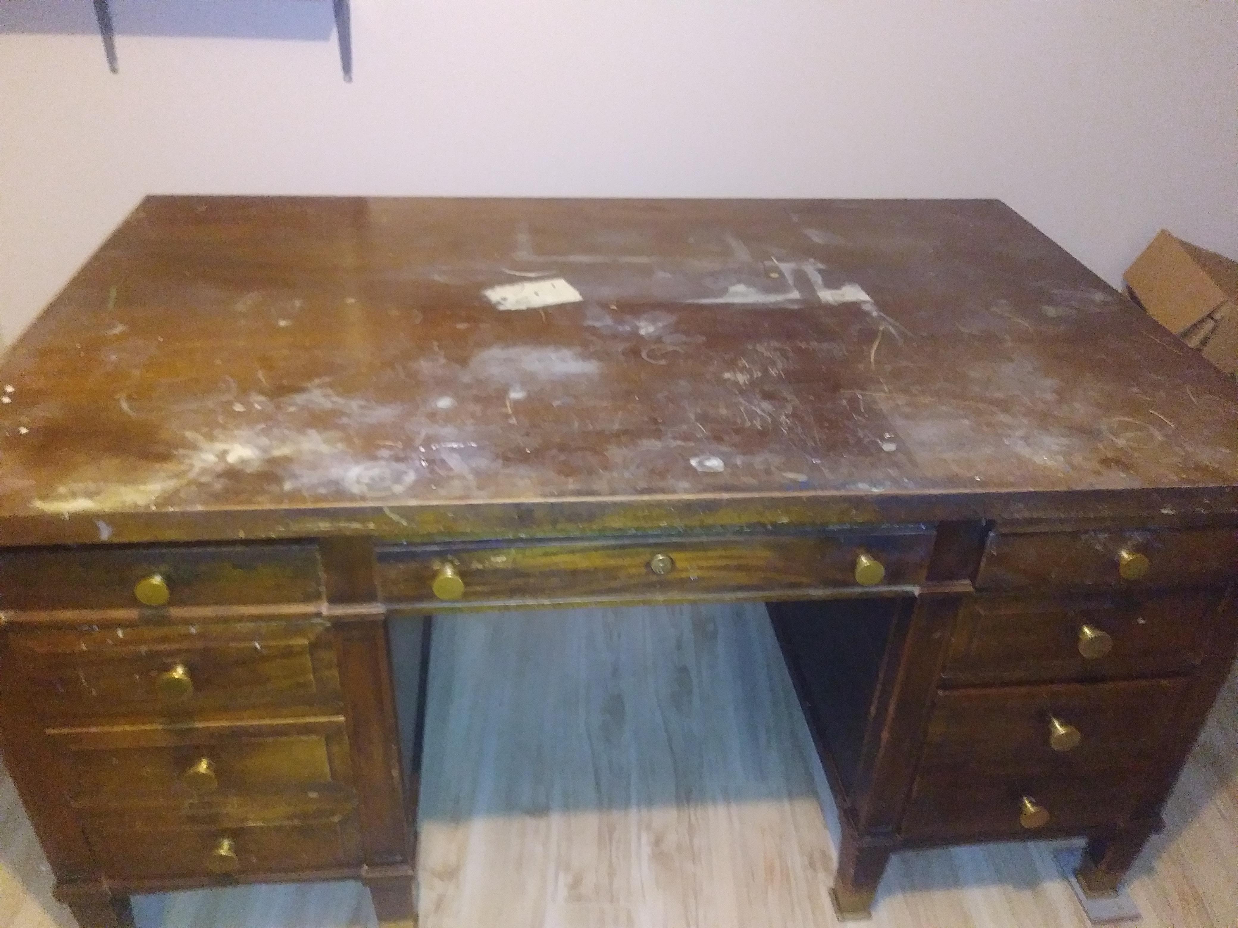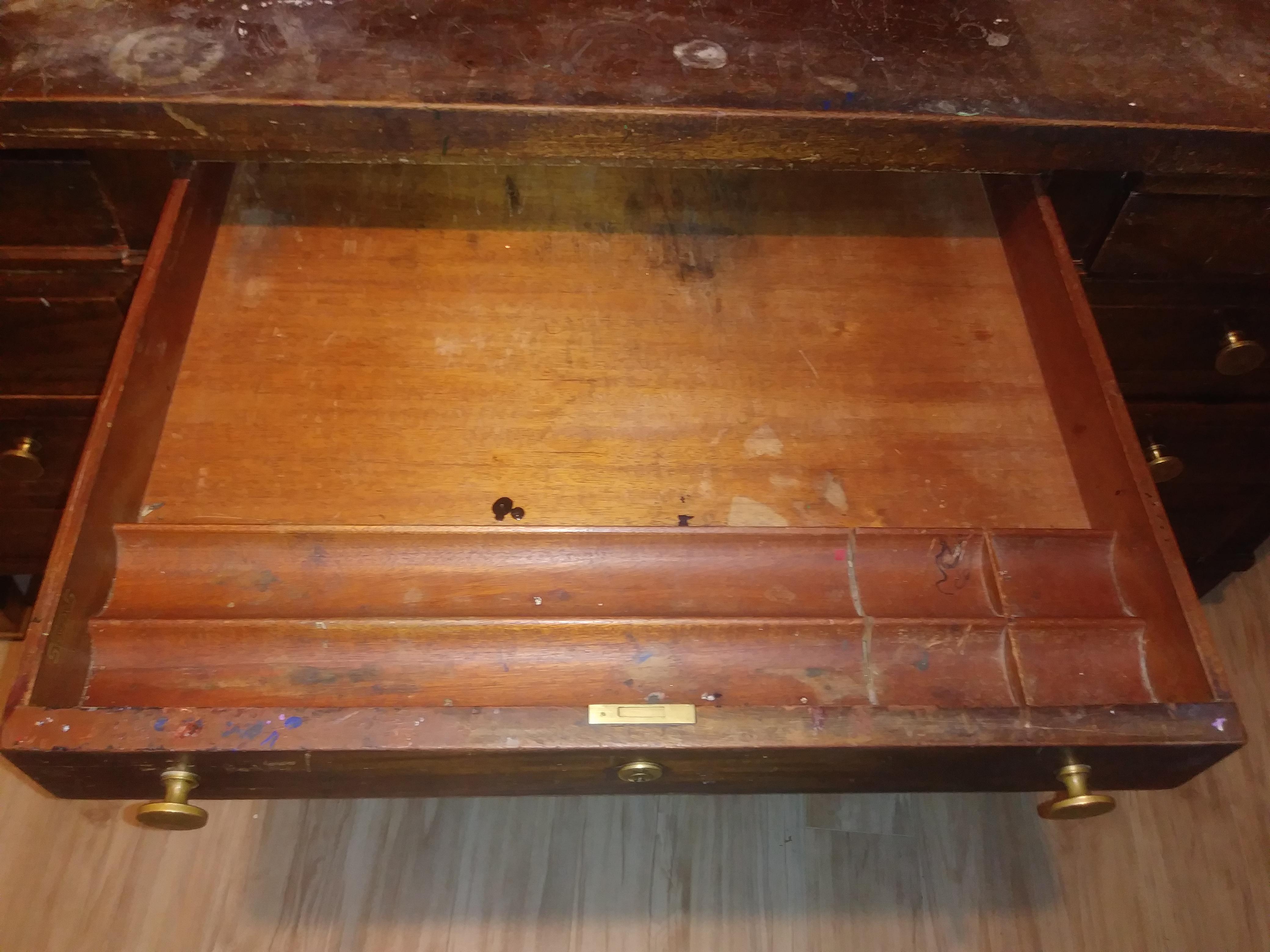 This Stow-Davis desk was purchased at a yard sale by my father-in-law in the early 60's. I have been told it is mahogony. There are 7 drawers and when closed in a particular sequence the drawers lock and must be pulled on in a particular sequence to open. The top could usesome sanding and would be beautiful restored. The bottoms of the legs and drawer knobs are brass. I am wanting to sell but have no idea where to start for an asking price.