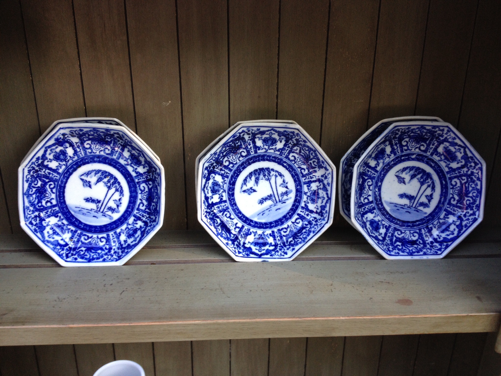 I got at a auction on a tray with glass items spent 5$ on tray..there are no marks on the back so I am unsure if they are worth anything..I have googled and no luck..they are kind like a plate but have a octagon shallow bowl like style..