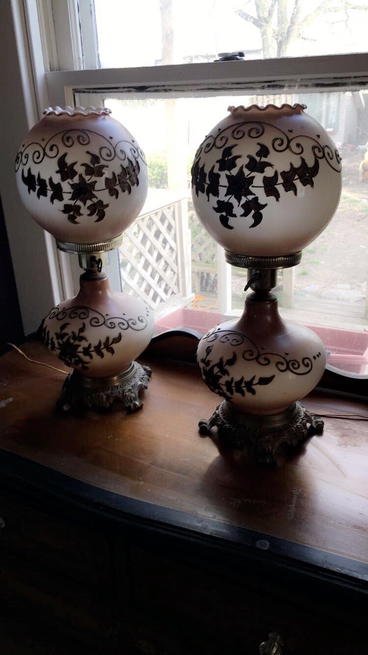 1950s (I believe) buffet lamps. Globe lamps are about 24 inches tall. Brass detail I think. These came from a Great Aunt made by Hedco in N.Y.