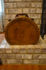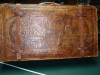 This is a three piece luggage set. It is tan leather with brass buckles that have the word "Italy" printed on them. The only other marks on the set is located on the zipper and it is the word "Scovill" which I was able to determine is the zipper manufacturer. All three pieces are in great condition with insides appearing never used. The outside of the largest one has two very small tears aproximatelly 1/4" long. There are the original locks but no keys.