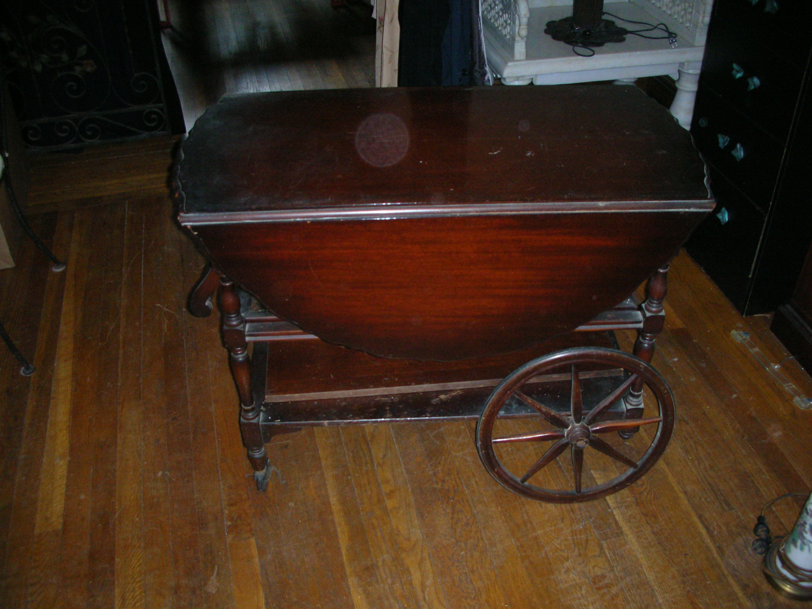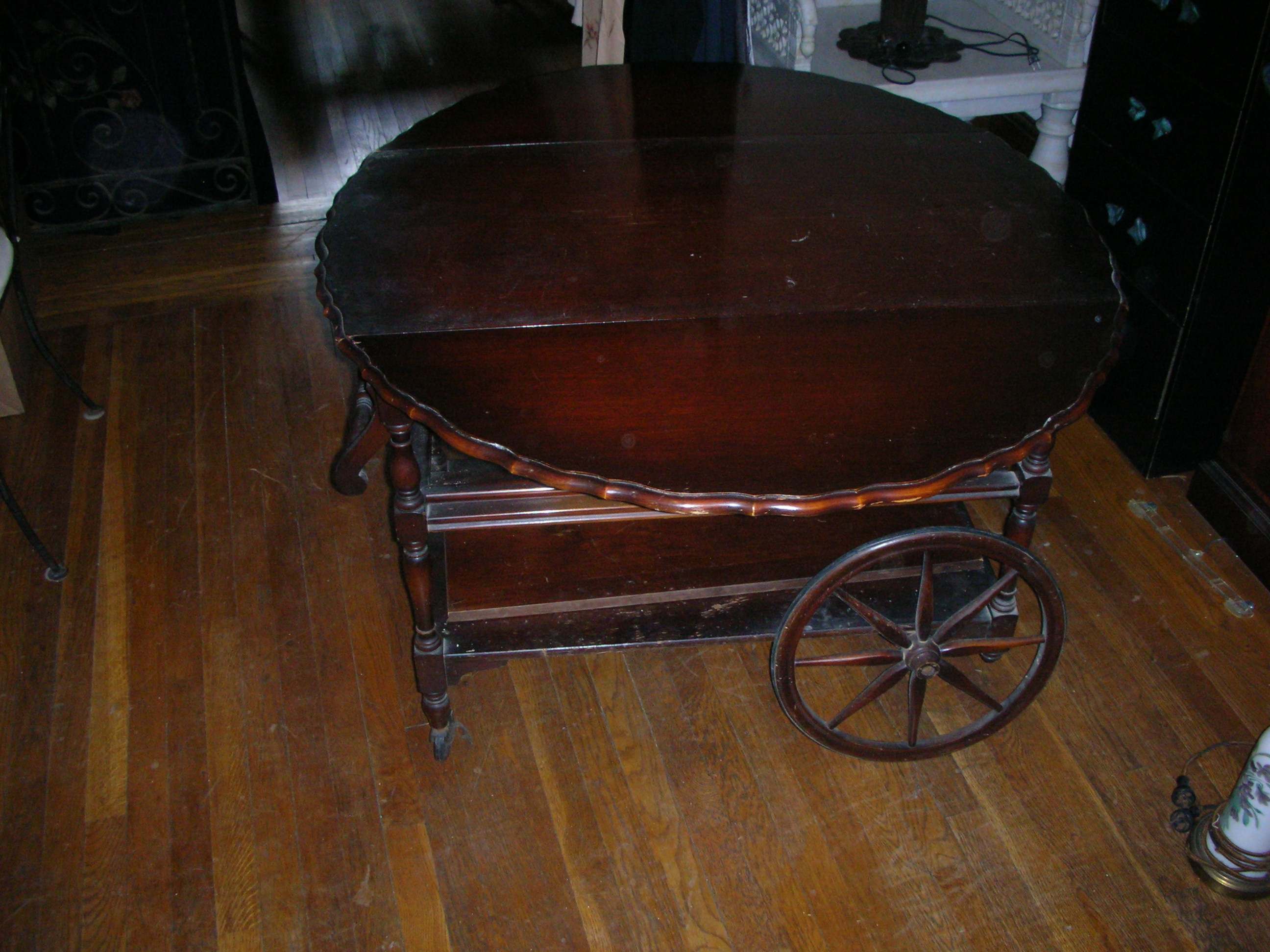 VINTAGE TEA CART TABLE WITH ROUND DROP LEAF SIDES, PULL DRAW AND GLASS SHELF.
