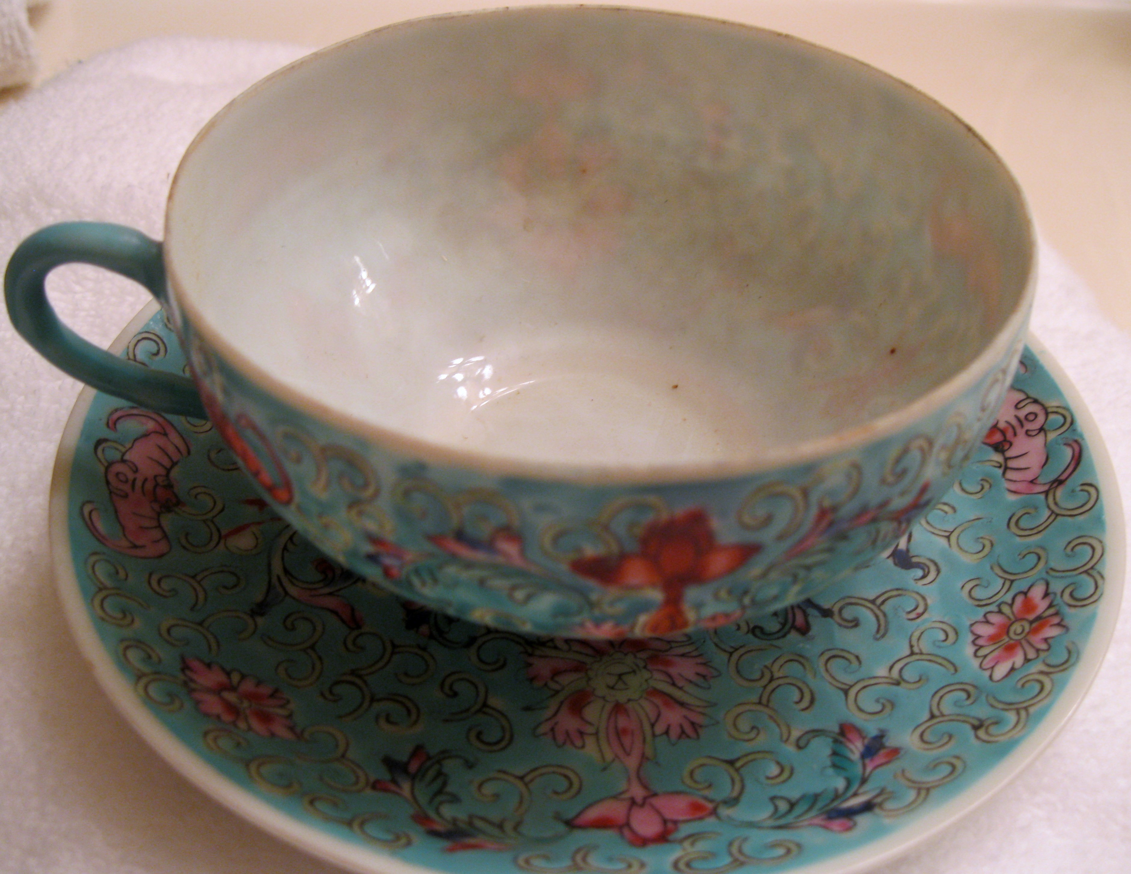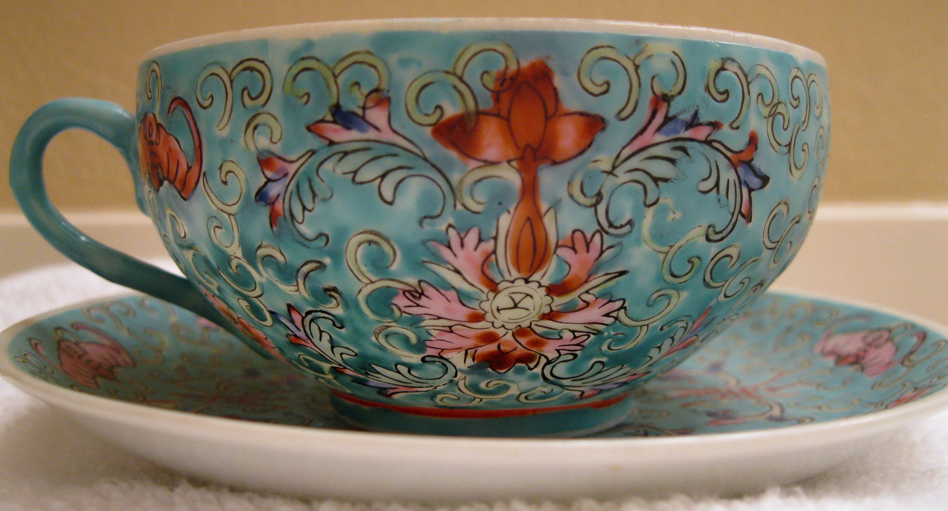 In my mom's China Cabinet since as long as I can remember (1957). I inherited these.  Does anybody have Any Clue as to what something like this is worth? Origin?  Painted in Hong Kong.