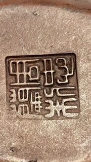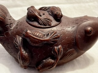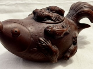 Chinese clay teapot in the shape of a fish. Lid has 2 baby fish on top. Lots of detail. Has a stamp on the bottom.