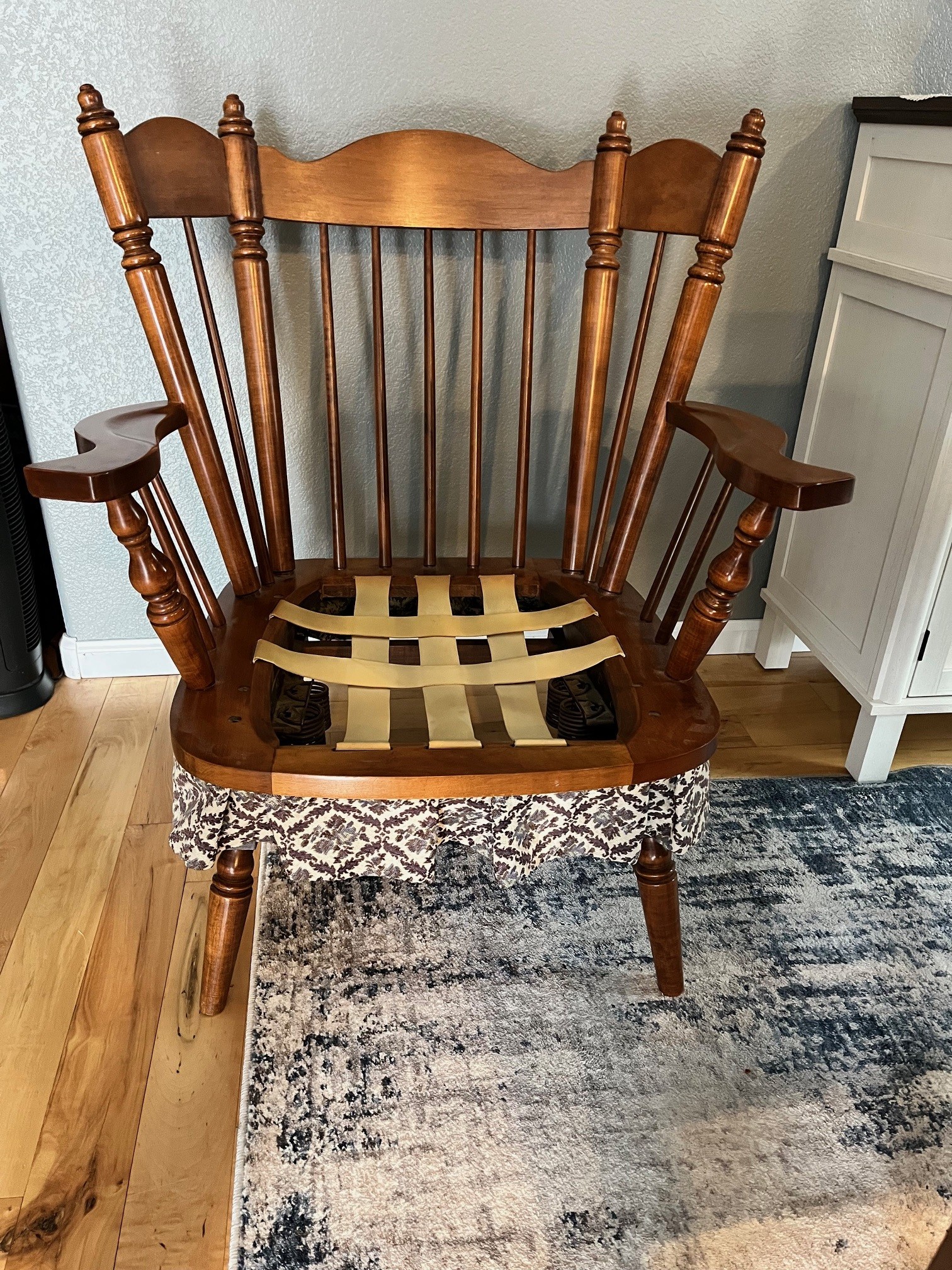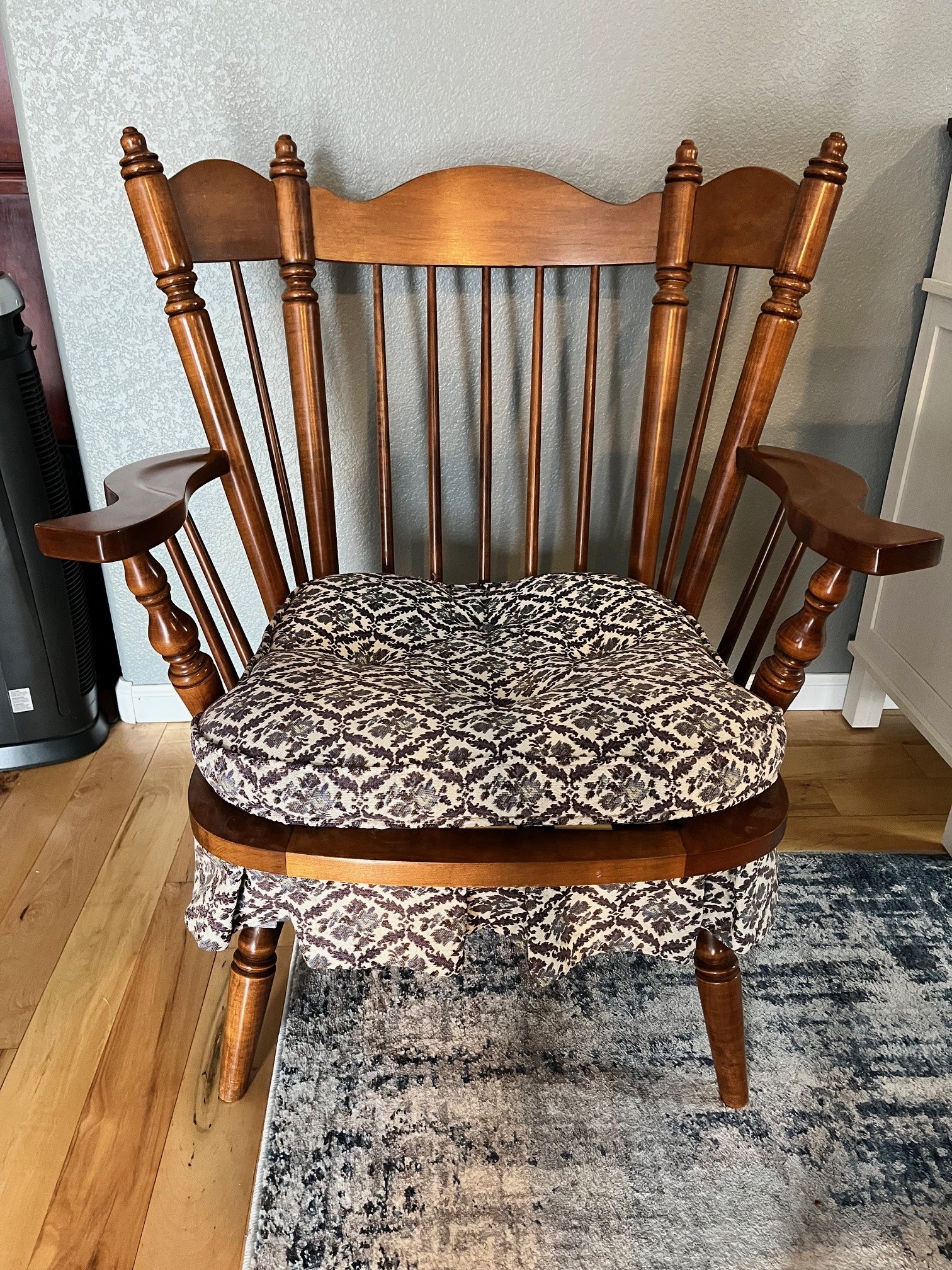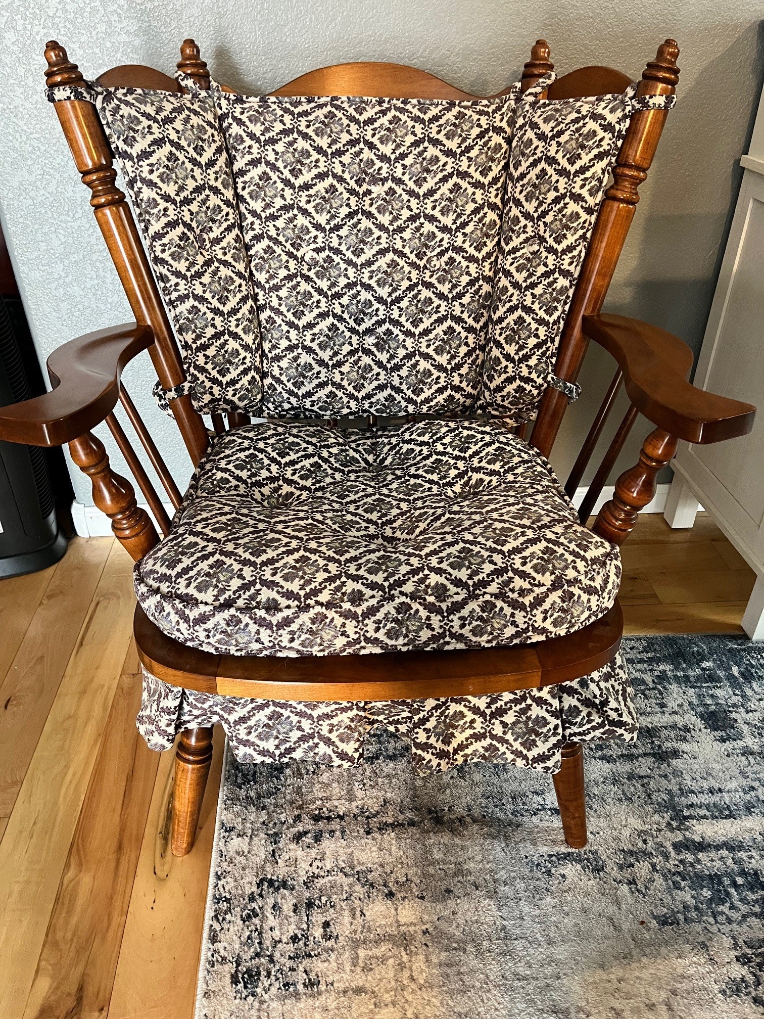 Vintage Tell City Wingback Rocker Chair. Made by Tell City Chair Company. Dating to c. 1960-1980. Materials: Hard rock maple with original upholstery fabric.. Estimated value: $150 – $350. Condition: Very Good. The market for vintage furniture, particularly from reputable manufacturers like Tell City, is currently stable with moderate demand. Prices for similar items have shown a slight increase in recent years.