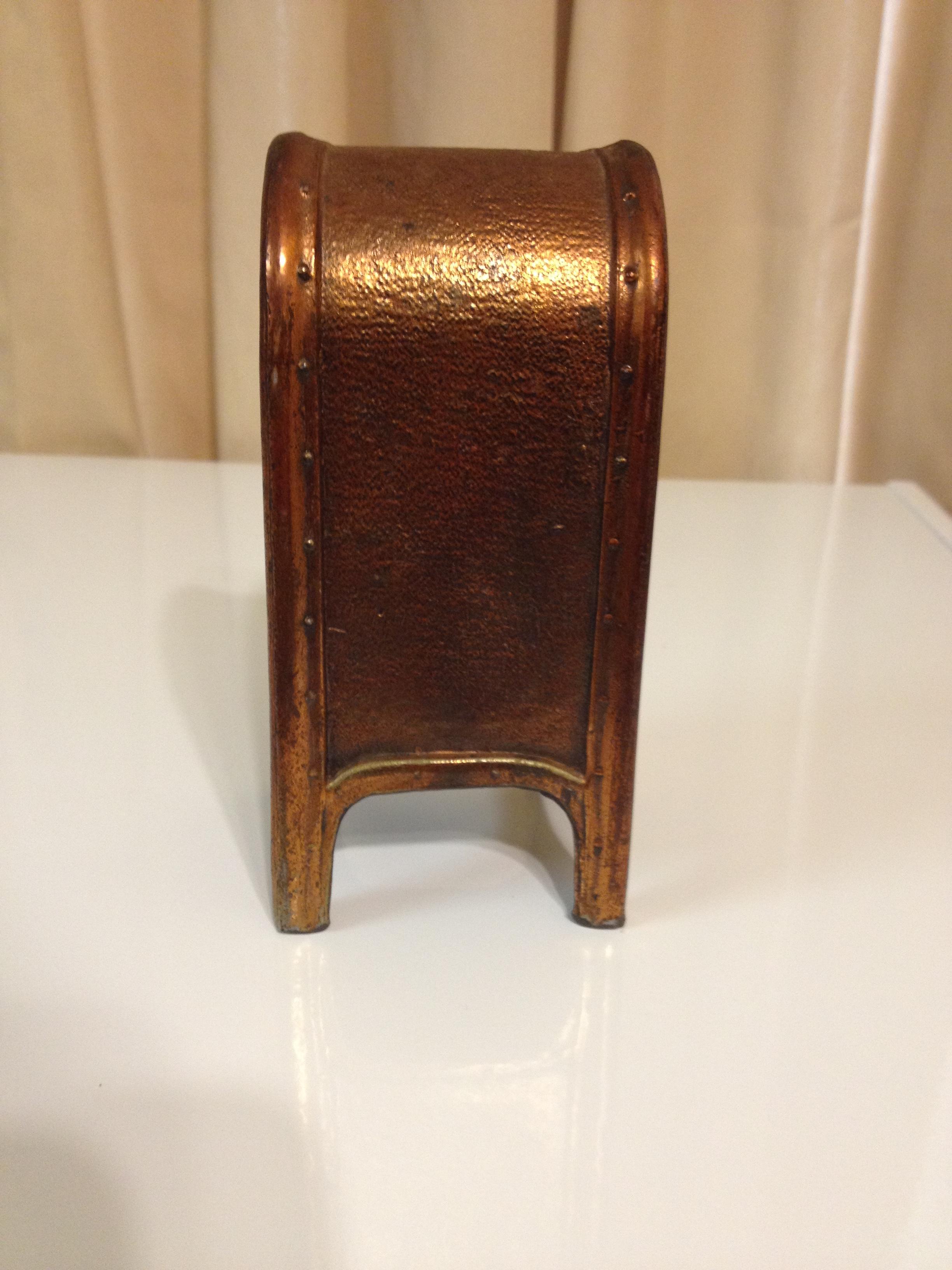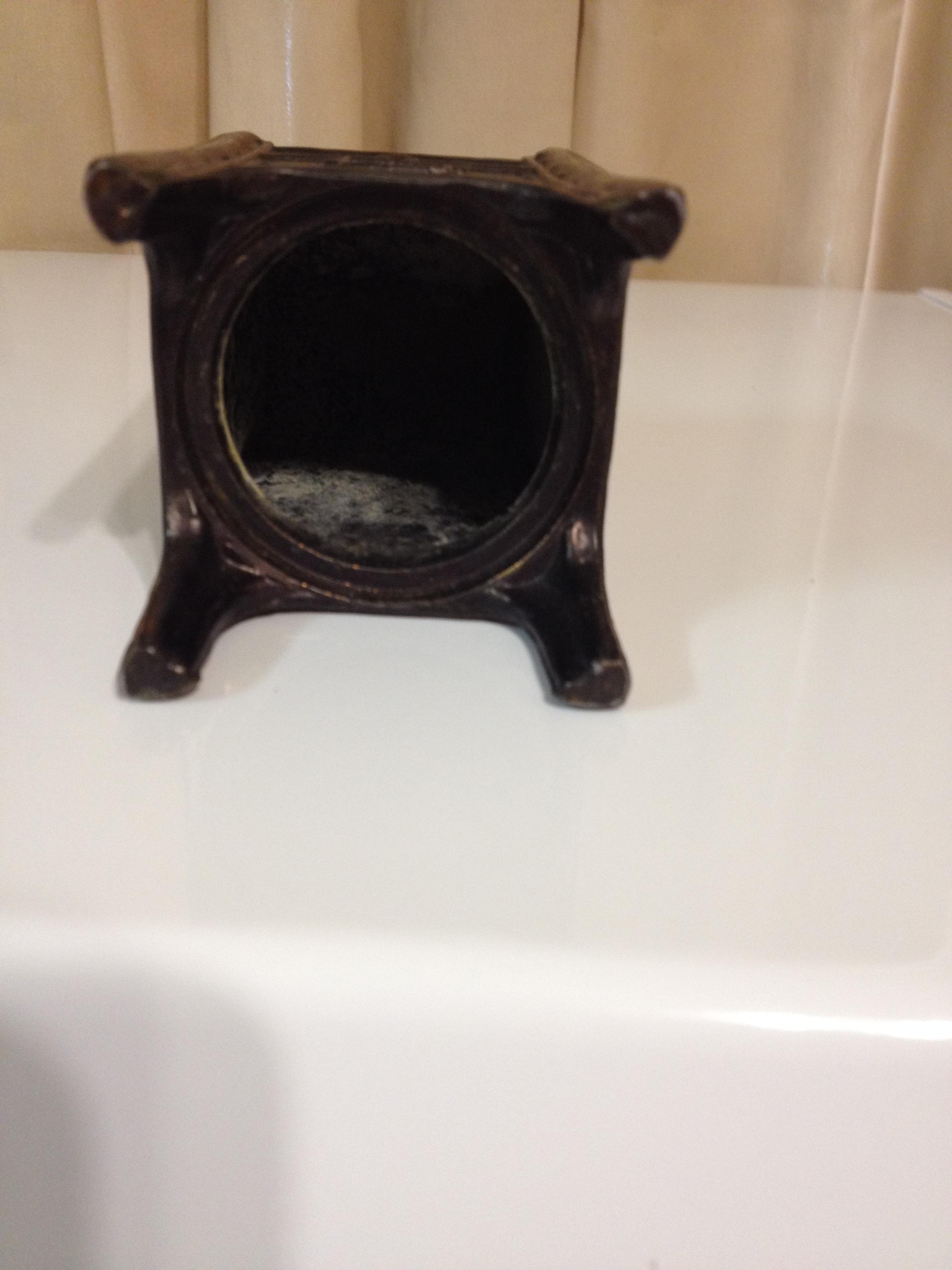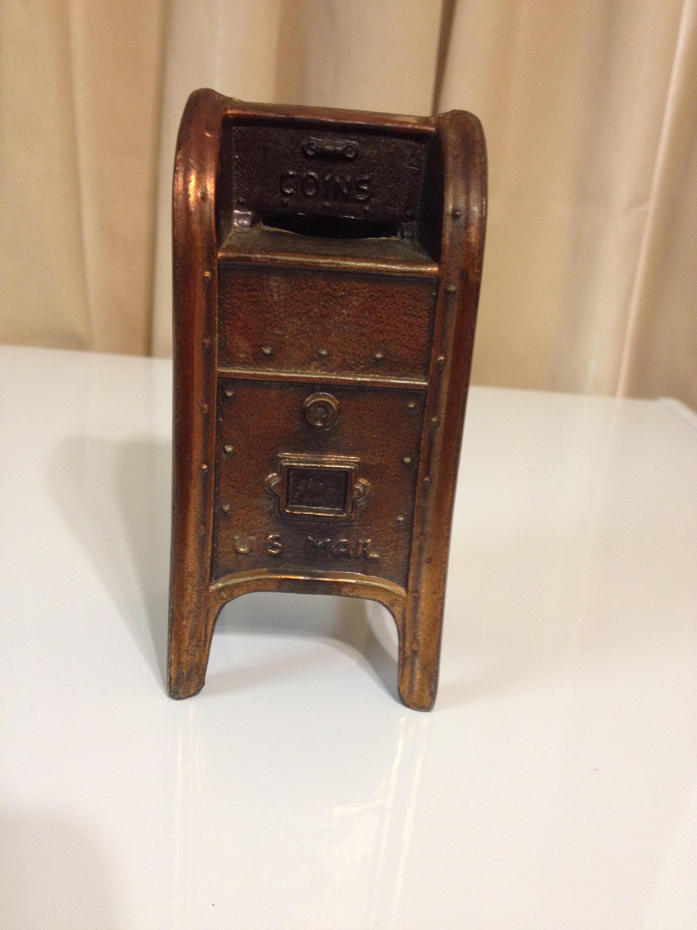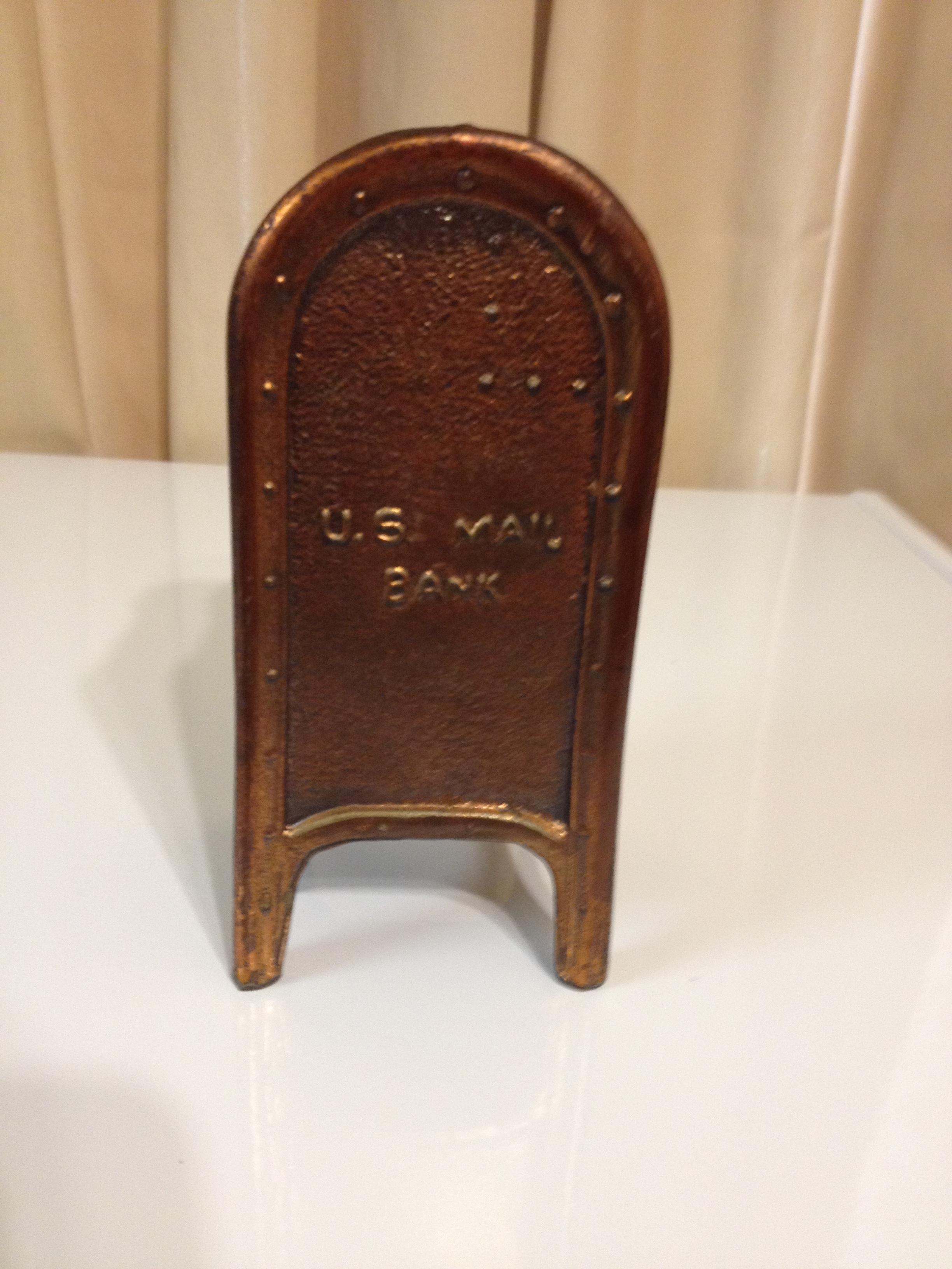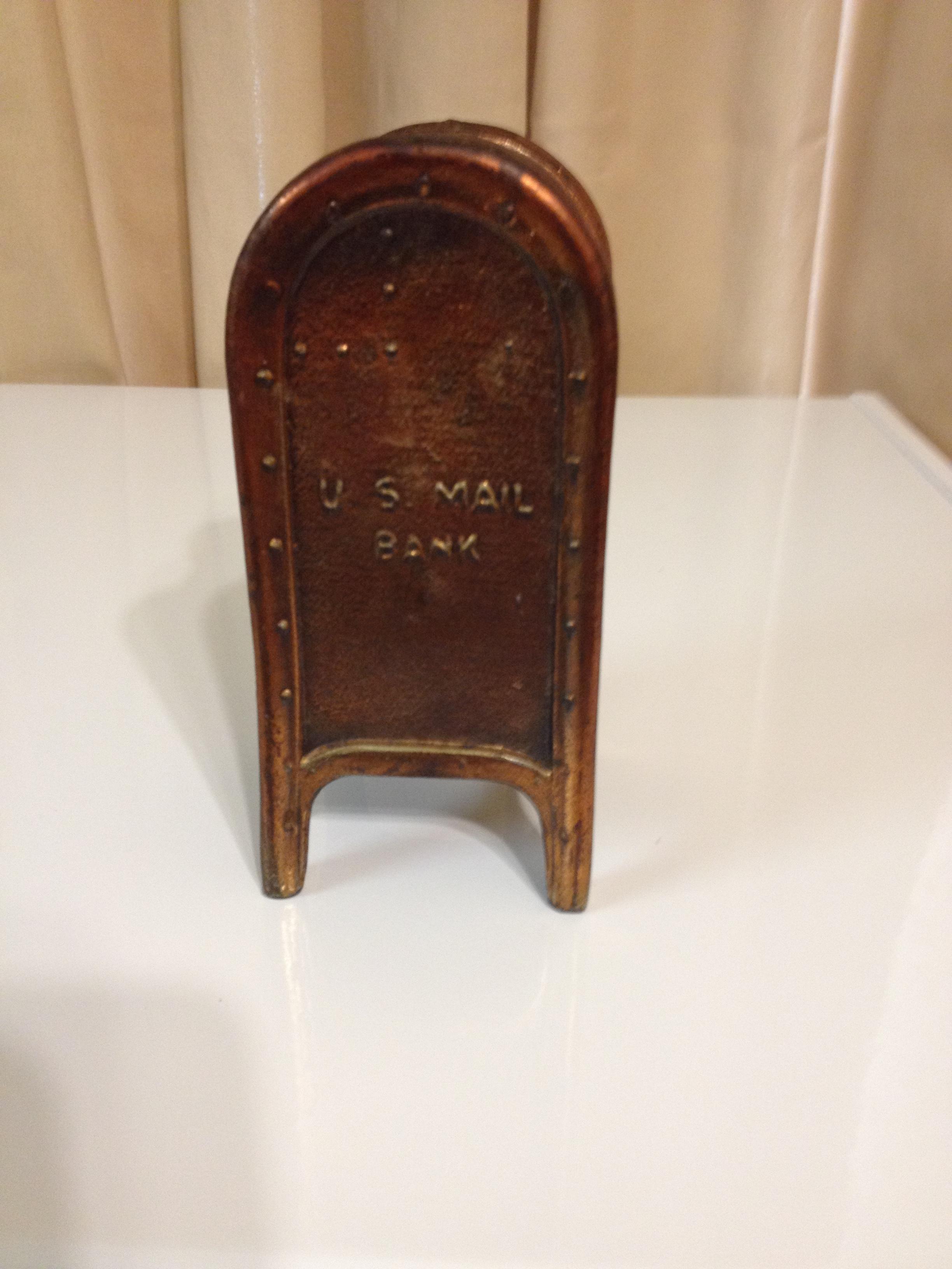 Bank is bronze in color. Do not know if it is cast iron or bronze. Does not have lock and key on bottom.