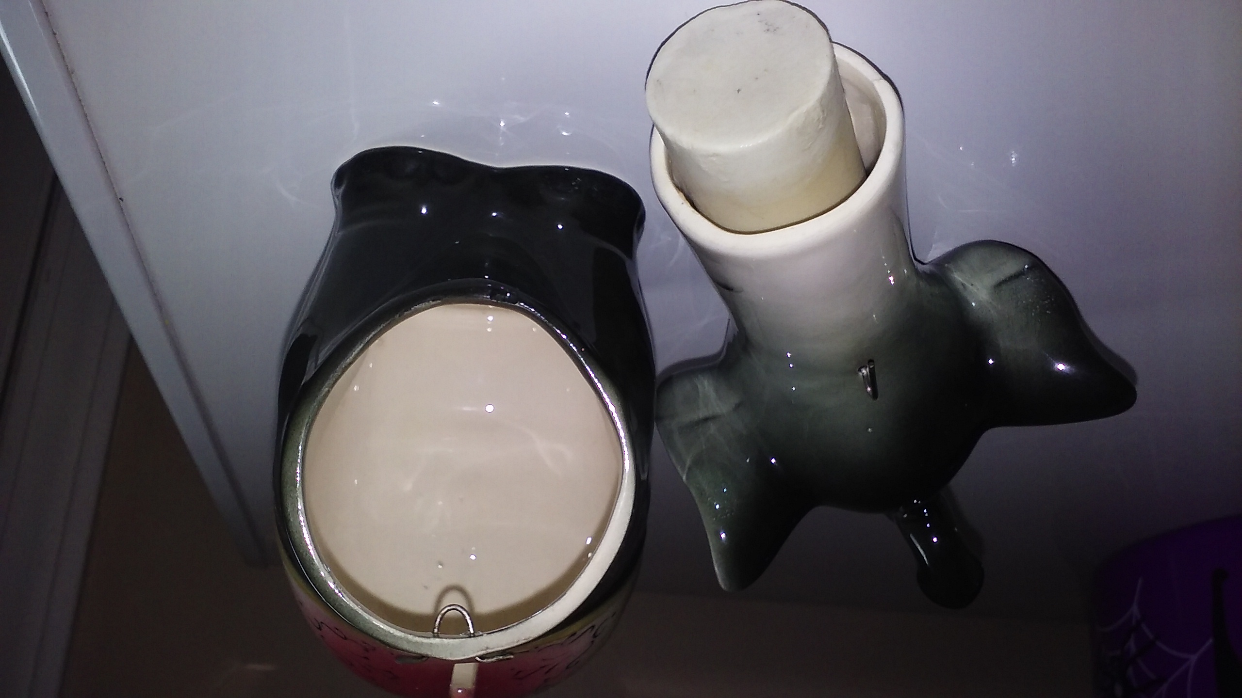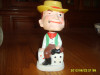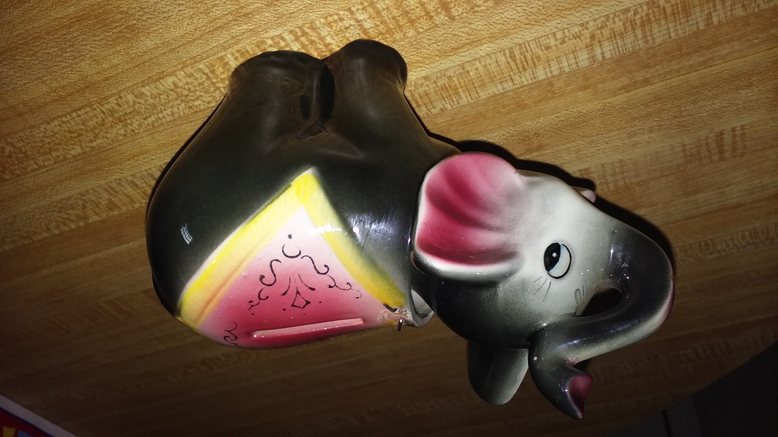 Gray & pink ceramic elephant piggy bank with detachable head (metal hook). It is in mint condition and belonged to my great grandmother, she's thinking 50's era. No markings. Weighs about 12 oz. and about 7" long, 5" tall.