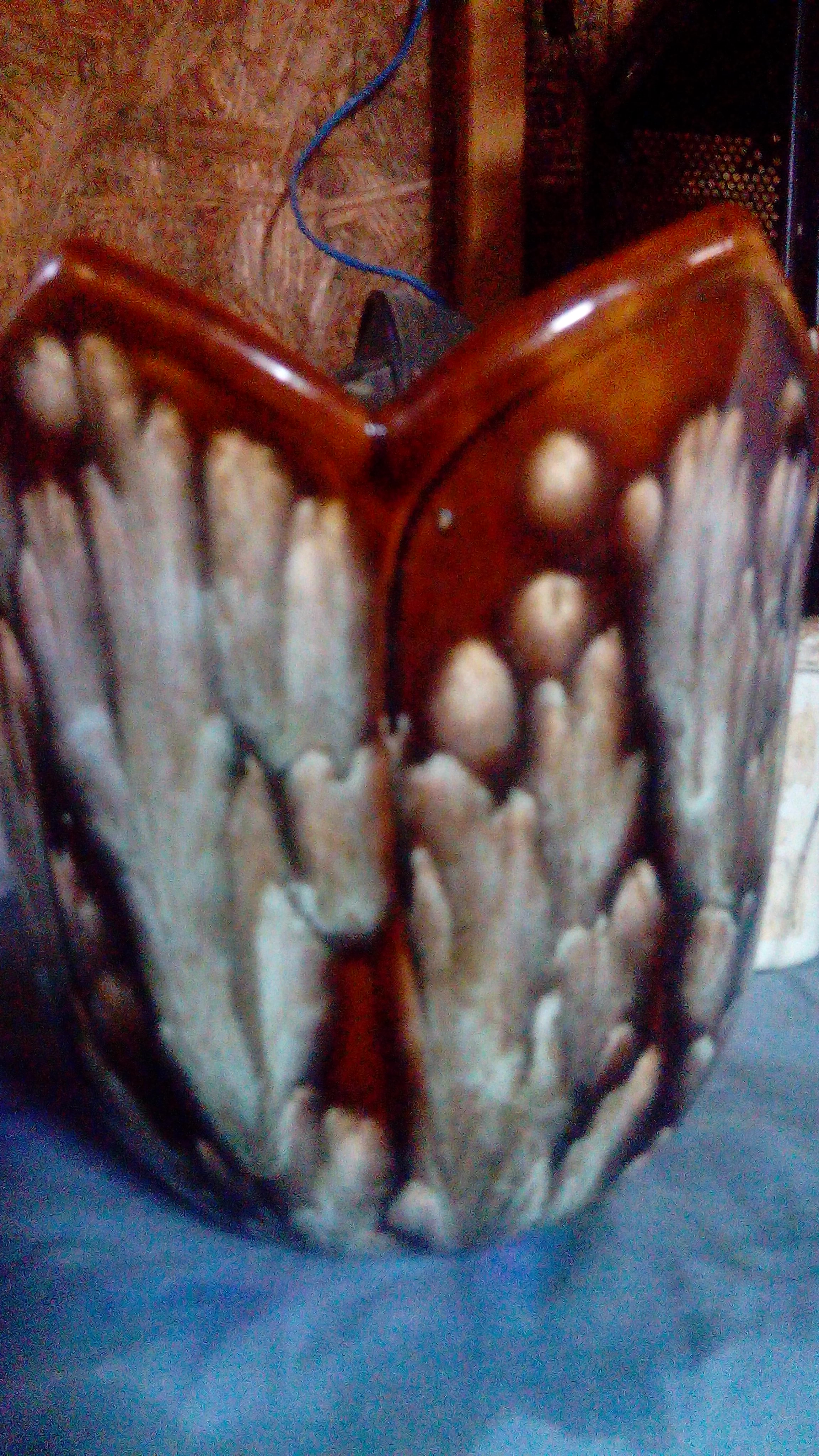 Vase is 7 in tall and 8 in wide phase engraving if the let f over either letter T or a cross.vase is shaped like a lily or a tulip maybe?