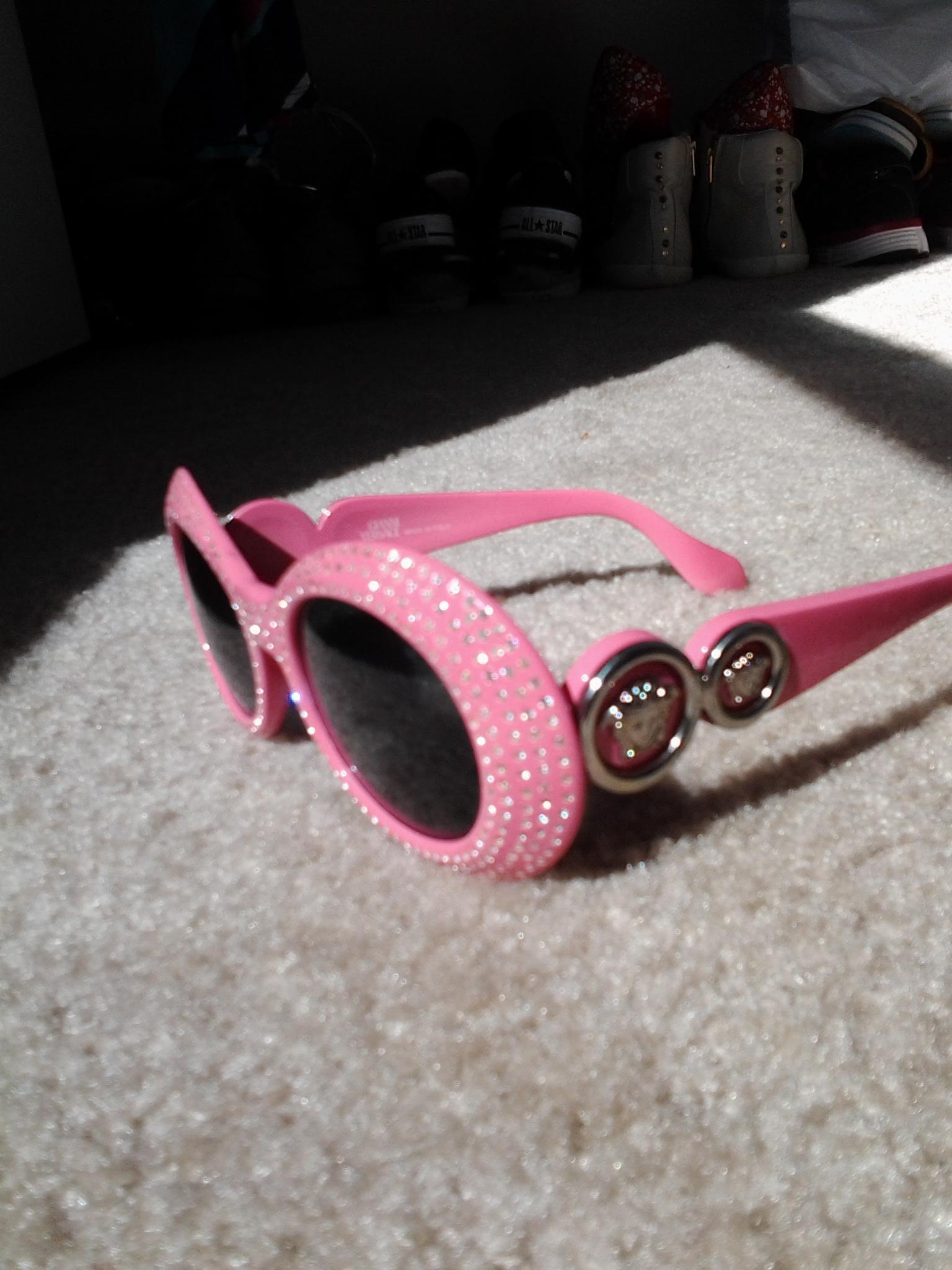 Pink Gianni Versace sunglasses with what appears to be cubic zirconia all around the lenses. Last picture might be blurry - it says MOD.418/F COL.930