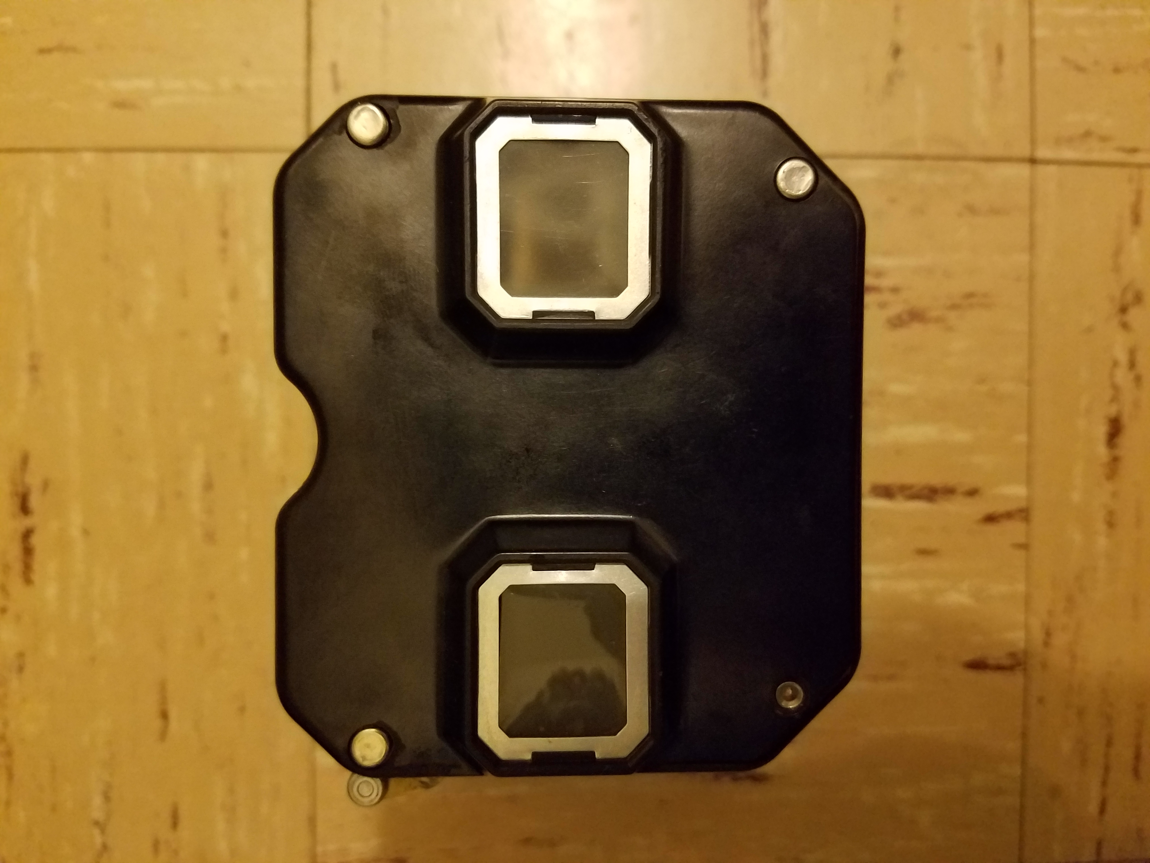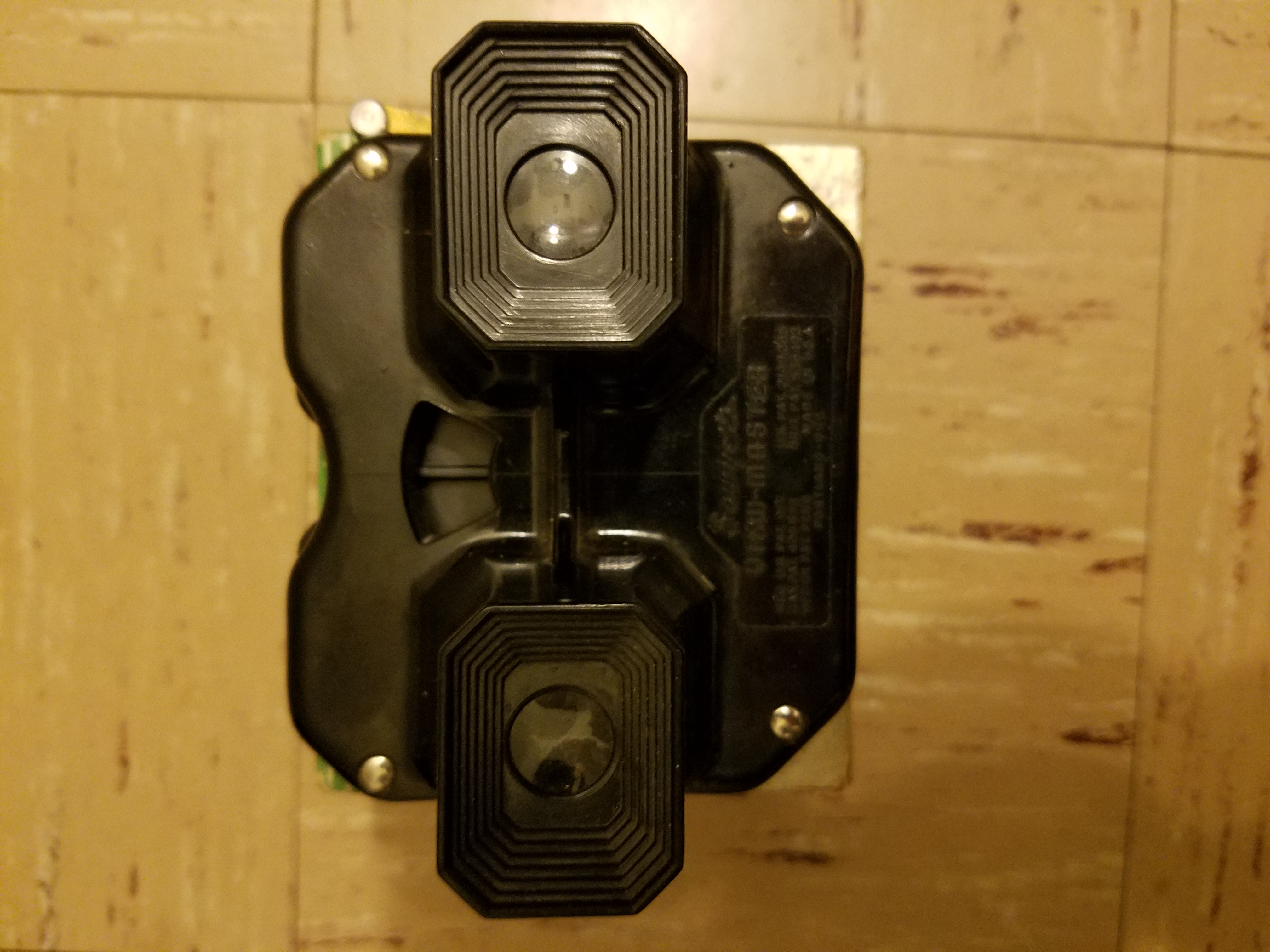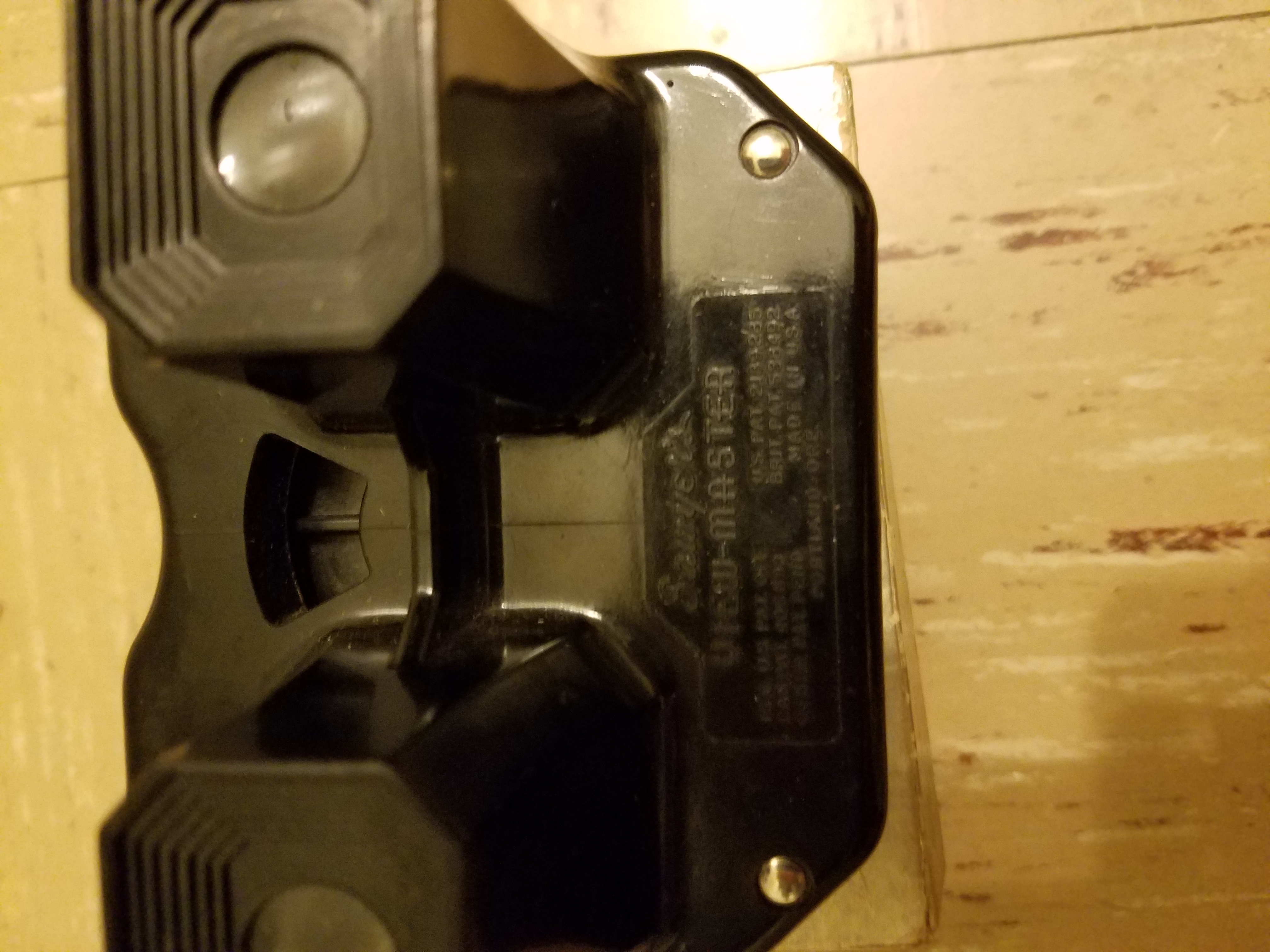 Black plastic viewmaster with silver metal around eye holes with a silver and gold colored lever.