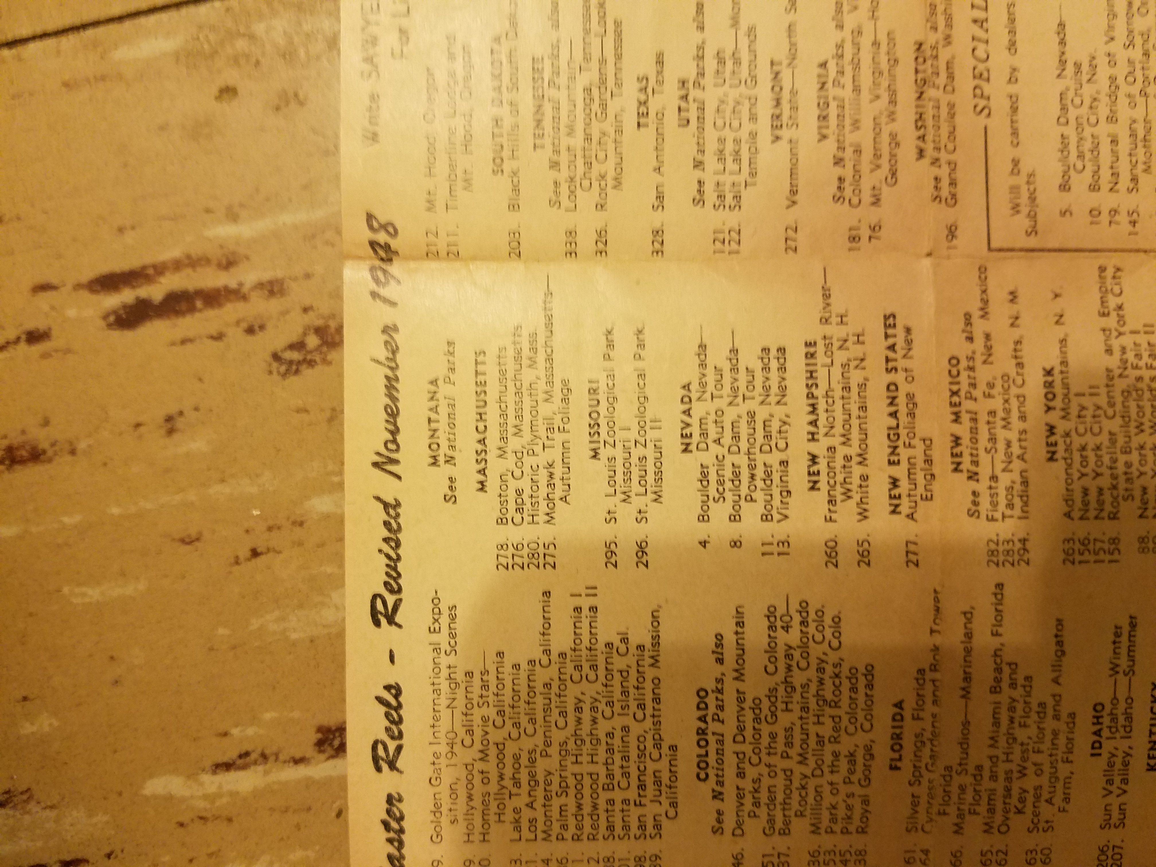 And a complete list of reels for reorder with this writing at the top...revised November 1948