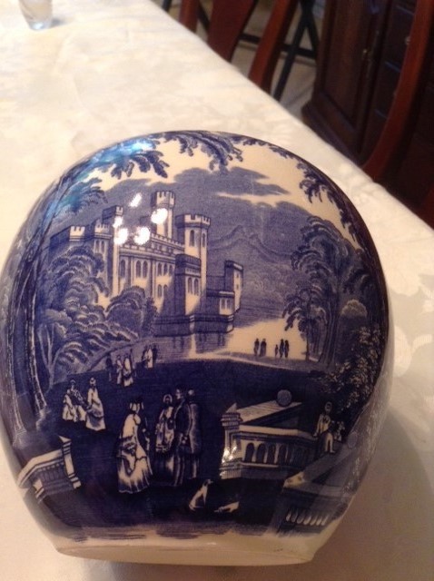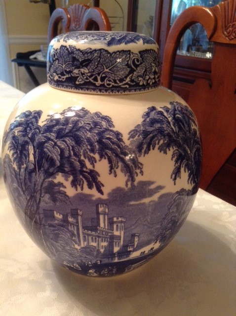 I purchased this Urn/mason jar (if that is what you call it) with lid 25 years ago for $45.00. It stands approximately 9.25 inches high with the lid on and approximately 8 inches in width. There is one very tiny chip in the rim and crazing (?) throughout which are barely visible without looking close up, but no obvious cracks from damage. Each side appears to have the same scene but one side looks as if it was not lined up properly when firing so makes it seem a little off. I would say that if not for the crazing and the tiny chip, this jar is in excellent condition for it's age. There is also a red roman numeral 2 etched in the bottom.
