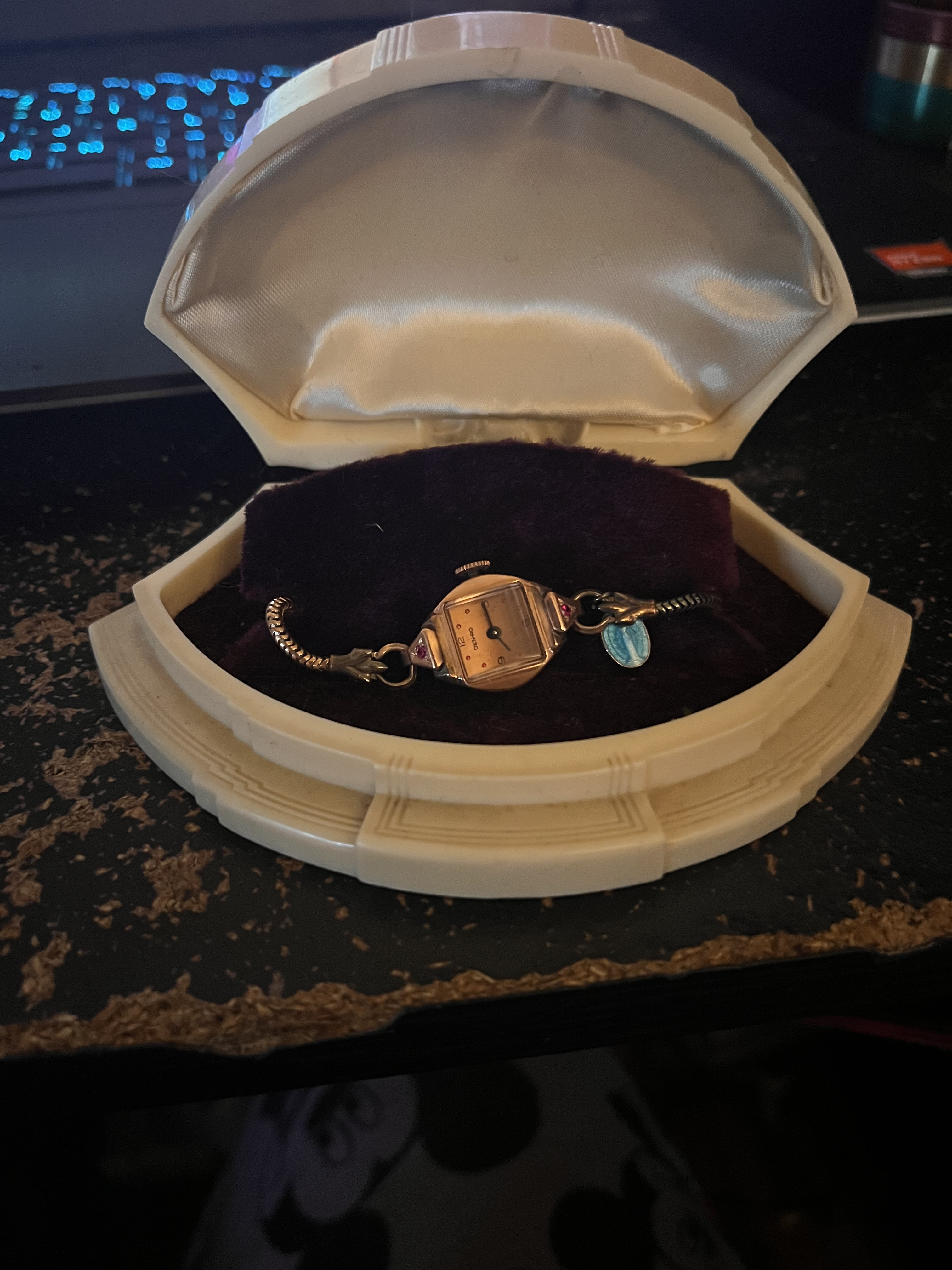 Vintage Watch. Dating to Mid-20th Century. Materials: Metal case, possibly gold or gold-plated, with a fabric or metal band. Estimated value: $150 – $300. Condition: Very Good. The market for vintage watches is currently experiencing moderate demand, with prices generally rising for well-maintained pieces.