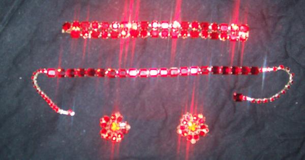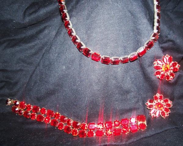 "WEISS" MARKED JEWELRY SET. RED RHINESTONE OR GLASS. ALL PRONG SET, ALL THREE PIECES ARE MARKED. EARRINGS AND BRACELET HAVE A MORE GOLDTONE BACKING, BUT THE NECKLACE HAS MORE OF A SILVERTONE BACKING. THE SET IN IN MAGNIFICENT CONDITION! VIRTUALLY NO WEAR, AND ALL PRONGS INTACT, NO CHIPPED STONES. HAVE MANY OTHER SETS, ALONG WITH BROOCHES, PINS, ETC. LOOKING TO FIND VALUES ON ALL OF THEM AS WELL AS SELLING THEM TO THE RIGHT BUYER...HAVE DONE A LOT OF REASEARCH ON MY OWN, BUT WOULD REALLY LIKE TO HAVE A SECOND OPINION OR JUDGEMENT OF SORTS; TO HELP CONFIRM MY OWN FINDINGS...THANK YOU SO MUCH!!!!!