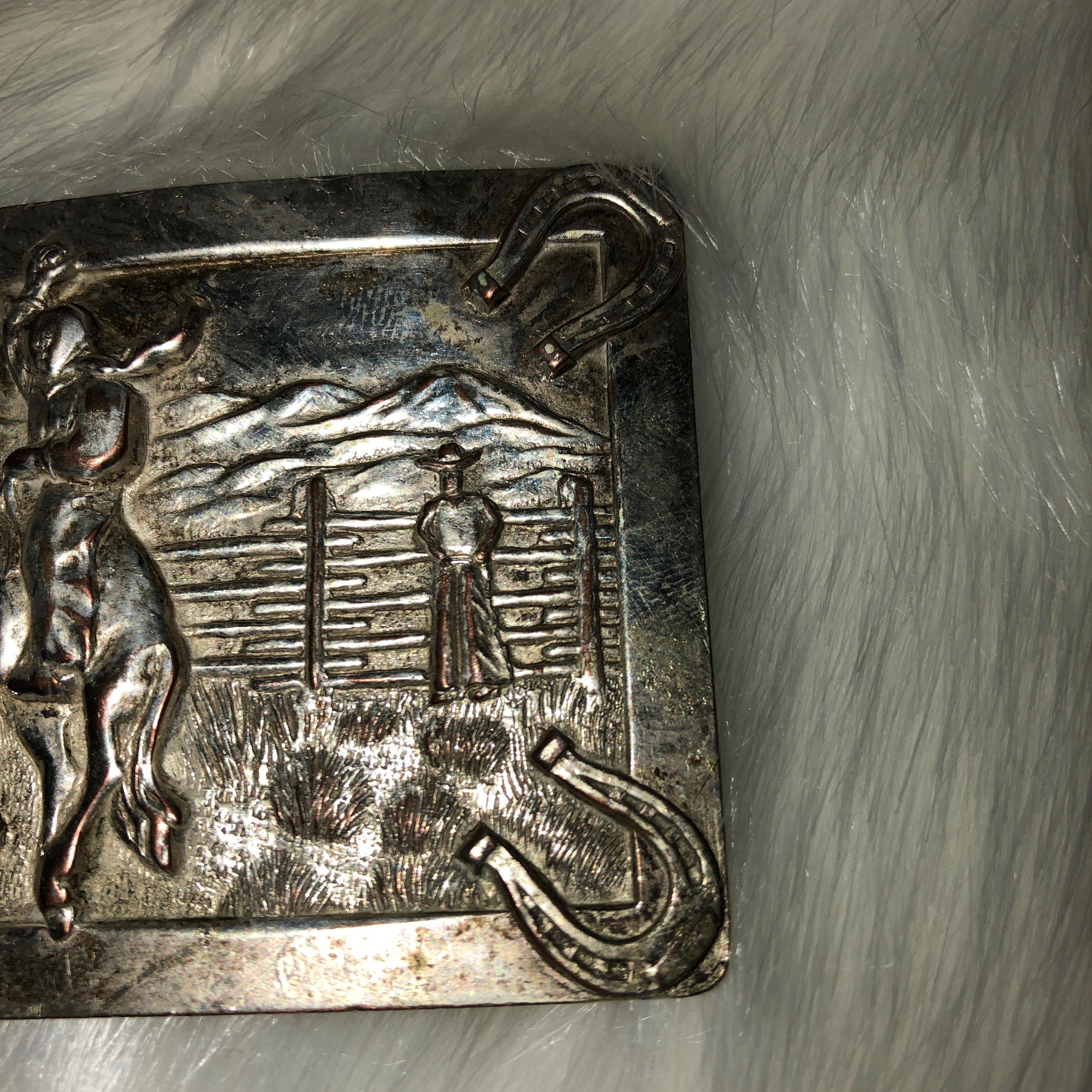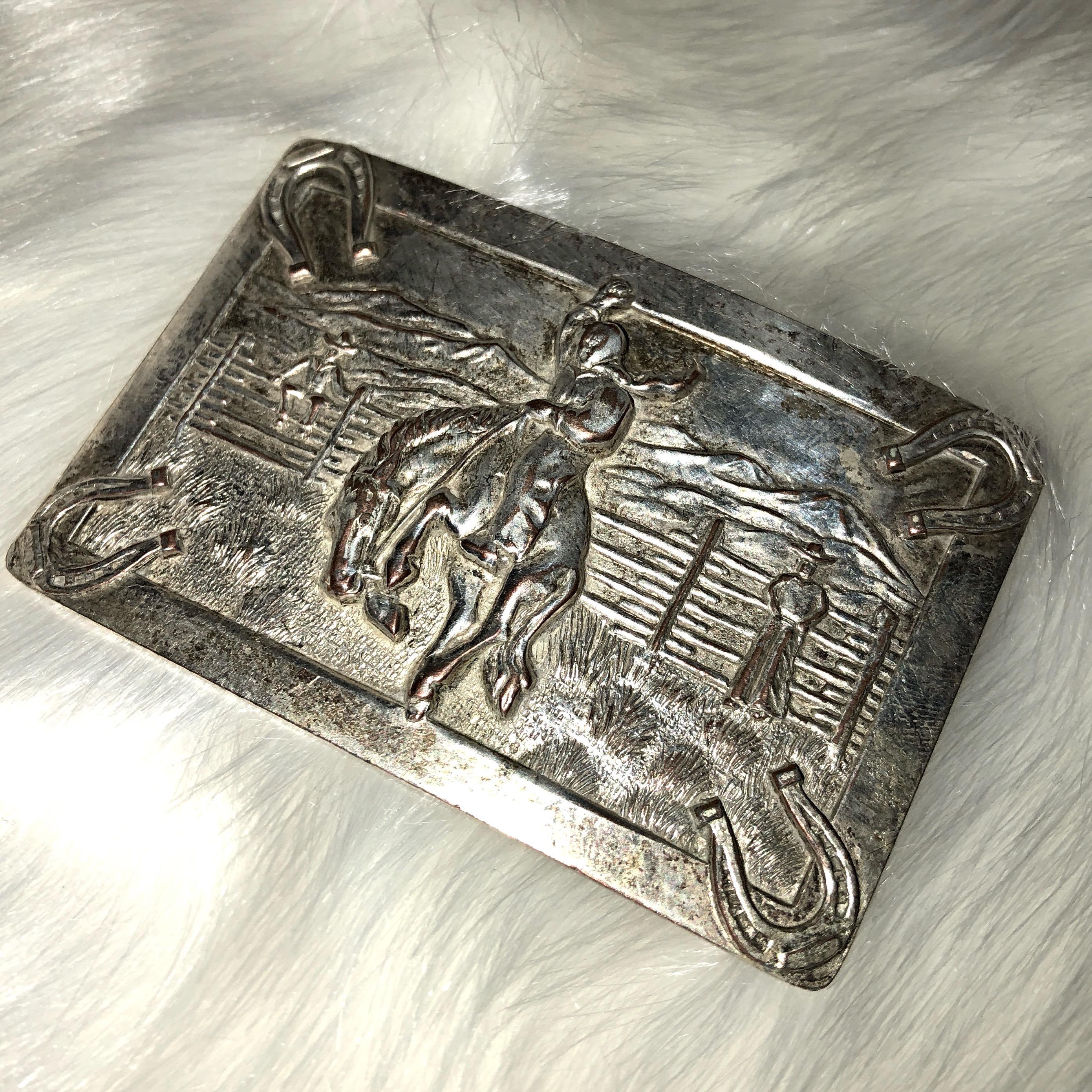 Belt buckle with bucking horse and cowboys on a fnece with hrose shoes on the corners. size 2" tall by 3 in wide. It is not sterling silver but light weight like tin material.