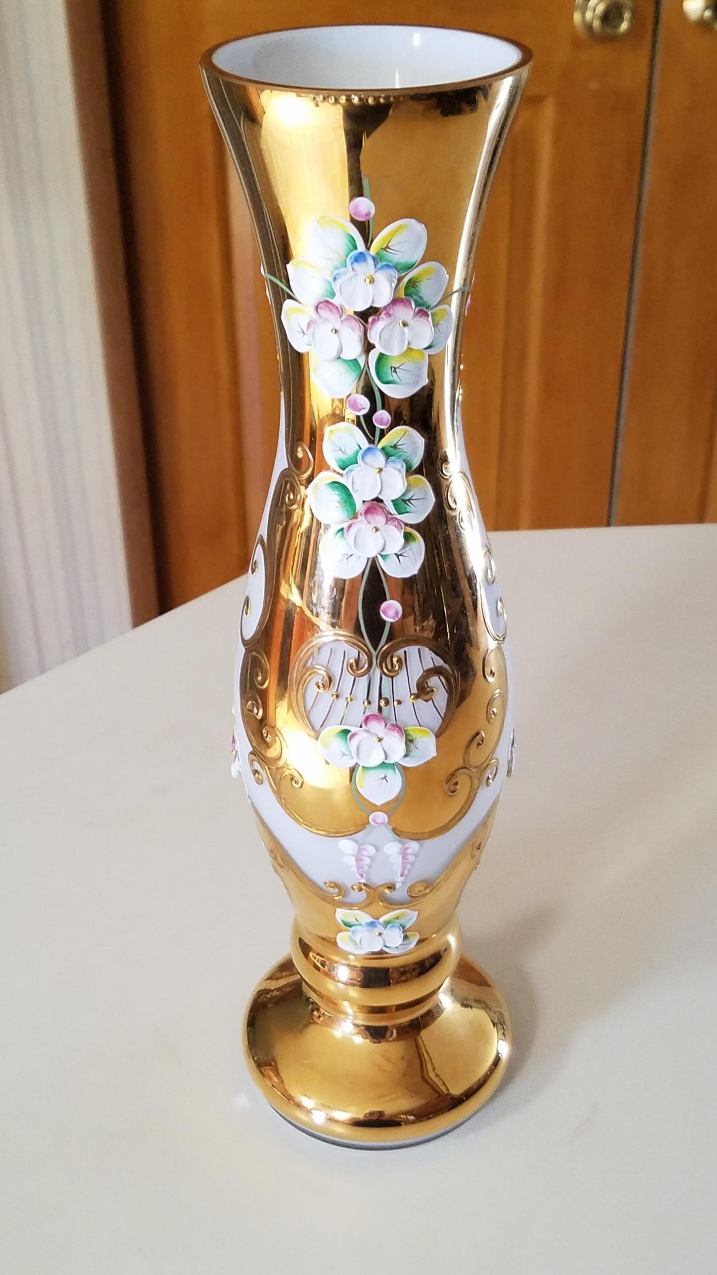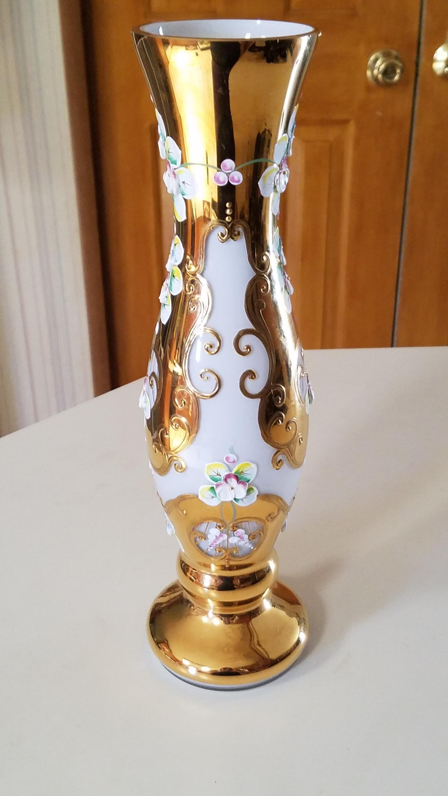 Beautiful vase I found at a local antique shop that has no markings. It appears to be milk glass with heavy gold overlay. The flowers feel porcelain. They are raised and painted. Thanks for the help!