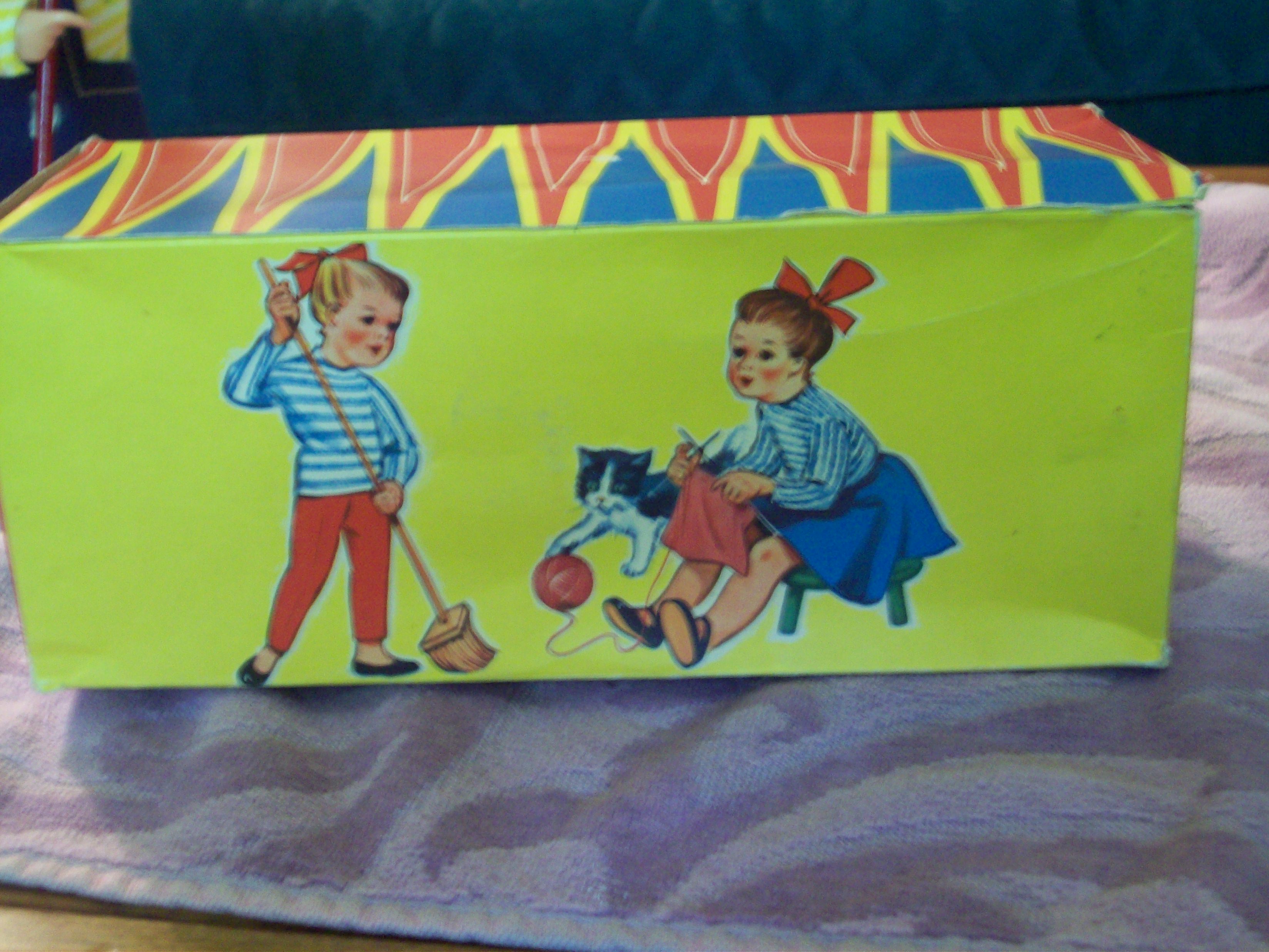 I have a vintage wind up toy of a young girl wearing a red polka dot bandanna and holding a red, white and blue broom. She is wearing blue overalls, yellow striped blouse and red shoes.The box is in excellent condition, but the item is not titled. The only information on the box beside playing children is the information "527 D.B.G.M. Made in Japan". I am curious what the initials represent, if this toy is titled and the approximate vallue.