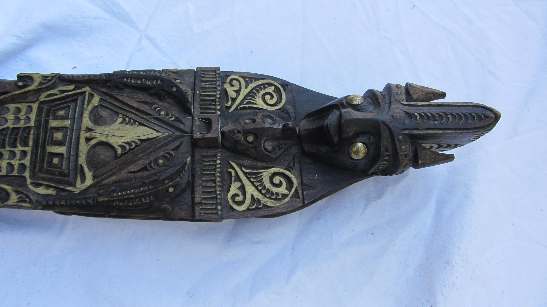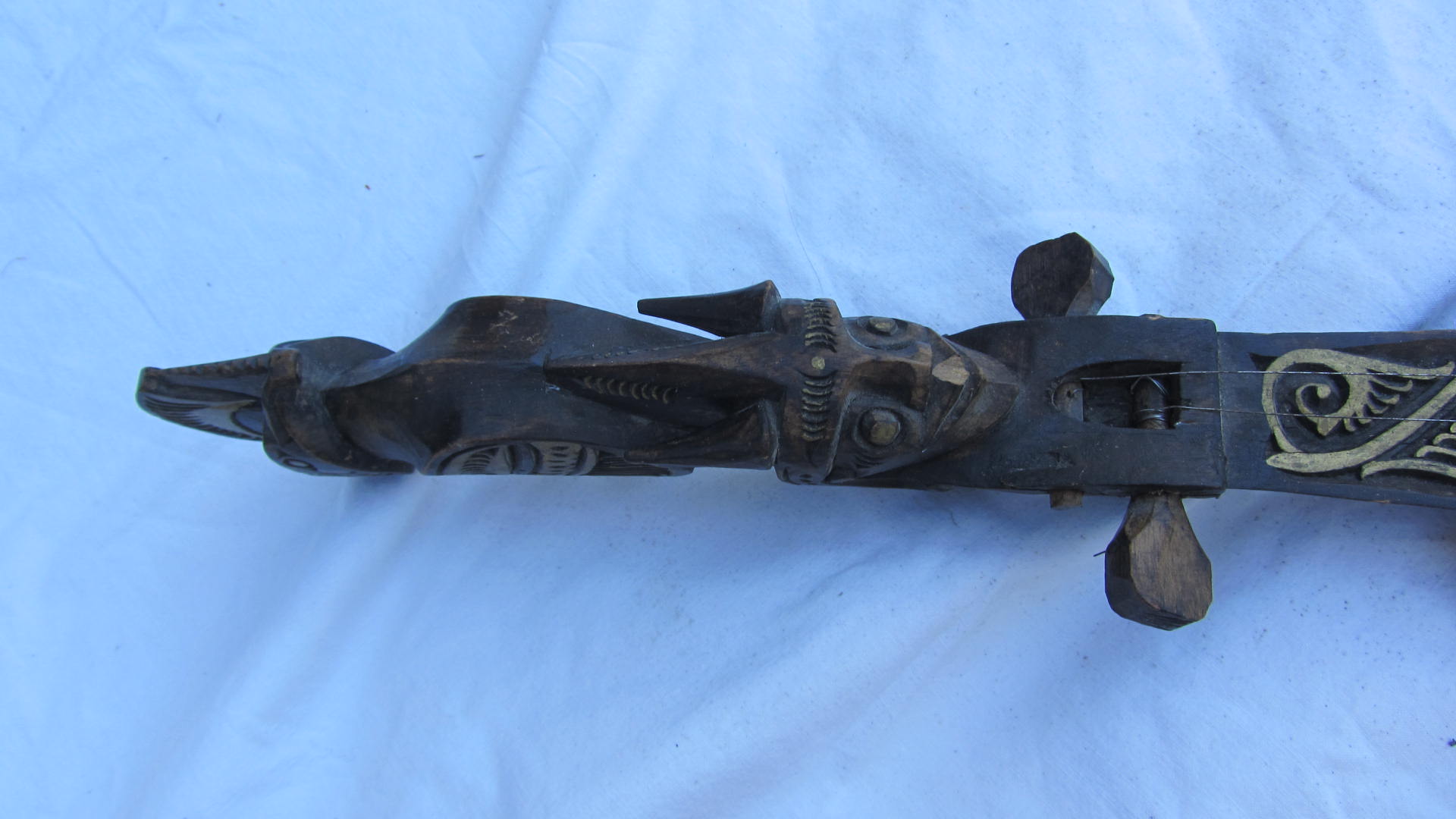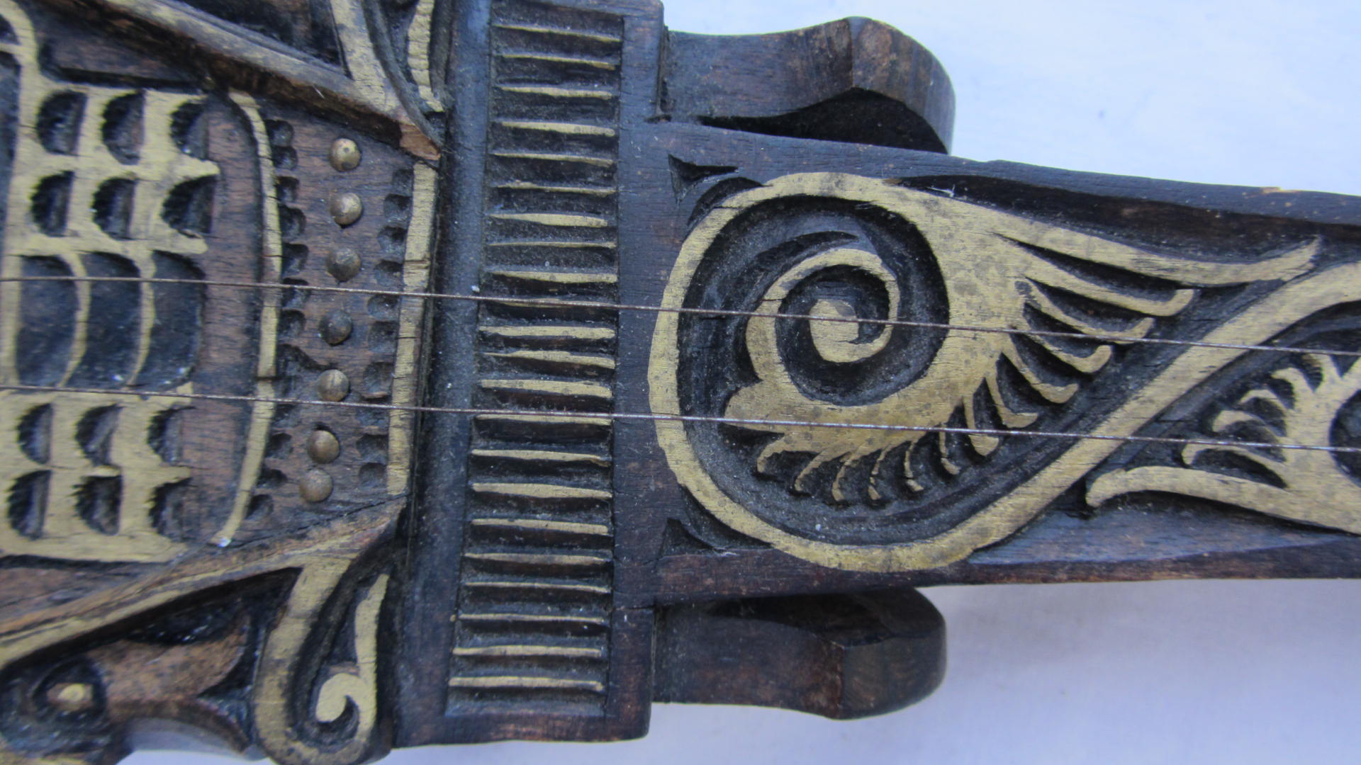 a wooden carved insturment with 2 strings, it appears to have been hand carved and is hollow with a hole on the bottom.