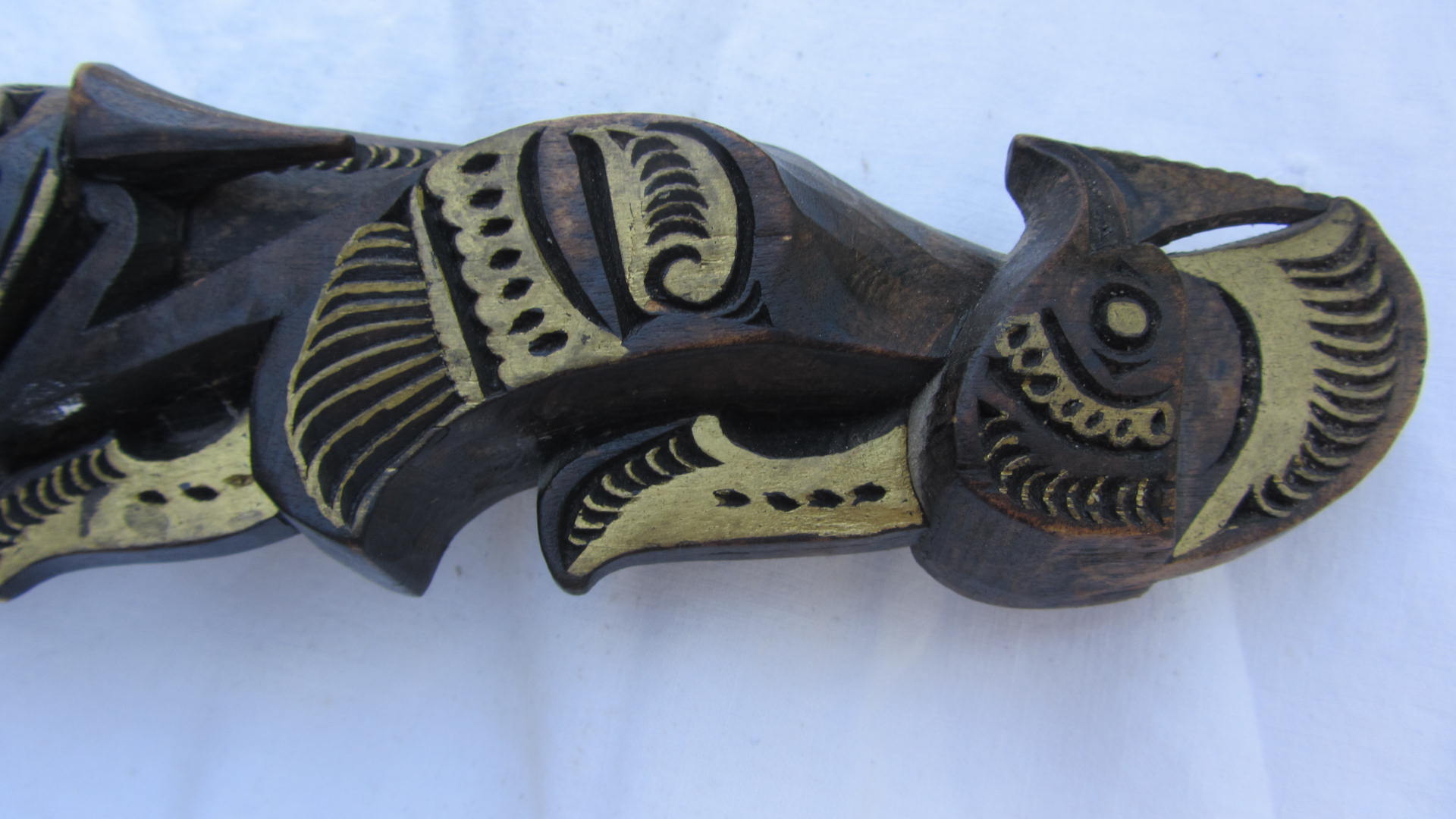 its has 3 faces and a bird on one end that can be seen from the front and on both sides, it also has a lizard on each side'