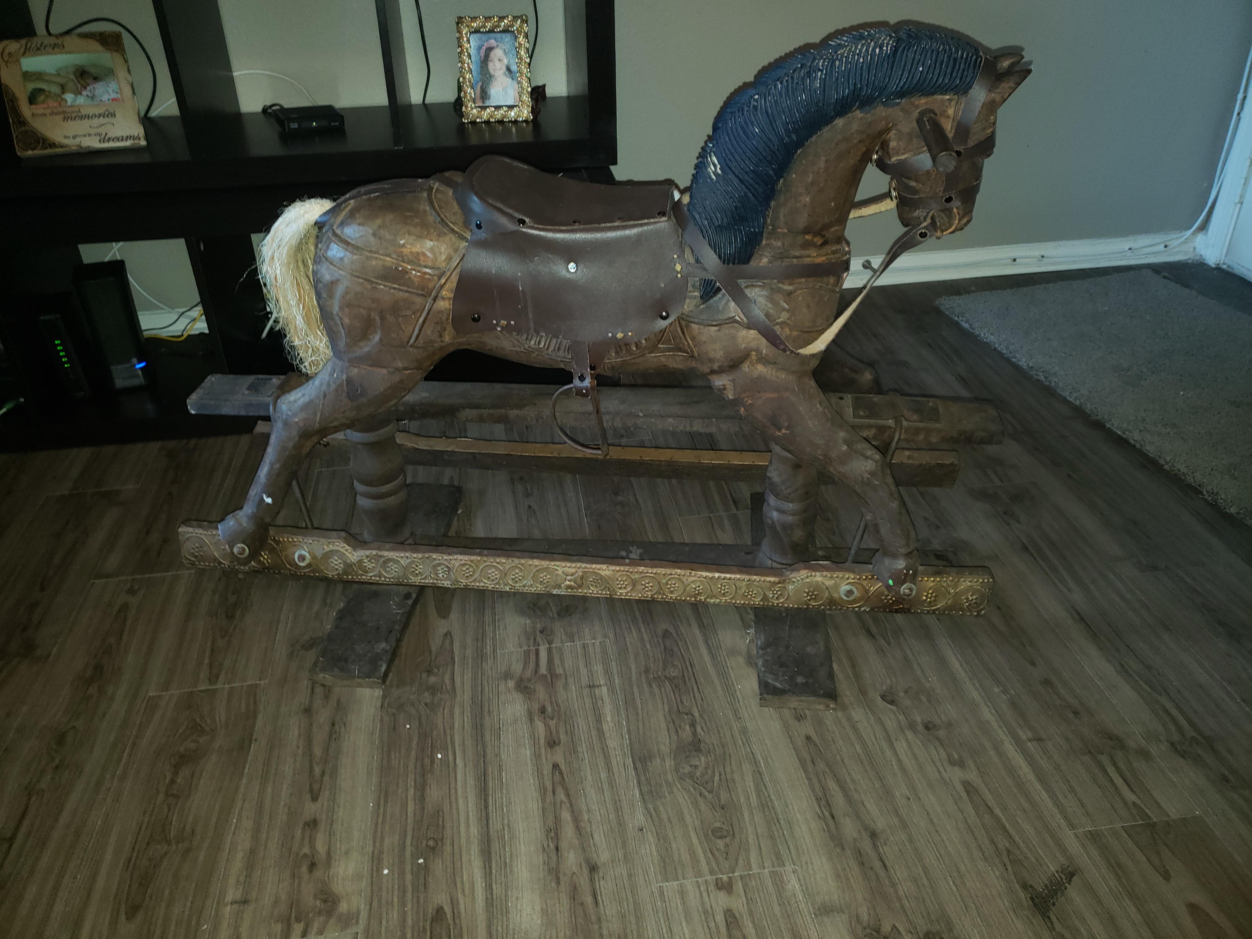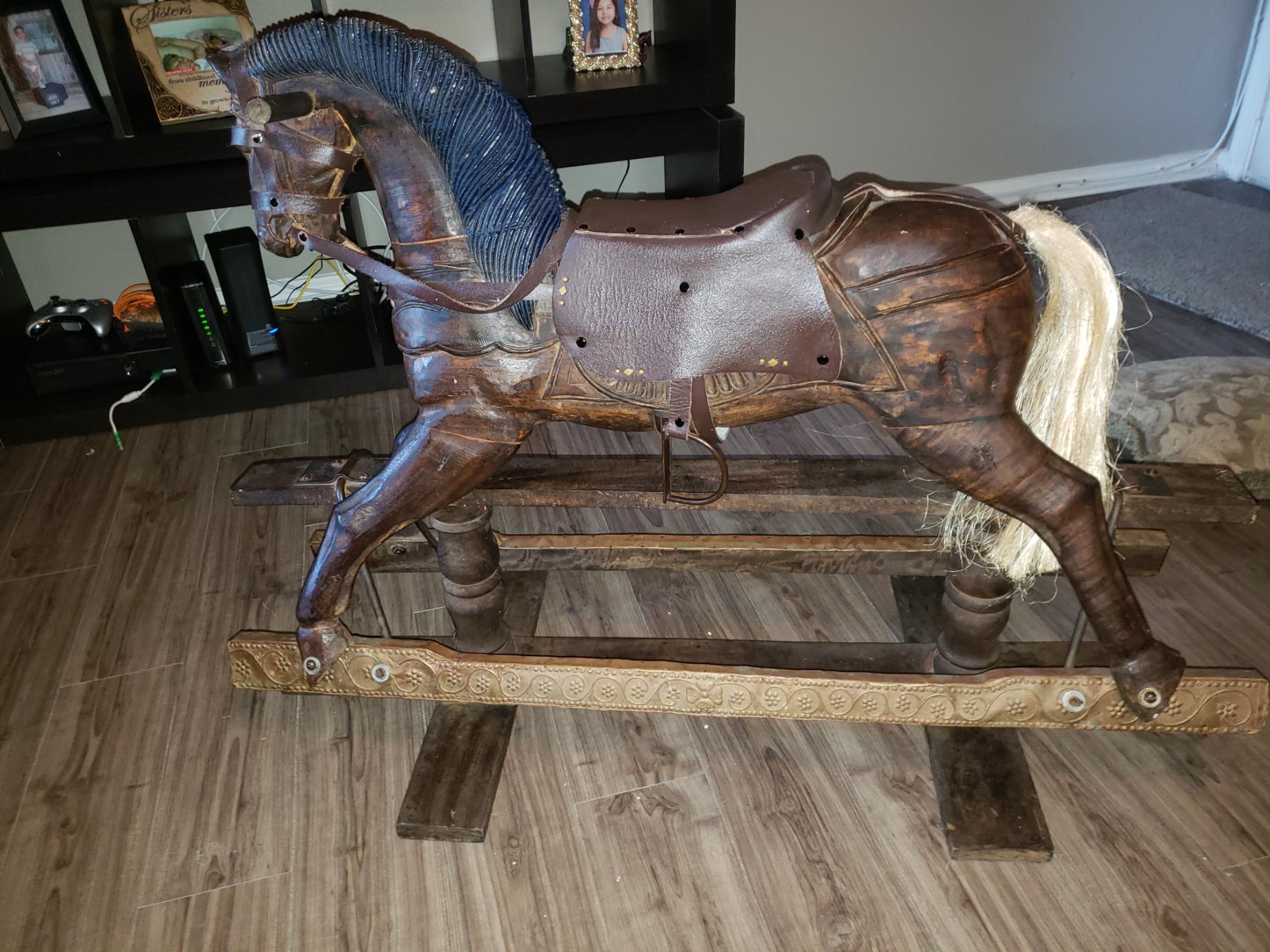 Wooden carved horse glider with white tail