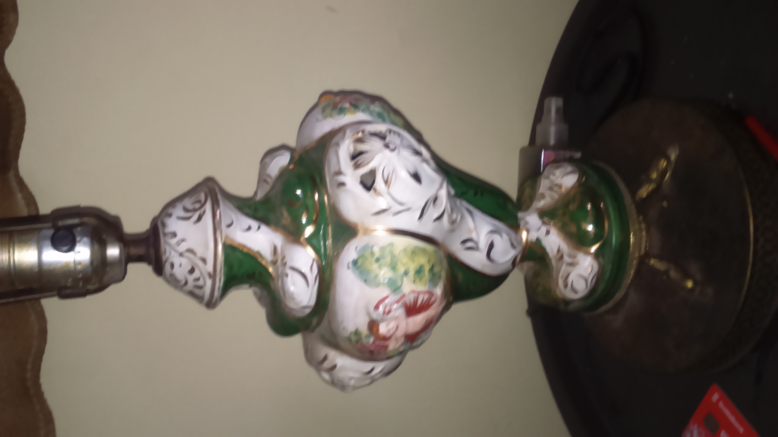 I was given a capimonte italian porcelain table lamp. I was told it was brought back after World War ll. It's vibrant green with white, gold, and a smidgen of rose colour. It also has cherubs in the design. It does not have the original lampshade on it, but it is in good and otherwise working condition.