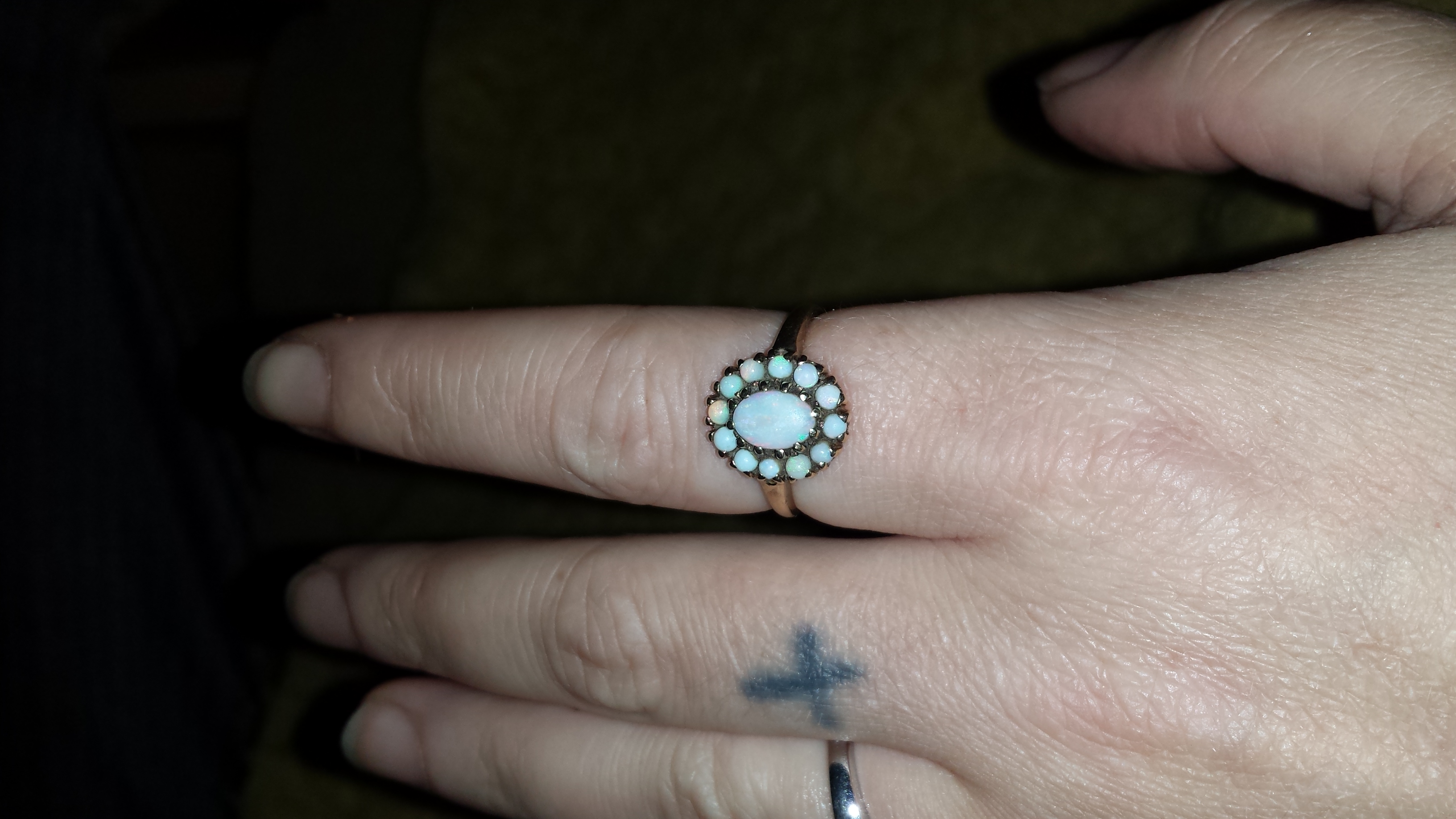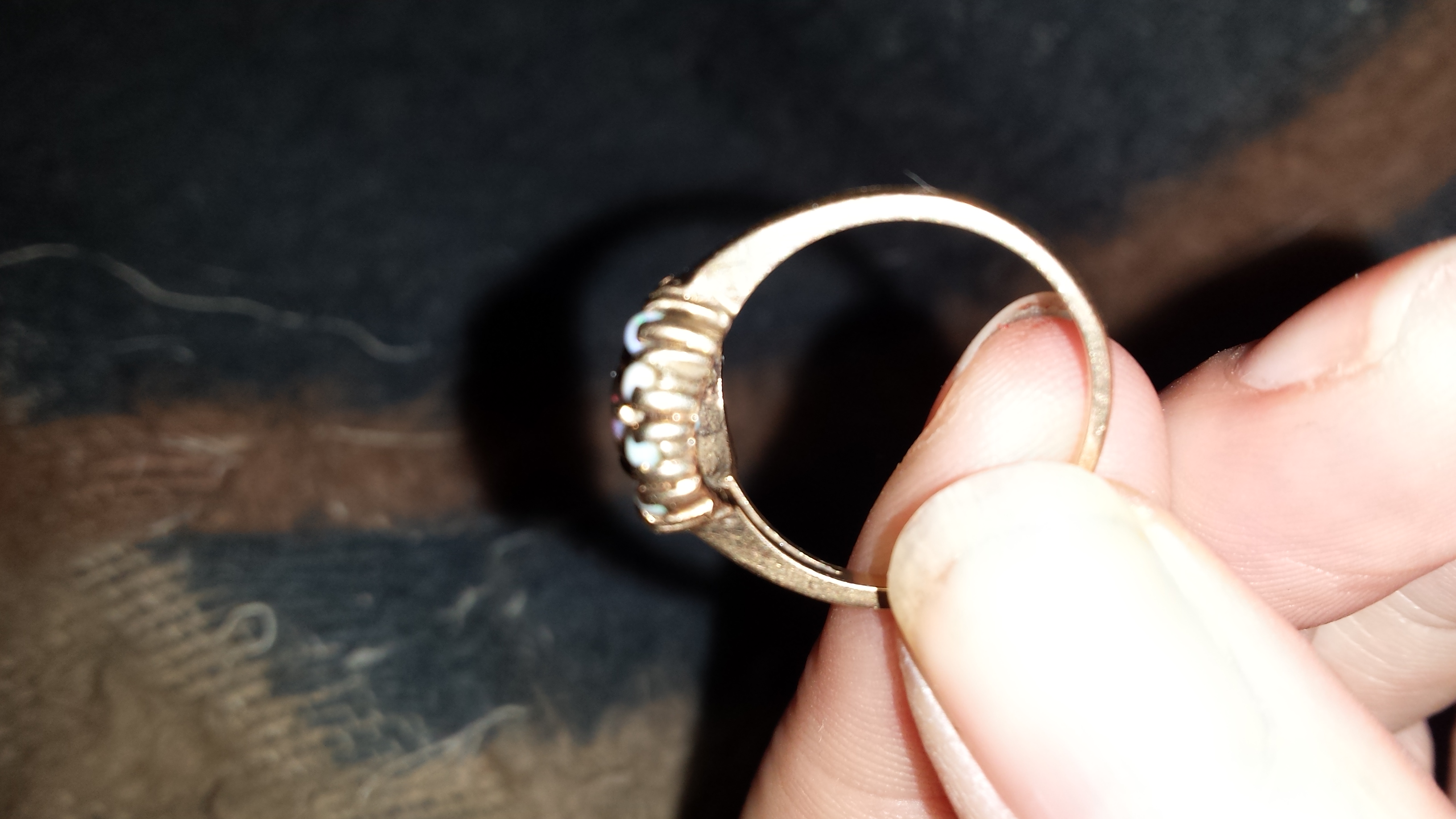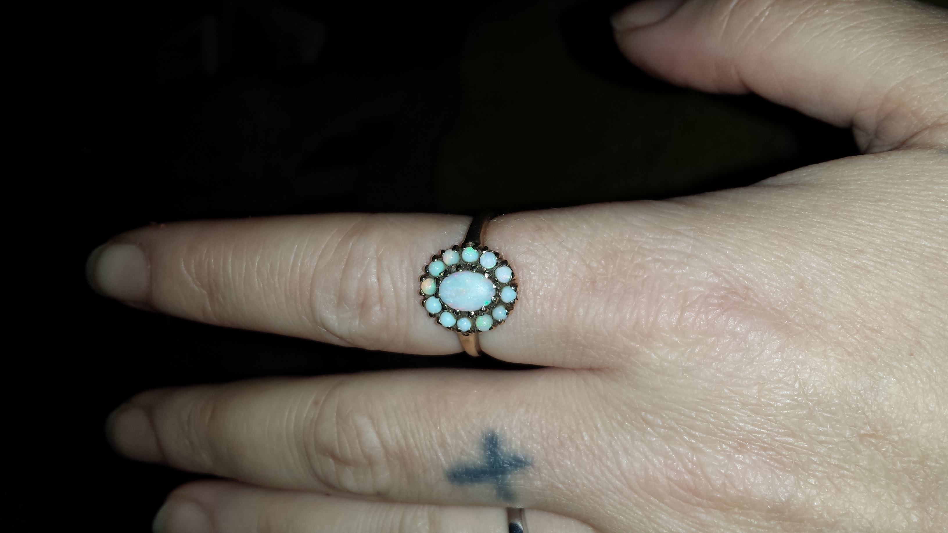 This is a piece of jewelry made by the shiman company of Newark Nj. Has ESEMCO etched on the I side of the band and the opposite on inside of the band is 3 letters I believe etched but I could not make them out possibly the gold karat (example 18,12, 10 ). There are 12 sall opals surrounding the big center opal.