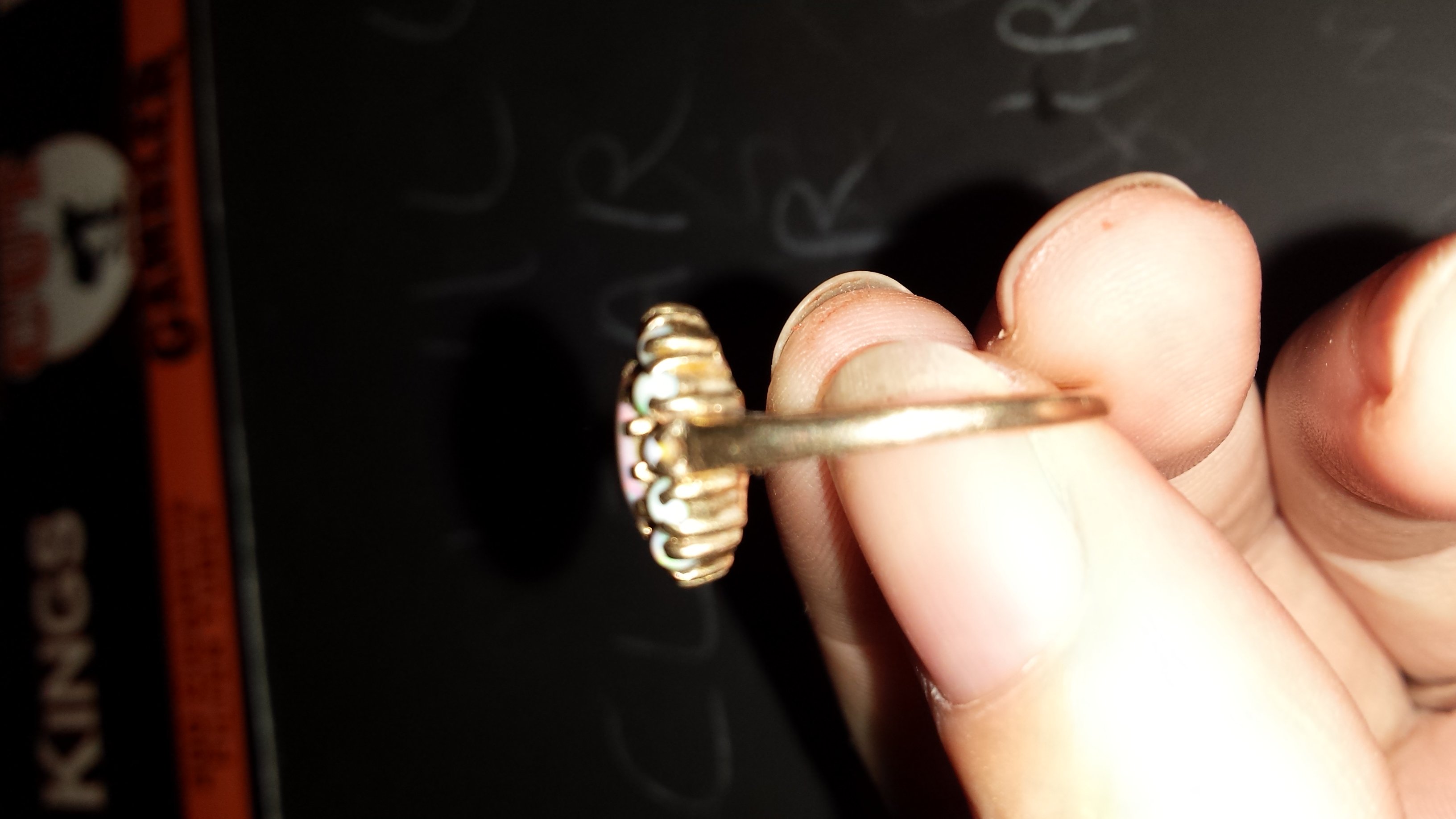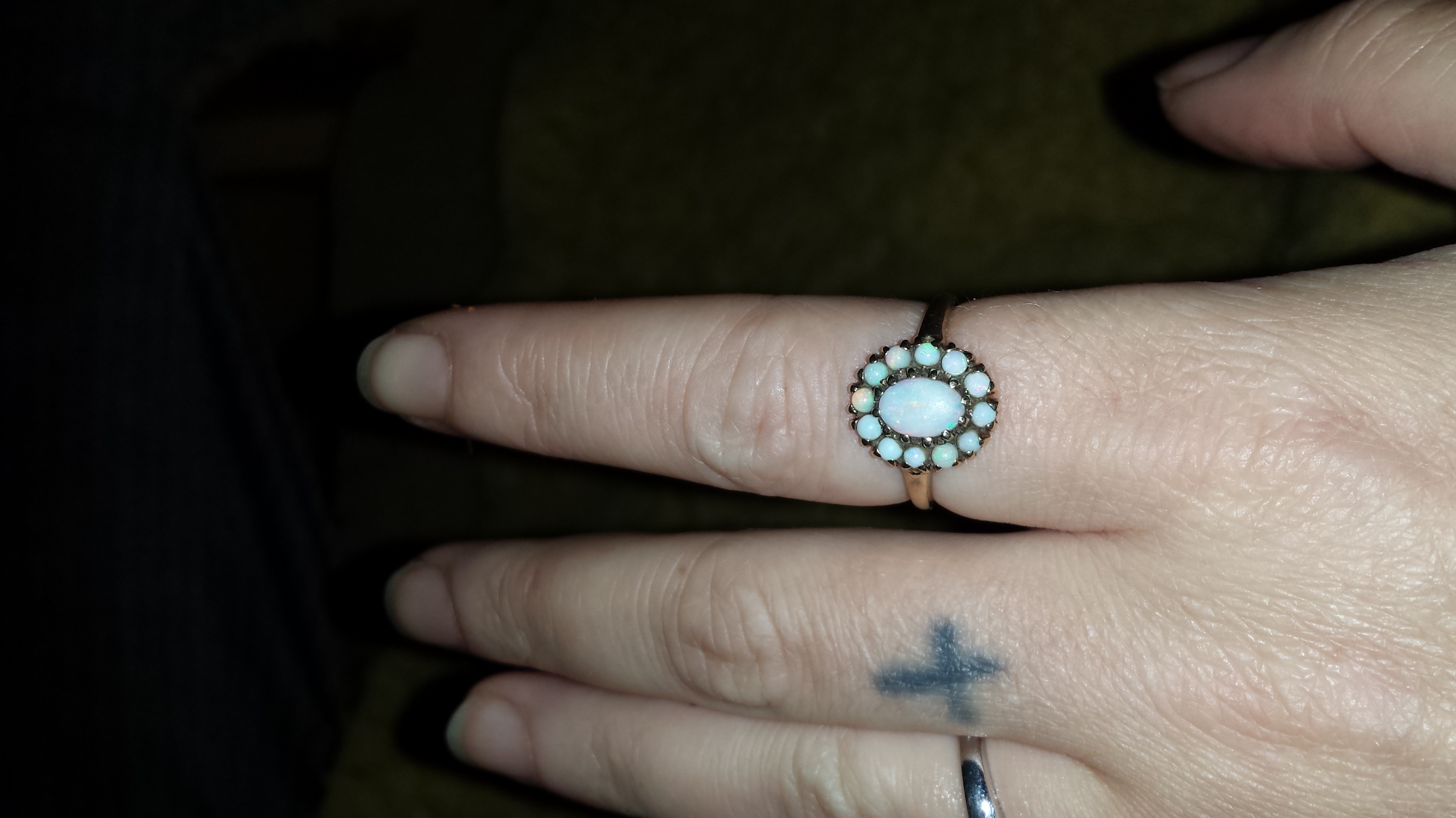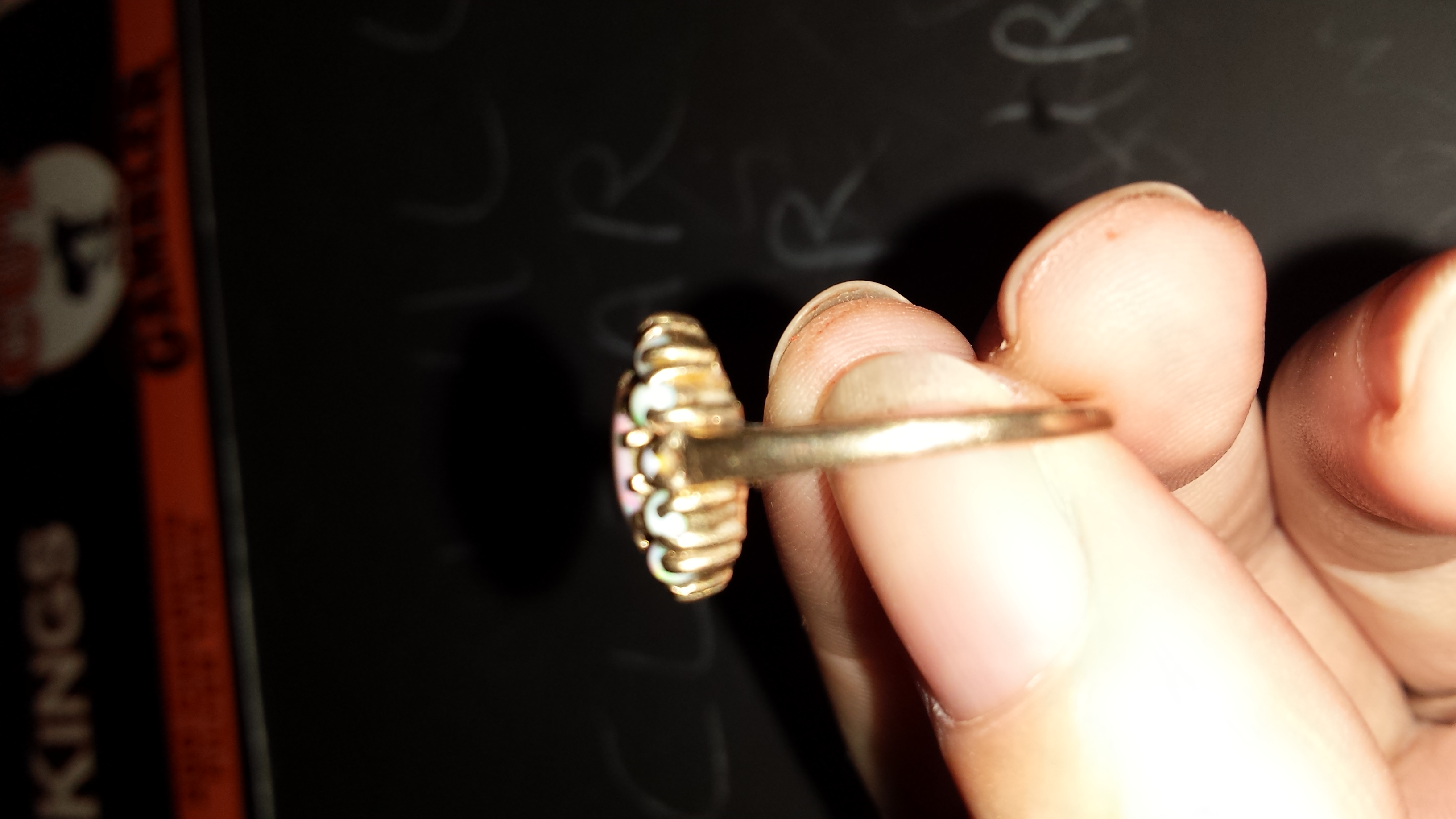 This is a piece of jewelry made by the shiman company of Newark Nj. Has ESEMCO etched on the I side of the band and the opposite on inside of the band is 3 letters I believe etched but I could not make them out possibly the gold karat (example 18,12, 10 ). There are 12 sall opals surrounding the big center opal.