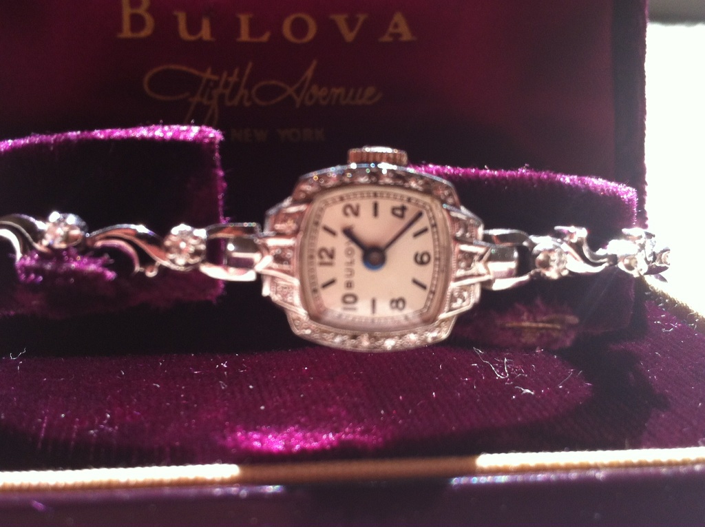 Vintage ladies Bulova watch . 14k with 14 diamonds around band, and small ones around face. Doesn't keep time, but rest of watch in great condition.
