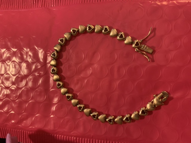 A gold toned heart and ruby link bracelet with FAS on one and a 9 to 5 on the other end of the bracelet…. Don't know if this is Fantastic antique Silver company, or just silver? Can't find anything online