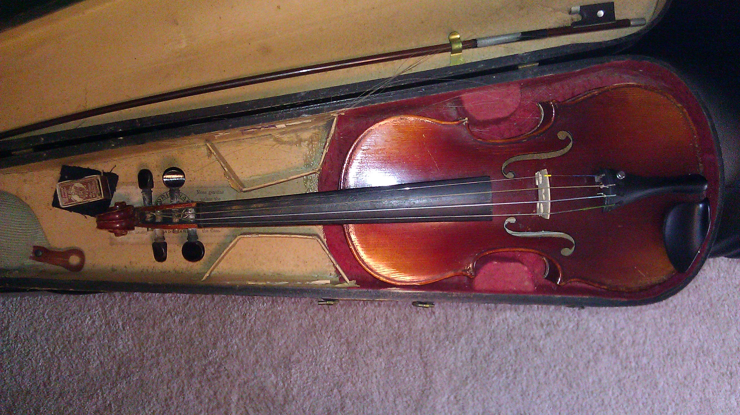I have this violin that is in its original case. My grandmother used it for her lessons when she was a child, and she had received it from her mother and i think so on. On the inside it has a little label that says czechoslavakia antionisu stradurius. Ive looked online for what i may be and i would like to know the value, i also have within the original box is the bow, which is a little rough, and a sholder rest, and an old rosin. which is labeled made in france, palmetto aug. grouses. special process rosin. and the label inside the case reads origanl G&B improved. Thank you. I really woul dlike to get some information on it, it is just sittin in my house.