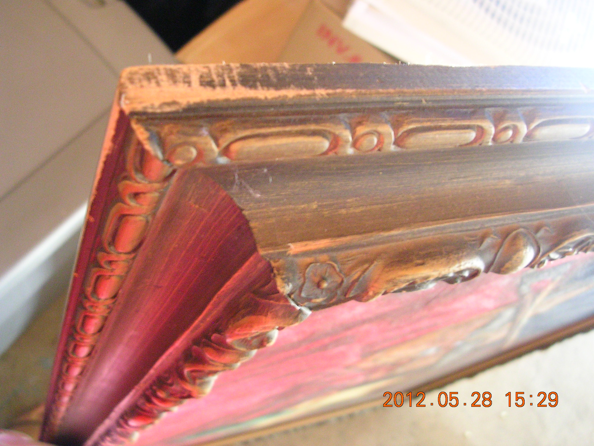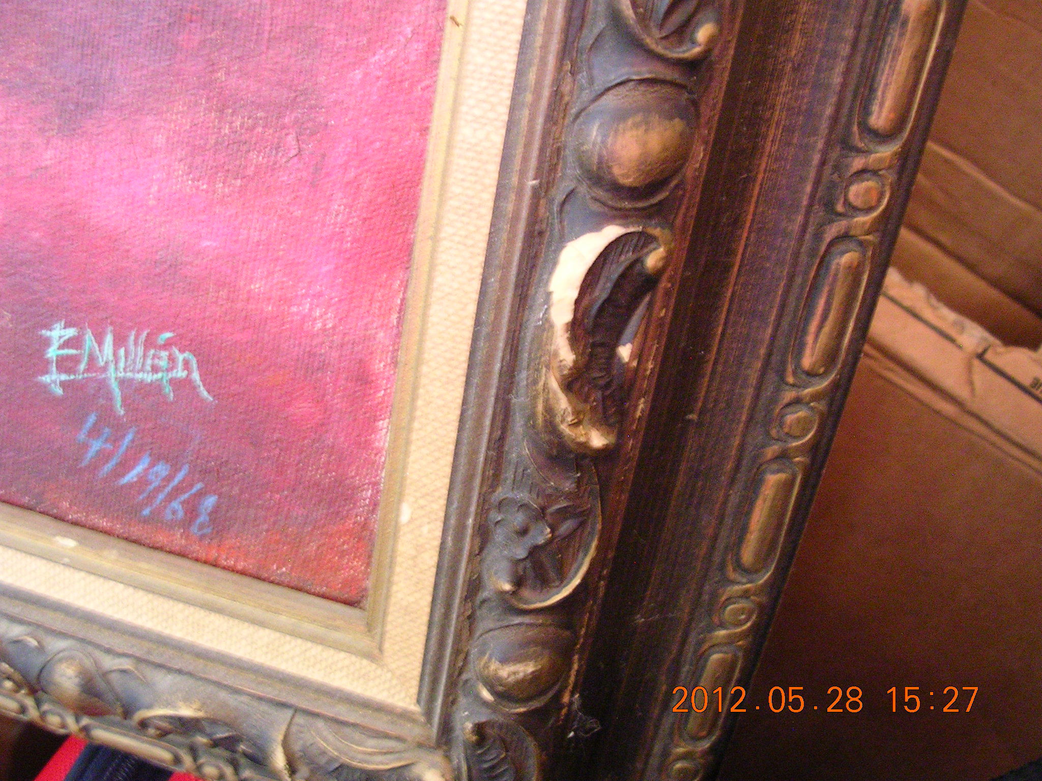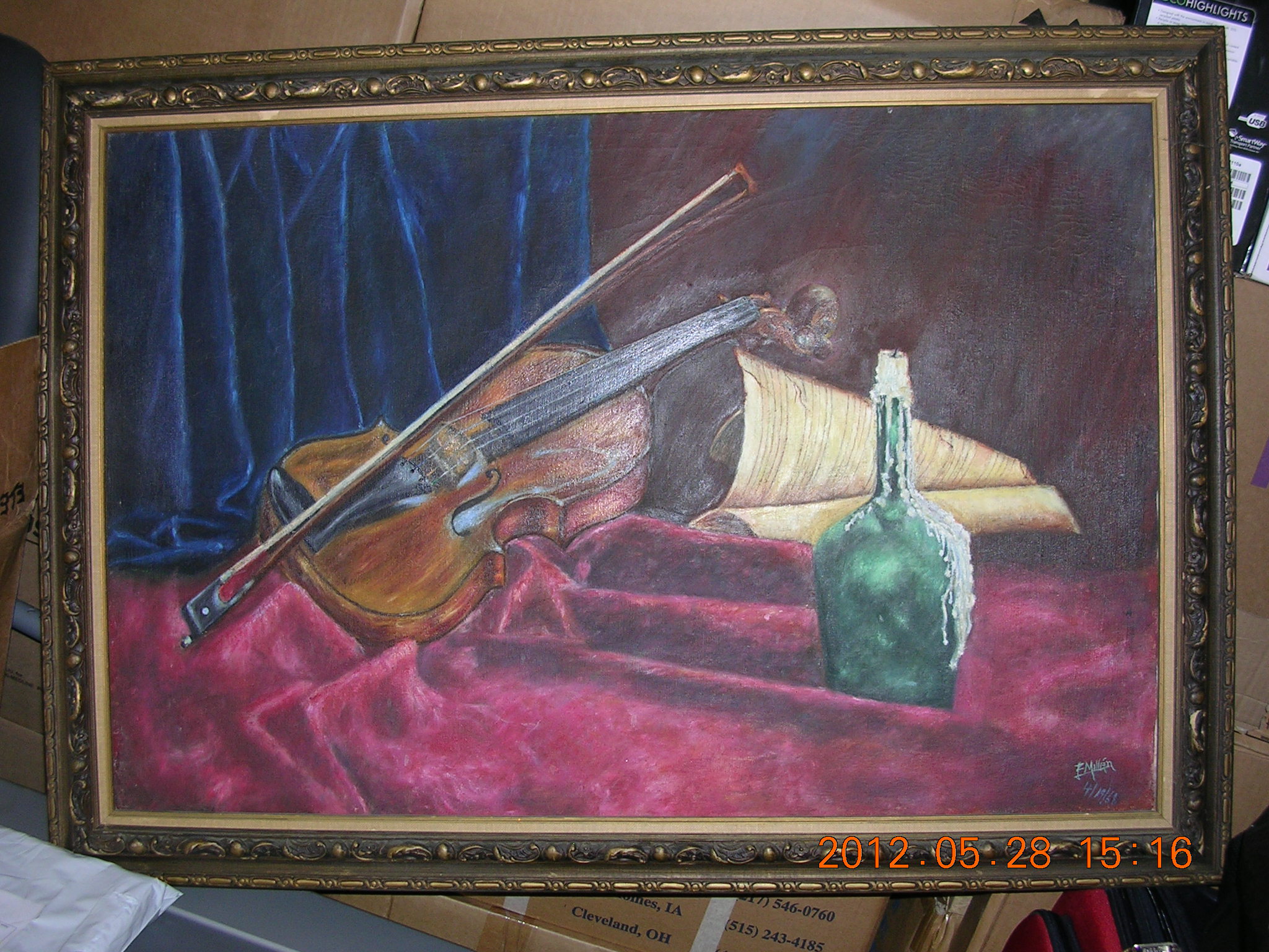 1968 F Millen painting showing violin and candle-bottle as its subject.