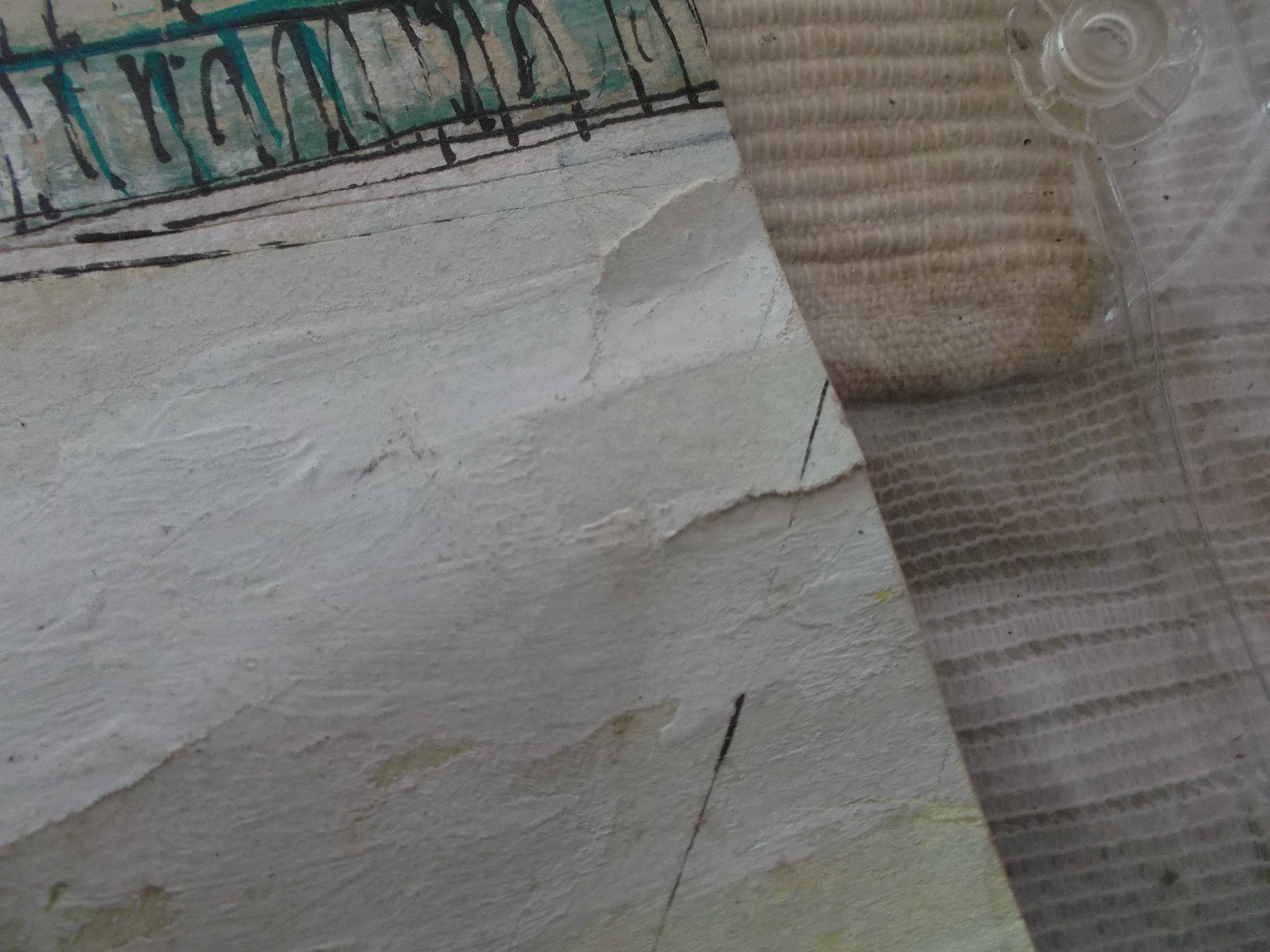 I think it would be called a water color and I'm not sure what material the canvas is but it feels like some kind of skin. There is a small tear on the lower left edge and I sent a picture of that
