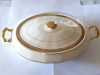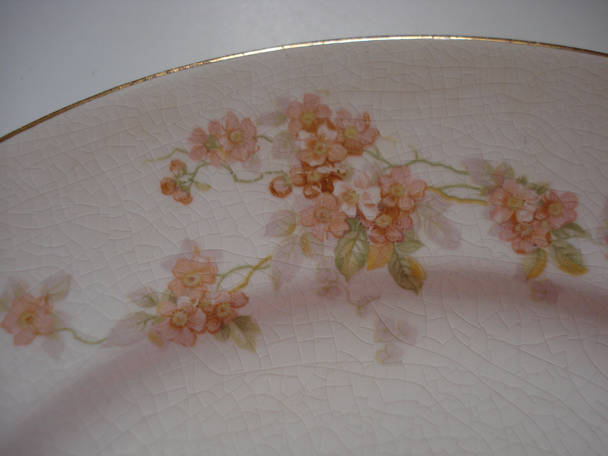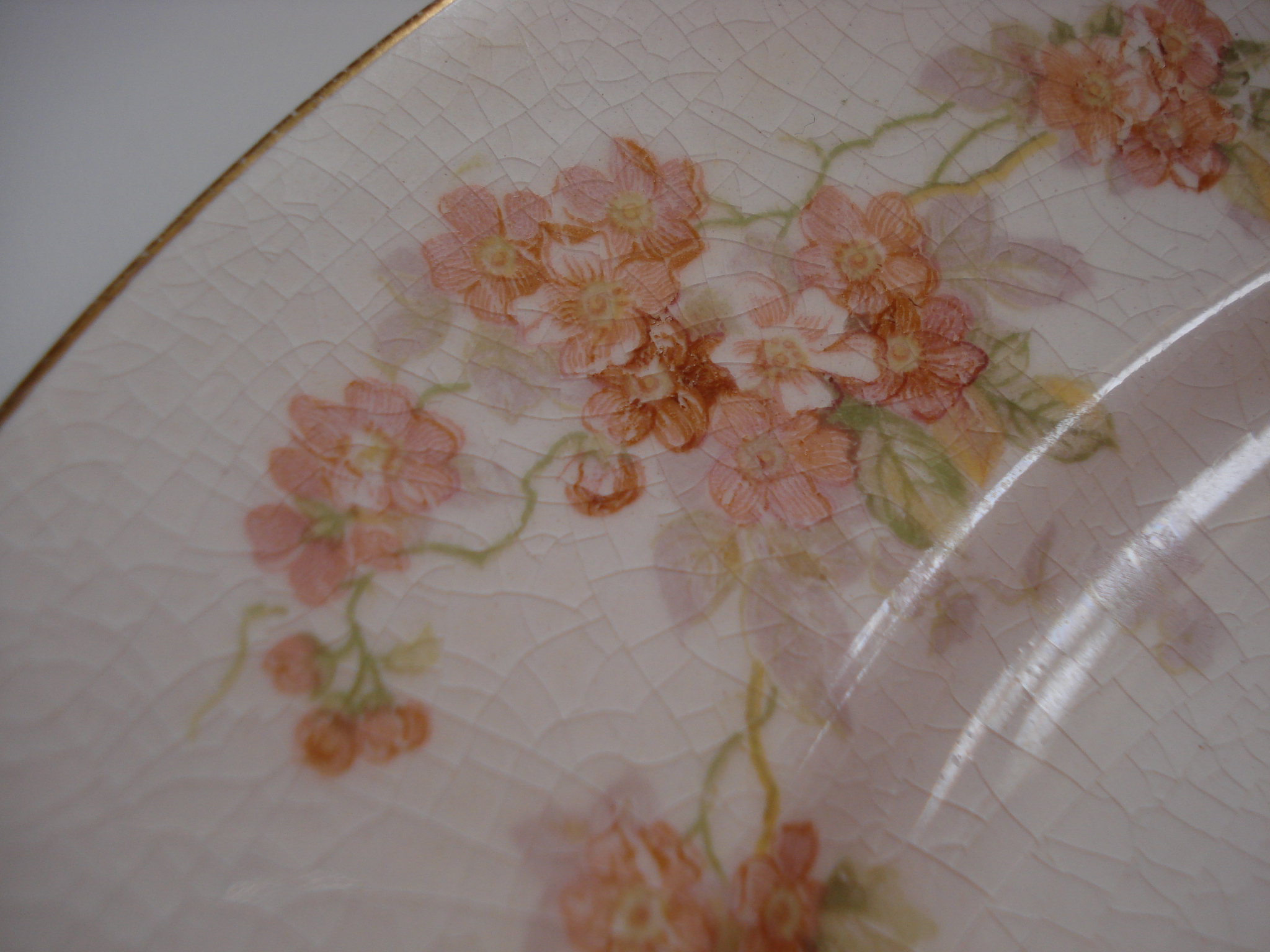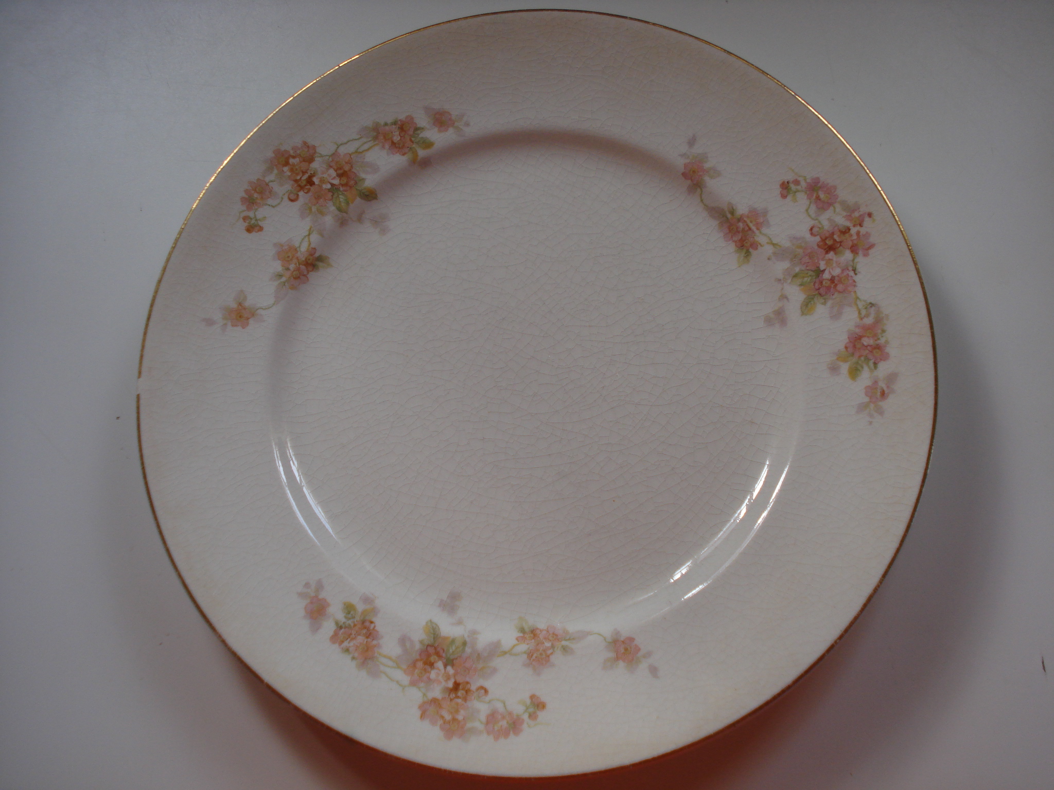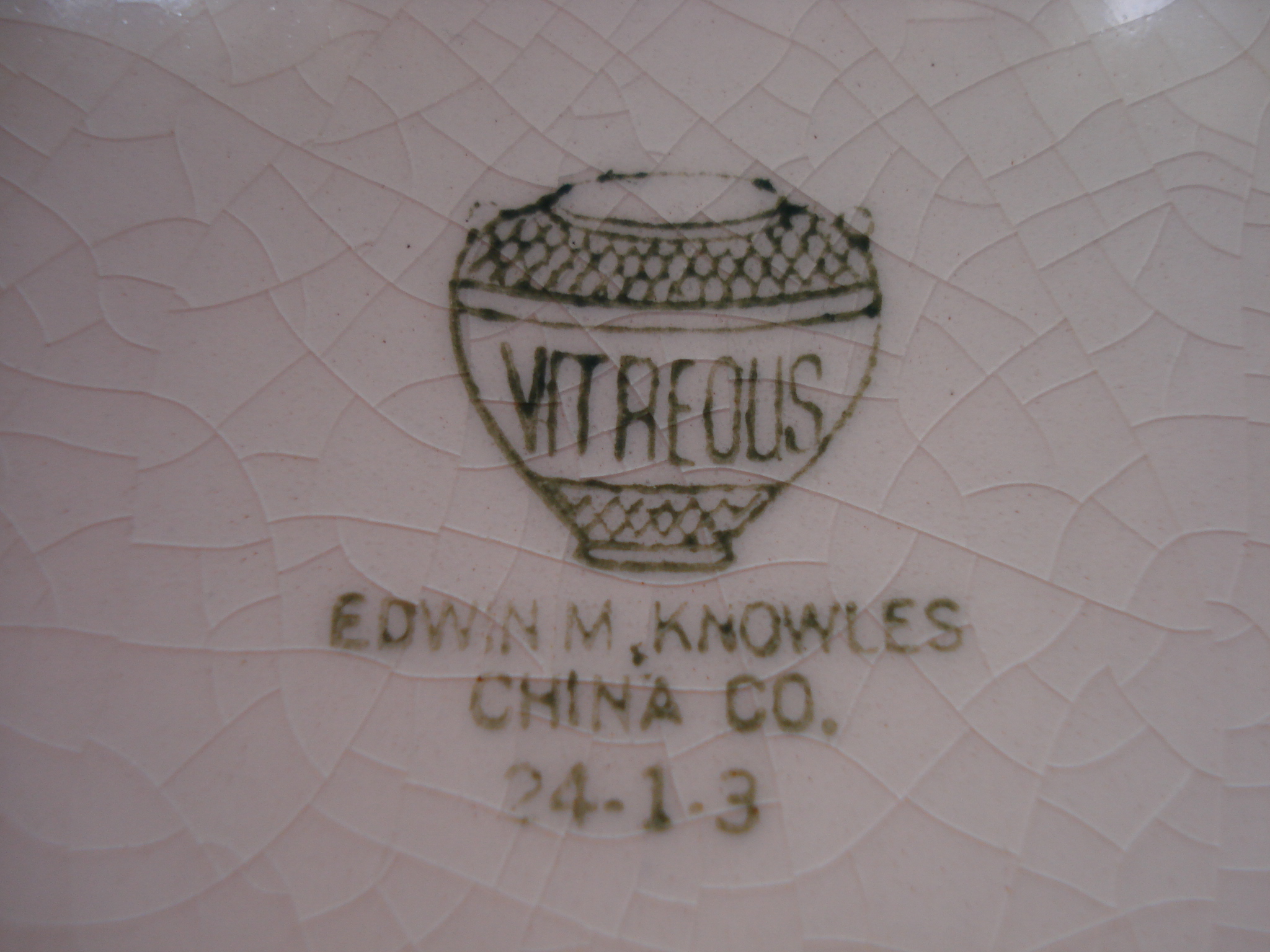 The plate is very lovely, it is in good/excellent( in my opinion) it is an ivory/white color but it looks crackled, and has maybe cherry blossoms (?) or some kind of floral pattern. It has a backstamp that is greenish-black that reads vitreous (across the middle of vase) then Edwin M. Knowles China Co. 24-1-3.