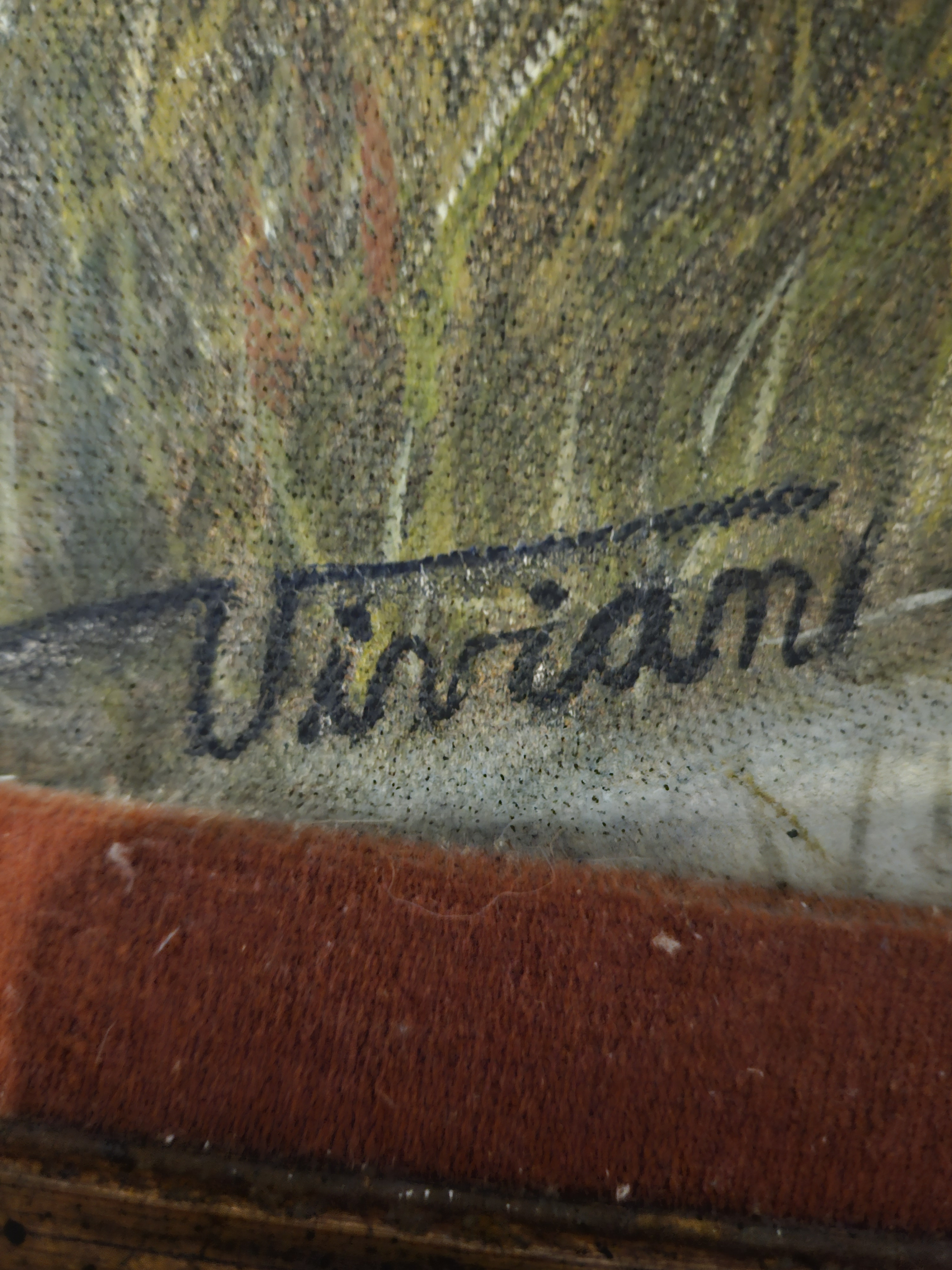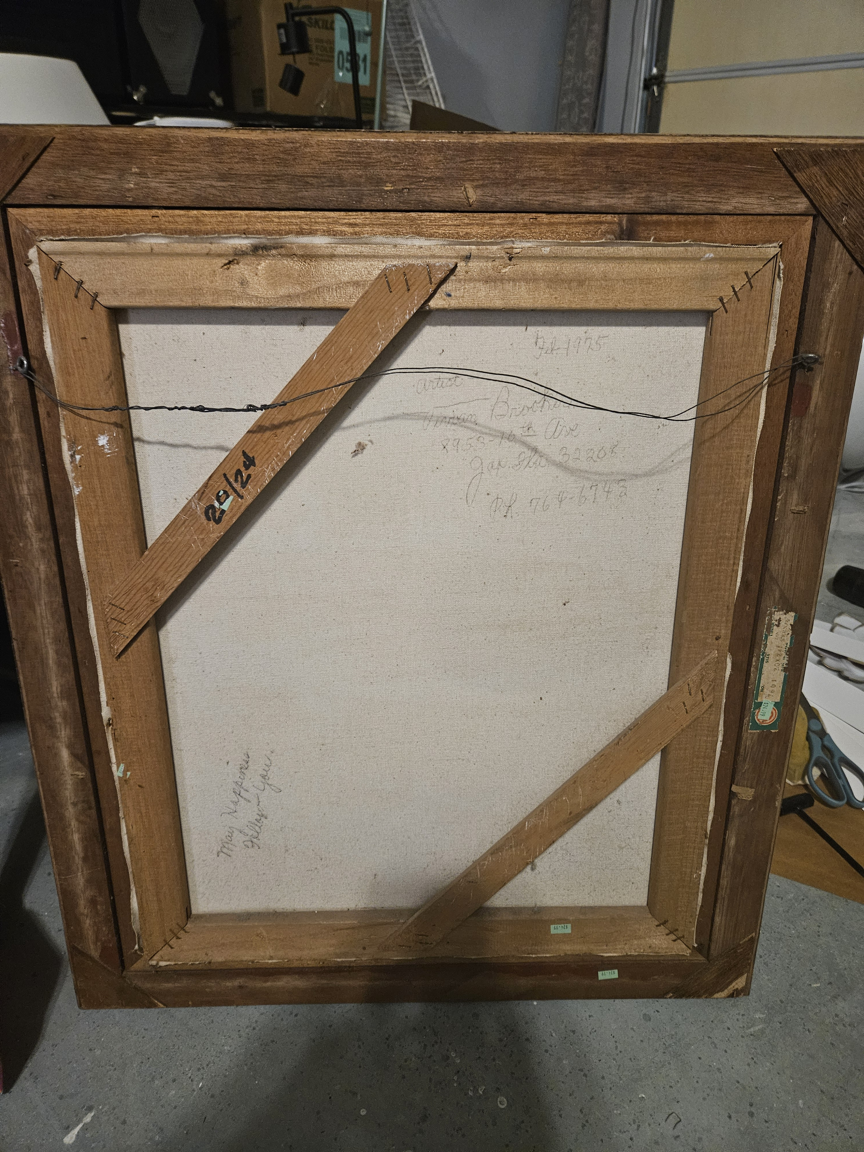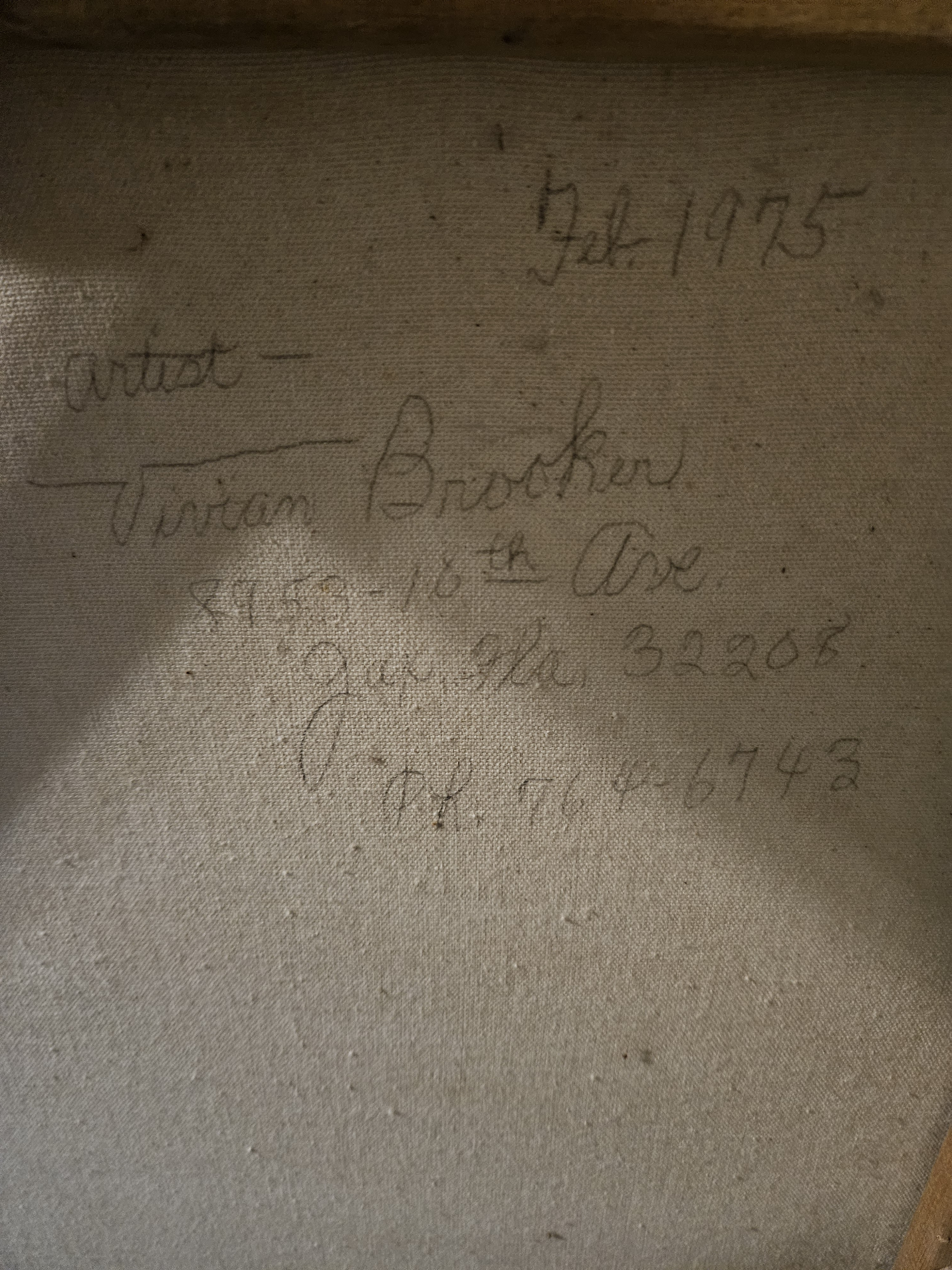 The painting is signed Vivian Brooker, and the back of the canvas includes her full name, address, and phone number from Jacksonville, FL. However, there are no widely known or auction-listed artists by this name, suggesting that she may have been a regional or local painter rather than a nationally recognized artist.