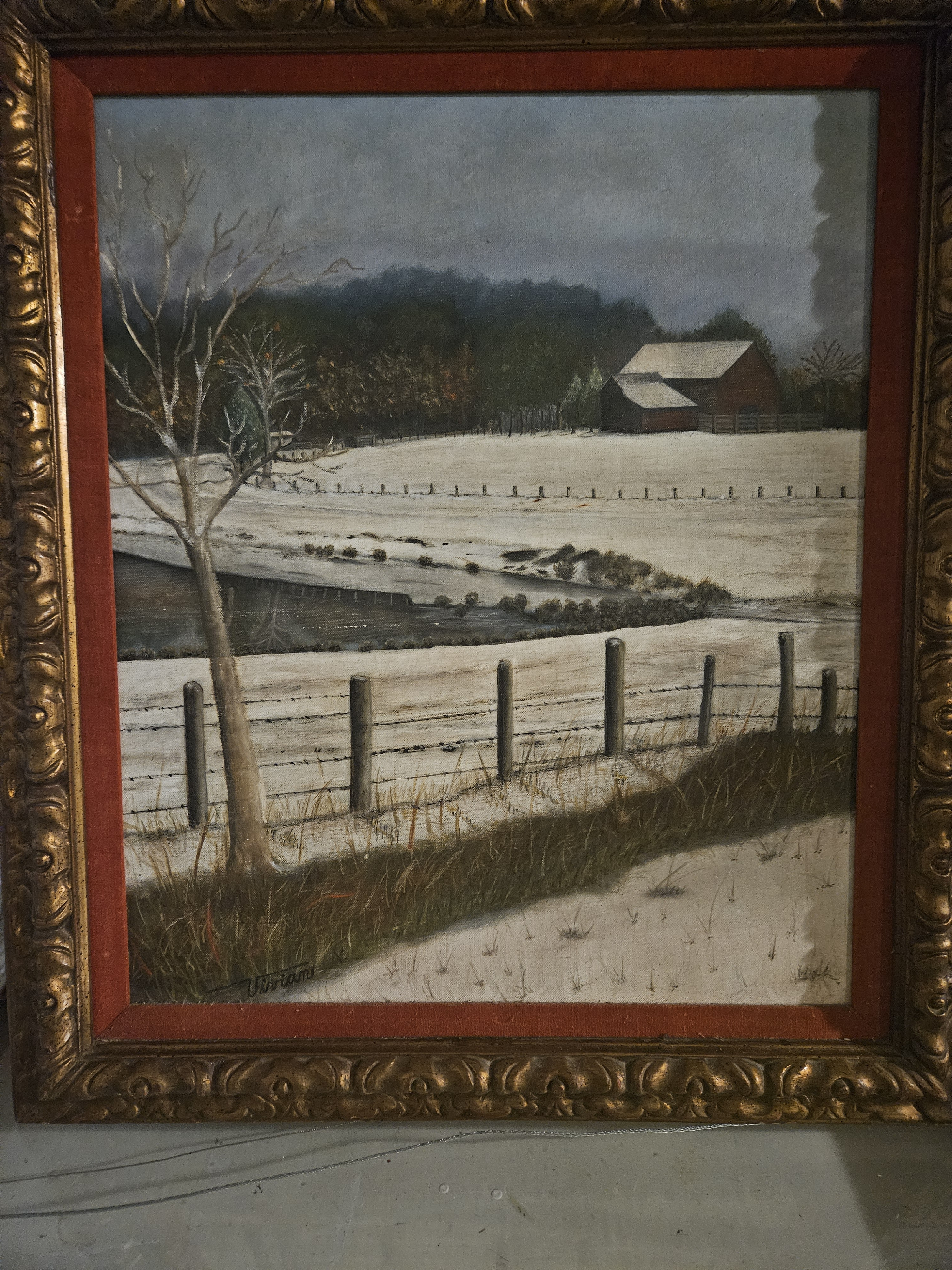 The style of the painting, depicting a quiet snow-covered countryside with a barn and trees, is reminiscent of mid-20th-century American realism, often seen in works by local and self-taught artists.