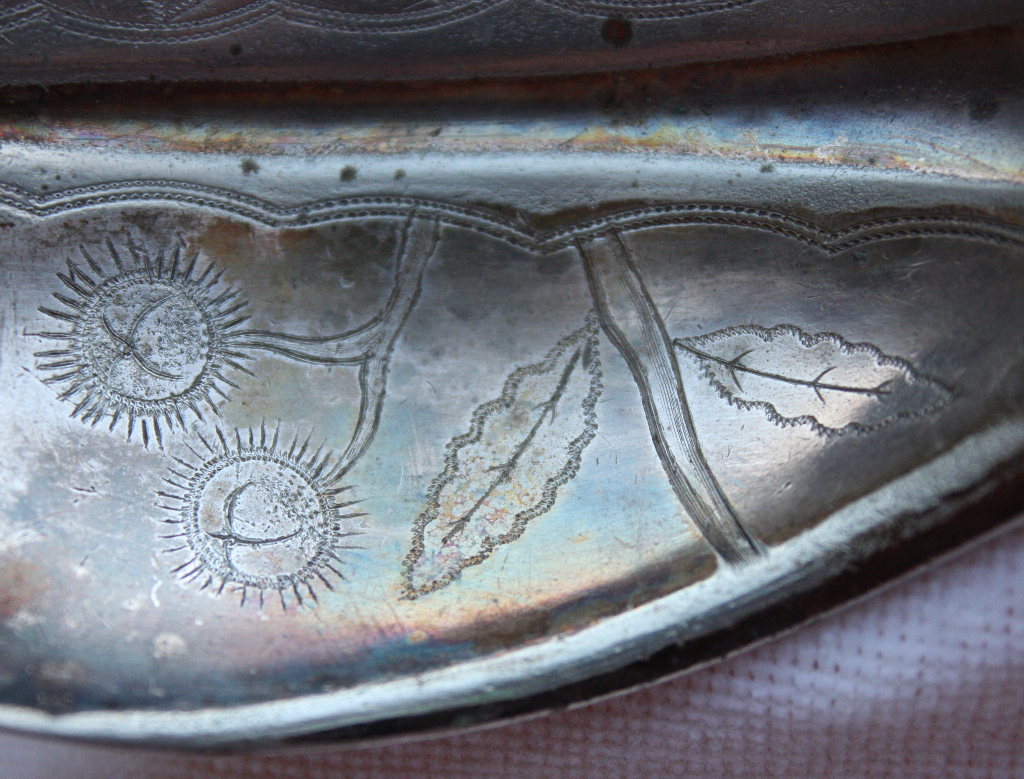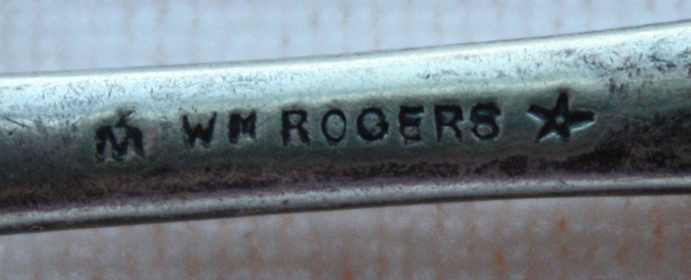 This is a large serving spoon (berry spoon?) of some sort that is heavily tarnished (want to find out what it is before cleaning it). On the back is has a bird/eagle mark then W M ROGERS followed by a star stamped on the neck of the spoon. The bowl is rounded with a groove runing down the center and on each half of the front of the bowl is an engraved botanical picture that looks like a buckeye tree. The back of the bowl is plain. On the handle is a floral pattern with an open area that looks to be where most people would put an engraved initial, but it is blank. According to what I could find about Wm. Rogers he used this mark between 1825-1841 on his coin silver spoons...but it was also replicated by the International Silver Co. well into the 1930s. Couldn't find a matching pattern anywhere I looked and nothing that had an engraved bowl. Maybe it was a custom piece done by a previous owner? No idea. I am wondering what kind of spoon it is? and what its age is? and if it is coin silver or plated?... purely out of curiosity. Any info about this beautiful piece of history would be greatly appreciated!. Thanks all!!