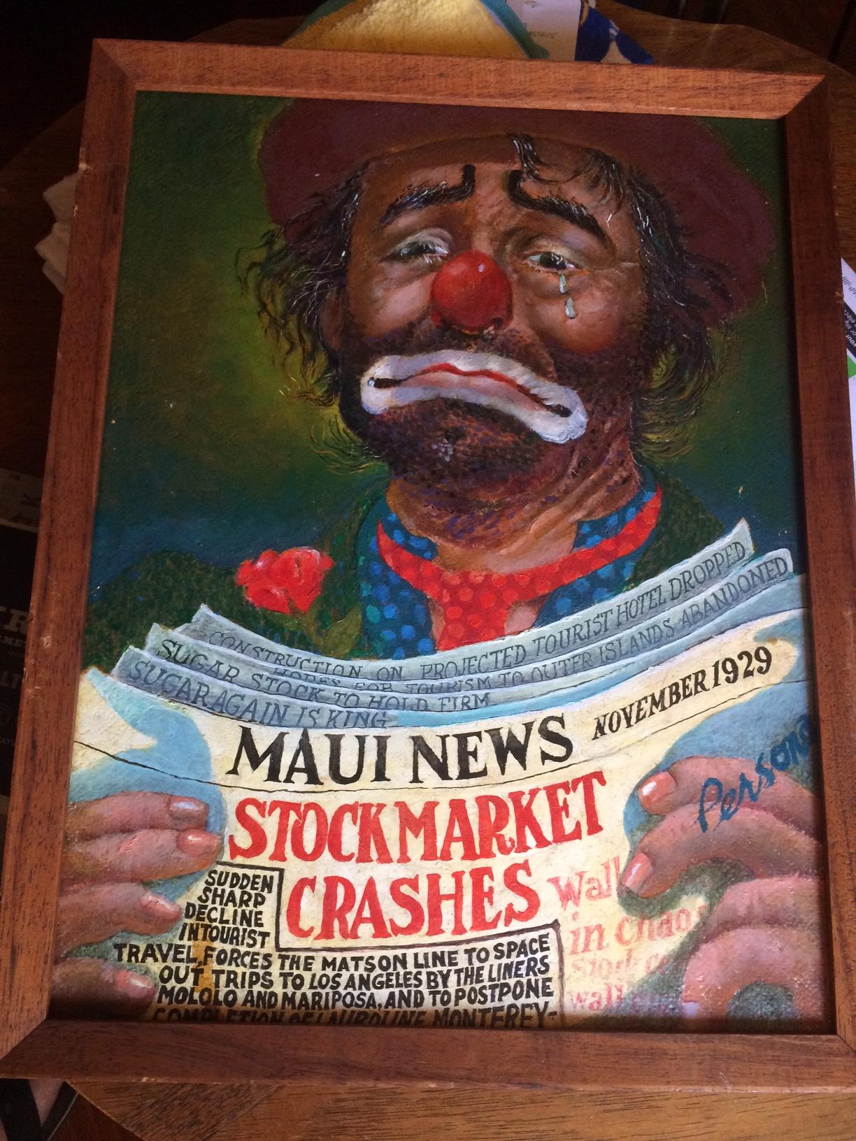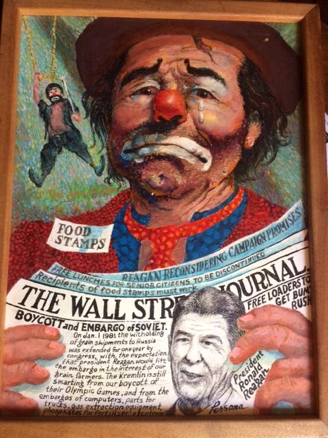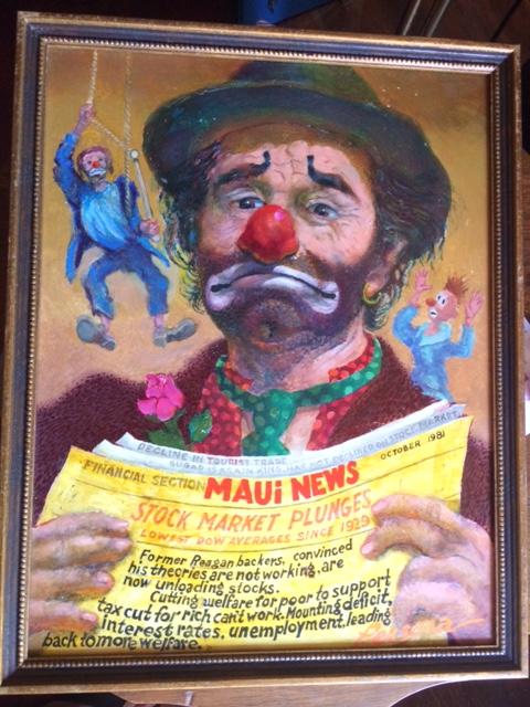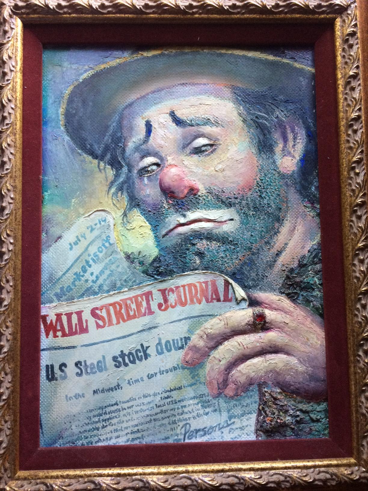 4 W. Parsons (Persona) of Clown financial stock market crash. Largest 14x 18 in, Wood framed. Oil on hardboard, Signed Persona. Two others 12 x 16 in wood framed Oil on Hardboard. 4th picture is acrillic with dime store ring on Finger See Pictures. Circa 1970's.