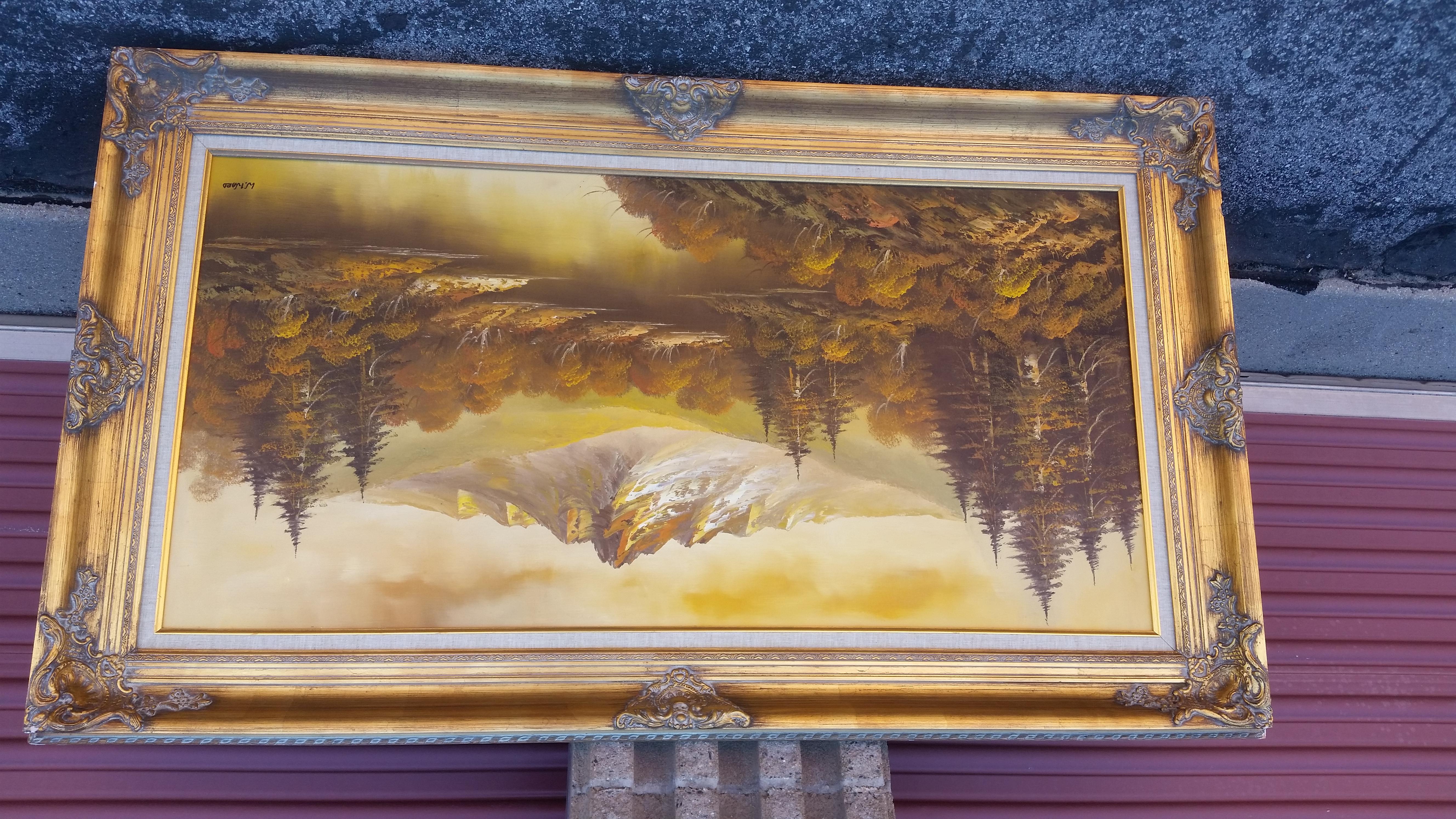 Original W. Ward oil painting . Scenic mountain lake, subject 1512. 24 x 48 inch.