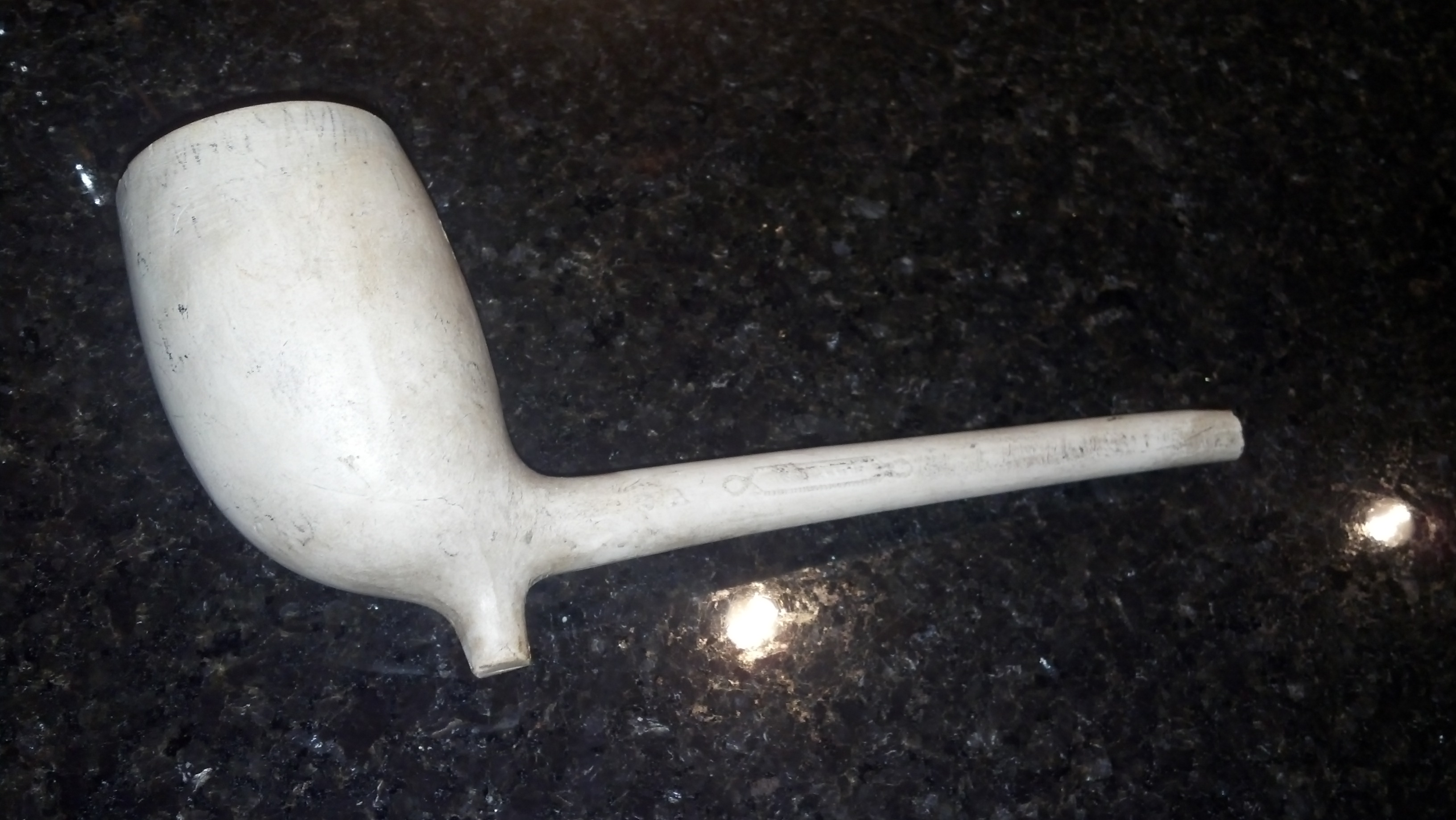 This is an unused, white clay pipe that is stamped "W. White - Glasgow" on the bowl. It also has "5A" on the stem with some other markings that can't be read. It's in very good condition with just a few chips. It was never smoked. It is assumed it was made from the William White Factory in Glasgow in the late 1800s but not much other information is available.