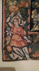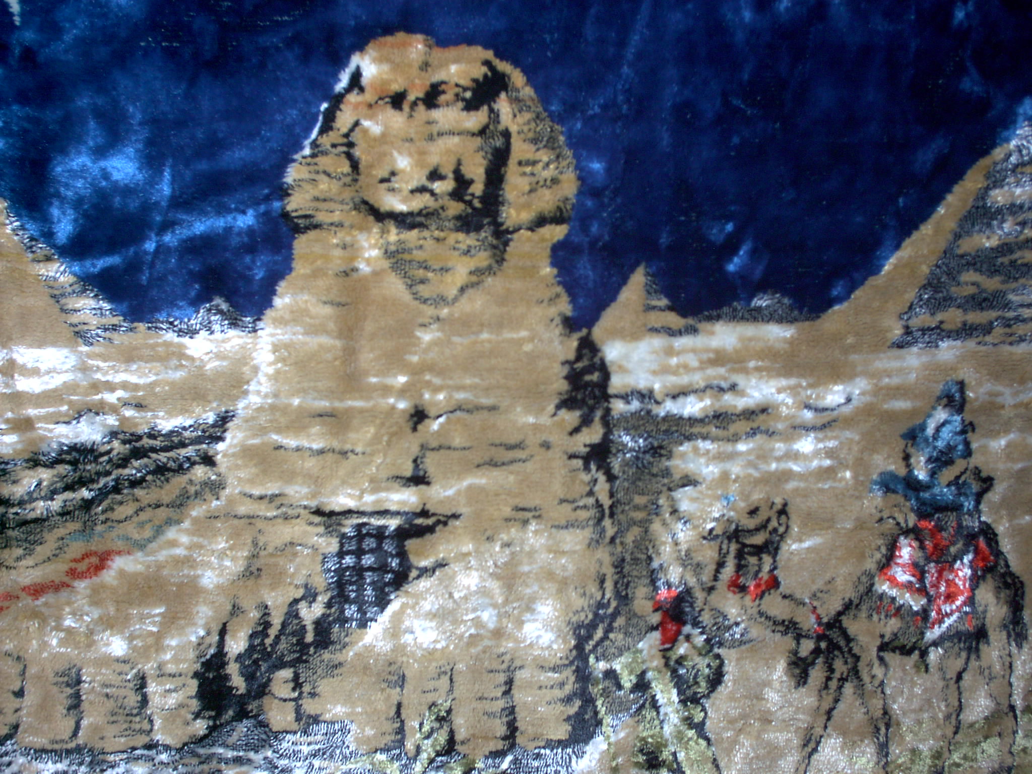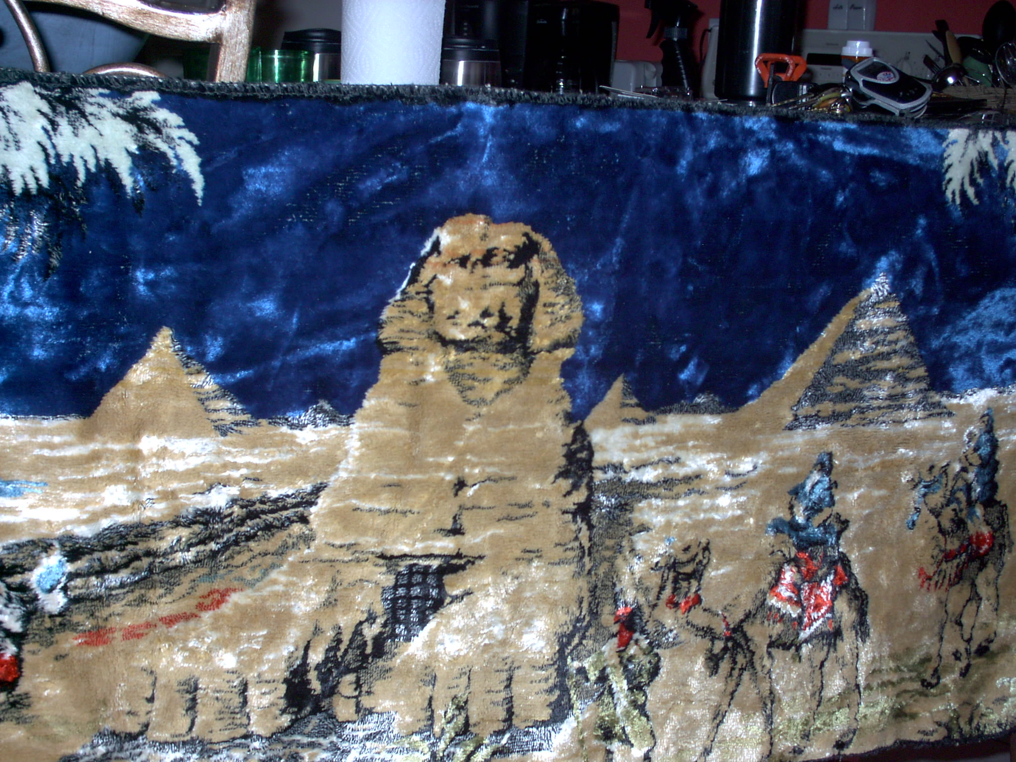 This Hanging/Tapestry has extremely vibrant colors of navy blue, tan, red, white and black. The picture is the egyptian pyramids in the backround with Sphinx in foreground, and men on camels riding in the front of the Sphinx.