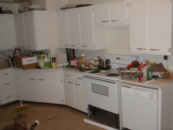 Walnut kitchen cabinets, original to the home, have been painted white, some in better condition that others but none are destroyed or in poor condition.