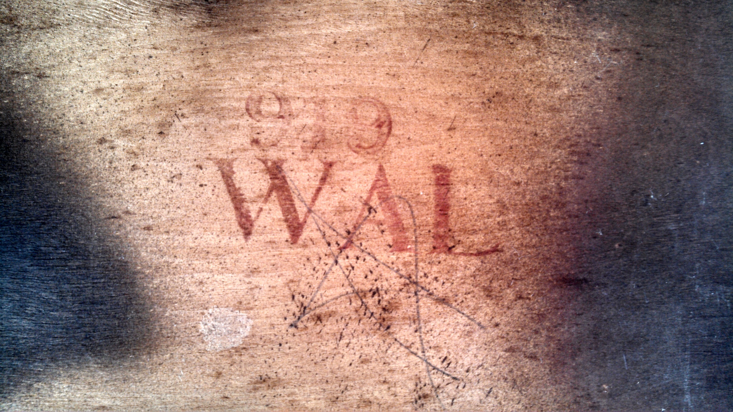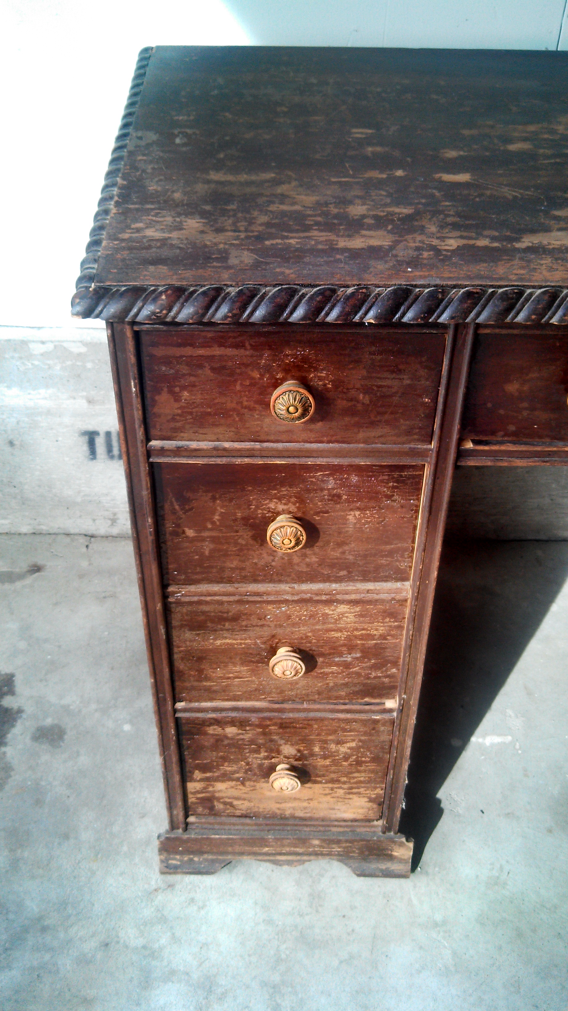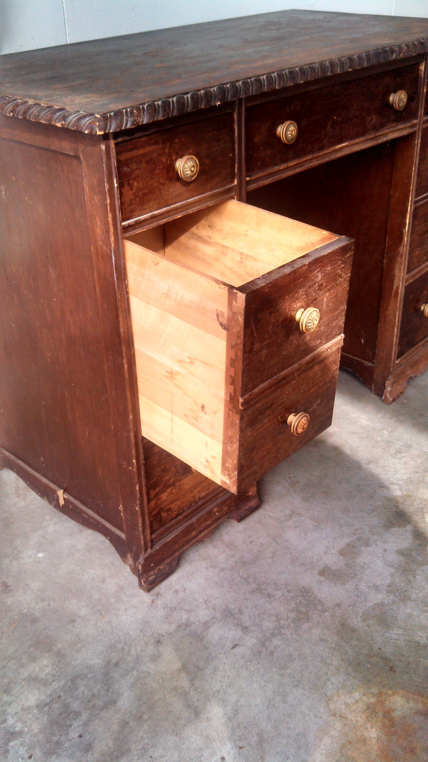 Looking to know the value of this pedestal desk with carved details. Wood carved knobs held with round screws. Three drawers on top. 2 deep middle drawers. Top center drawer marked "919 WAL" on bottom.