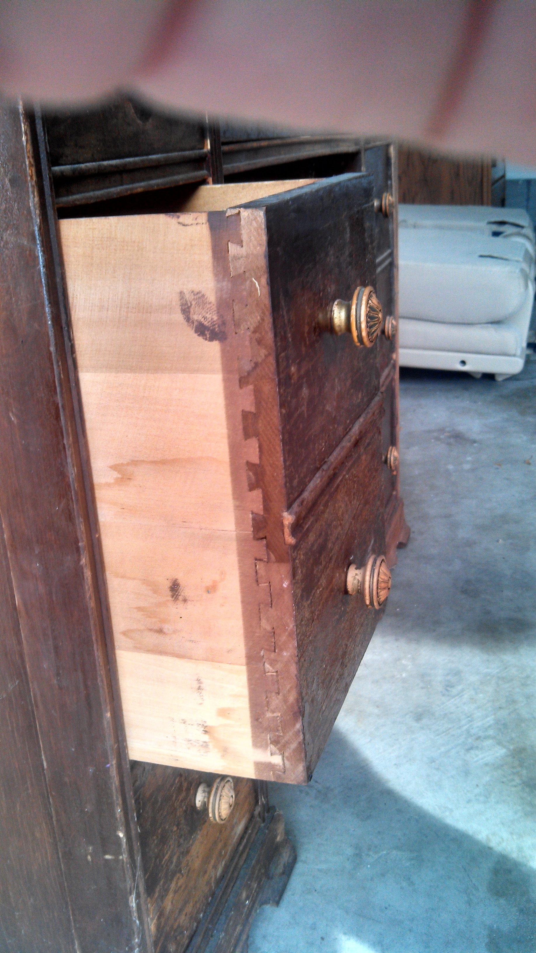 Deep middle drawer on left side missing left drawer railing.