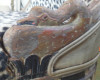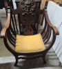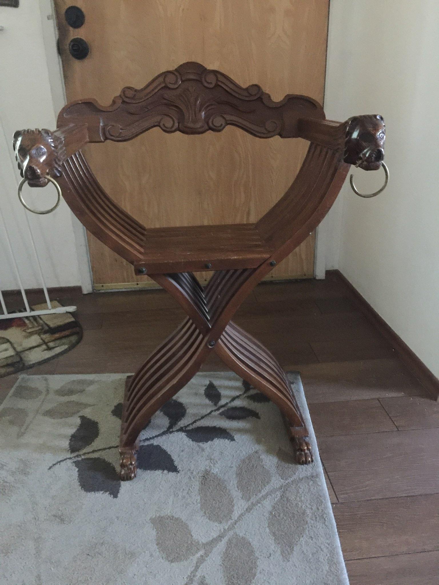 gorgeous carved Savonarola style pair of chairs in walnut with lion heads for the arm ends. This is a vintage circa 20th century pair in terrific condition.