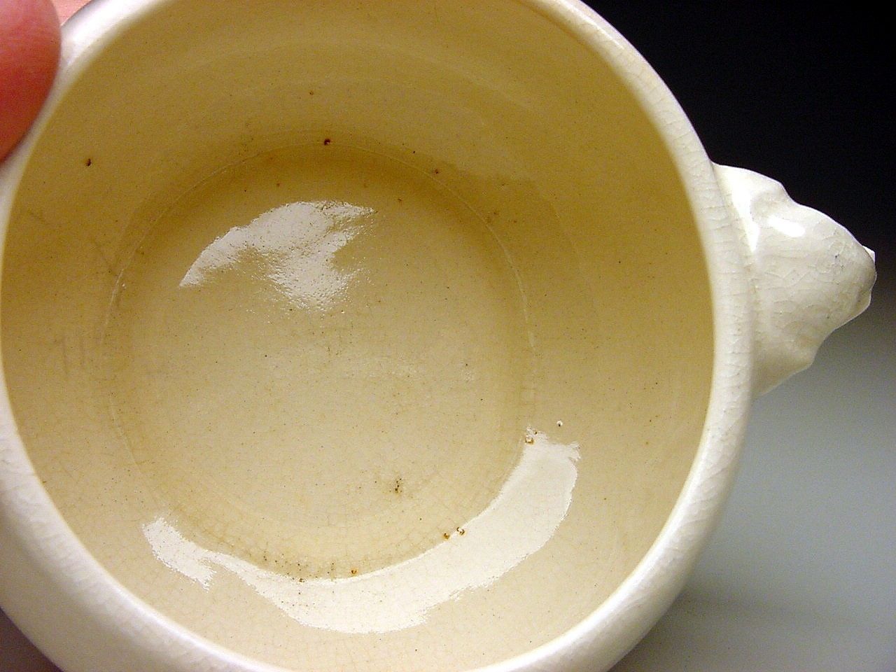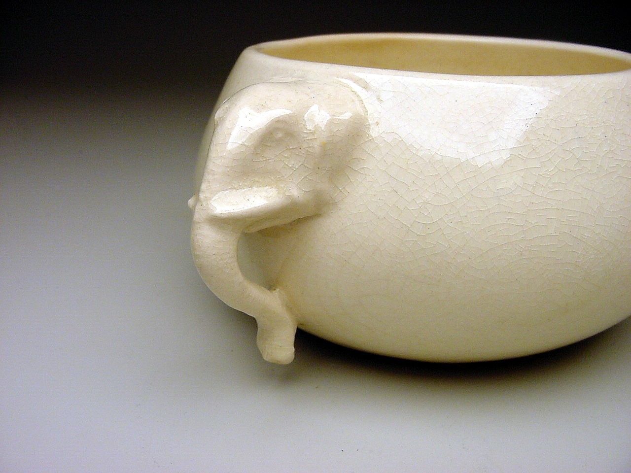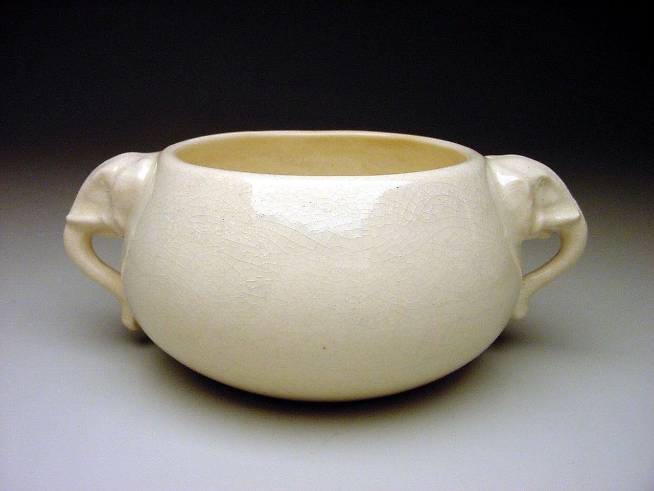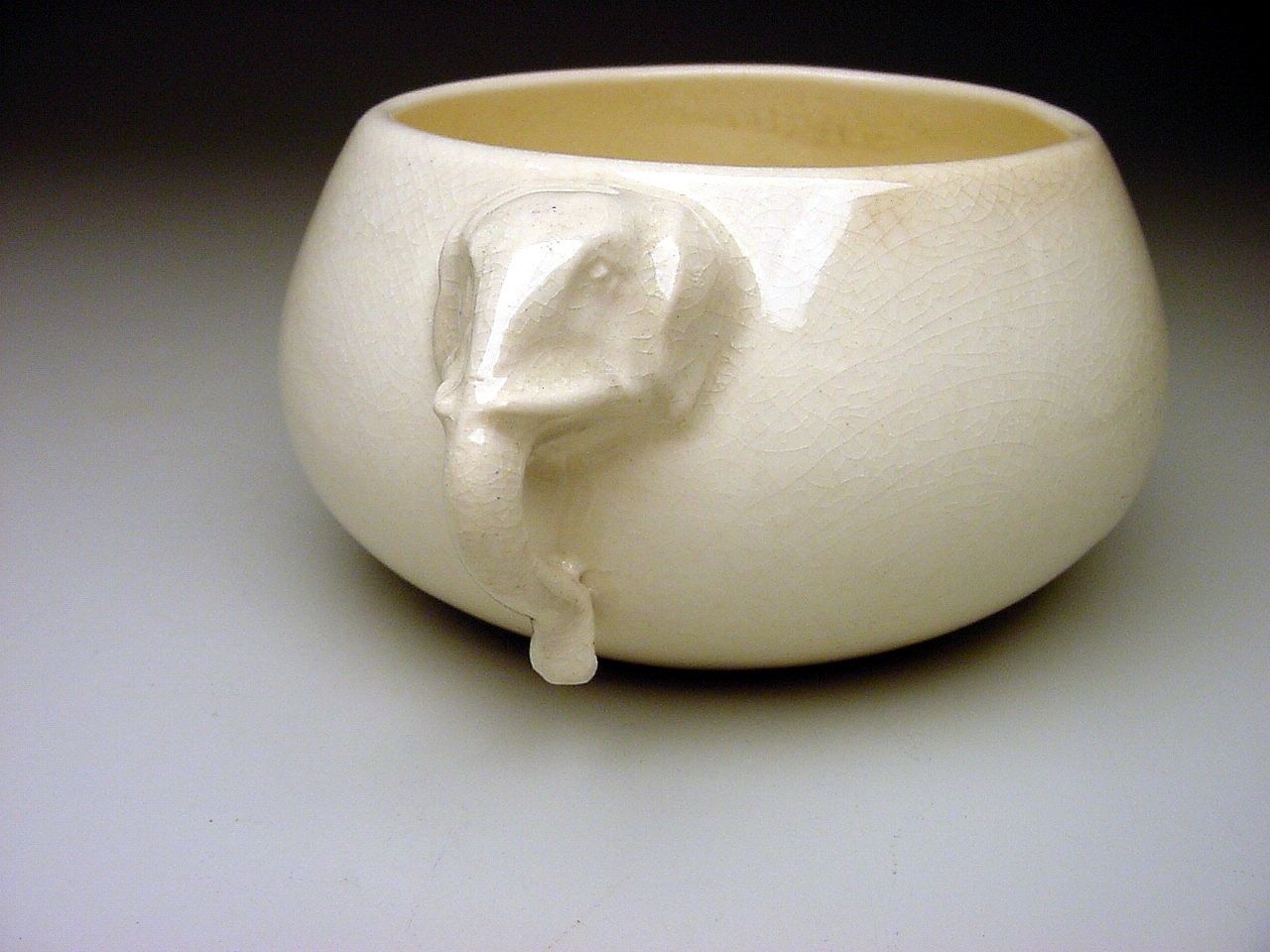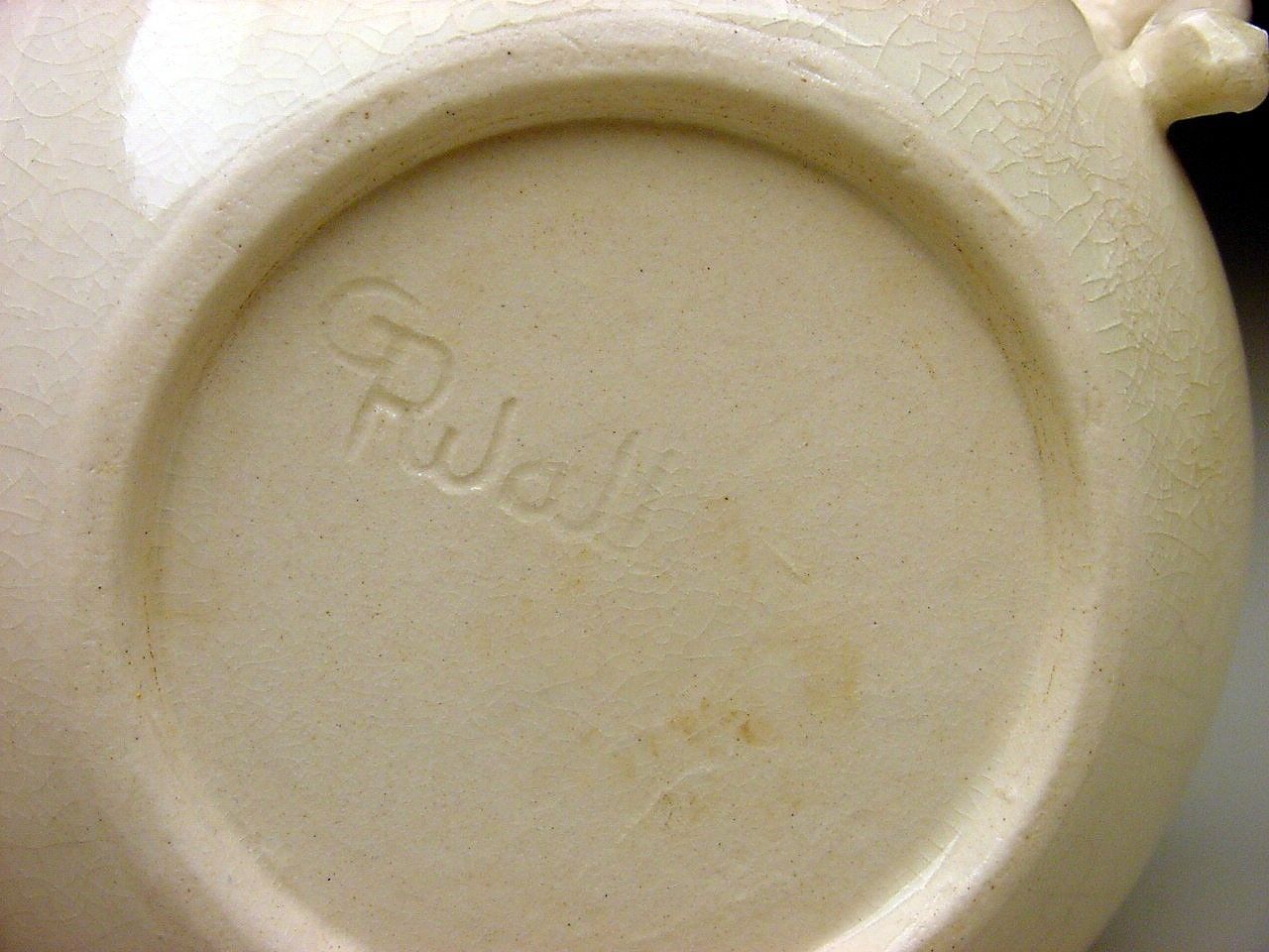 First off I purchased this bowl because of the unusual elephant head handles. Now I am trying to find out more info on it. It measures about 6 3/4" in diameter and stands about 2 5/8" tall. It is an ivory color and shows overall crazing to the glaze. The part that baffles me is the signature on the bottom. I am pretty sure that this piece was made by Gertrude Rupel Wall cofounder of Walrich Pottery in the early 1900's. I have seen the GR and Walrich Berkley Cal. signatures but not this one. Can anyone shed some light on this piece? Is it a rare piece? Maybe a one of piece? How about the value of this bowl? I have contacted the Oakland Museum in California and am awaiting there reply. The museum is said to have a large collection of Walrich pottery and a number of pieces made by Gertrude Rupel Wall. Any info on this piece would be greatly appreciated. Thank you.