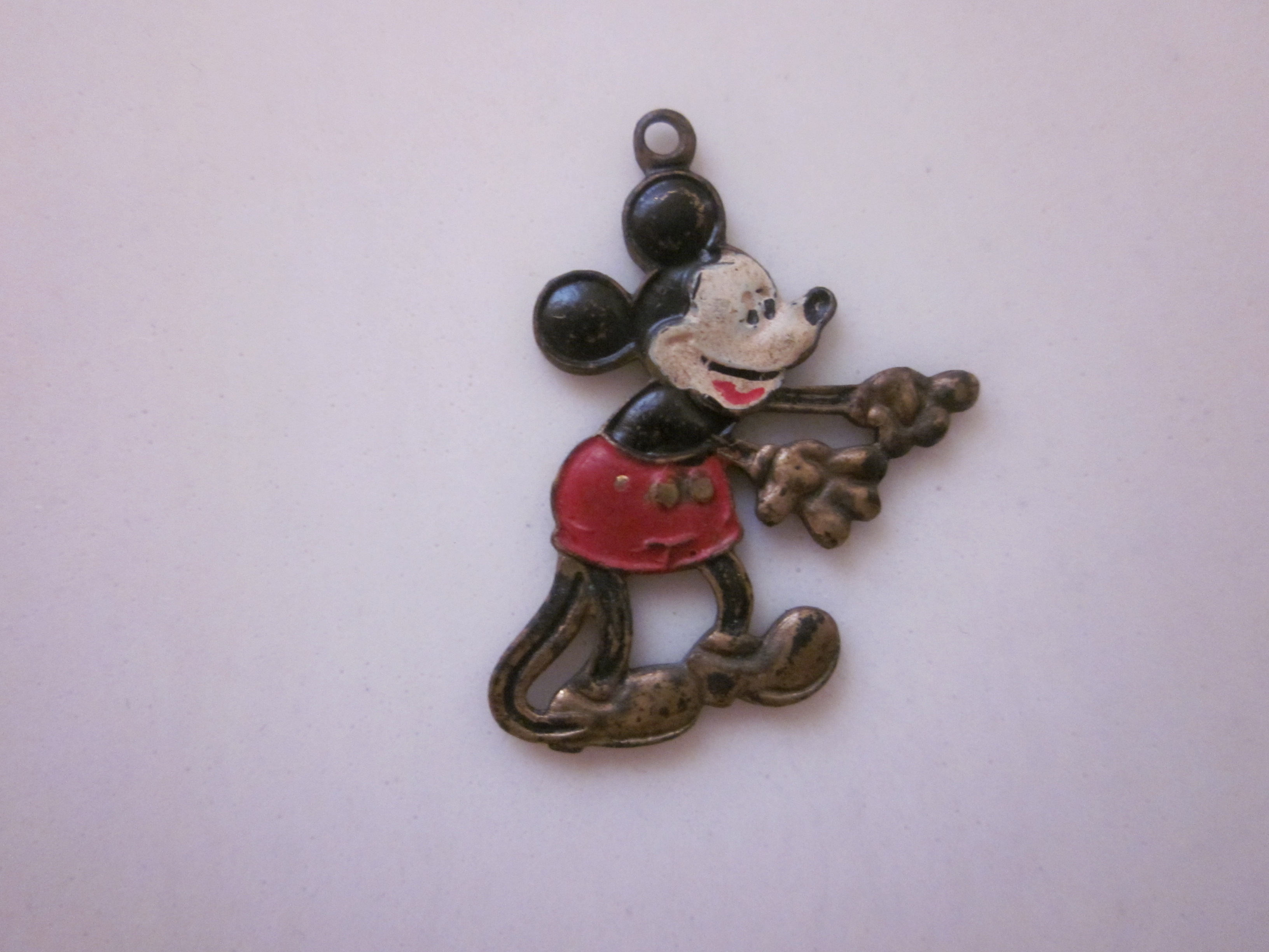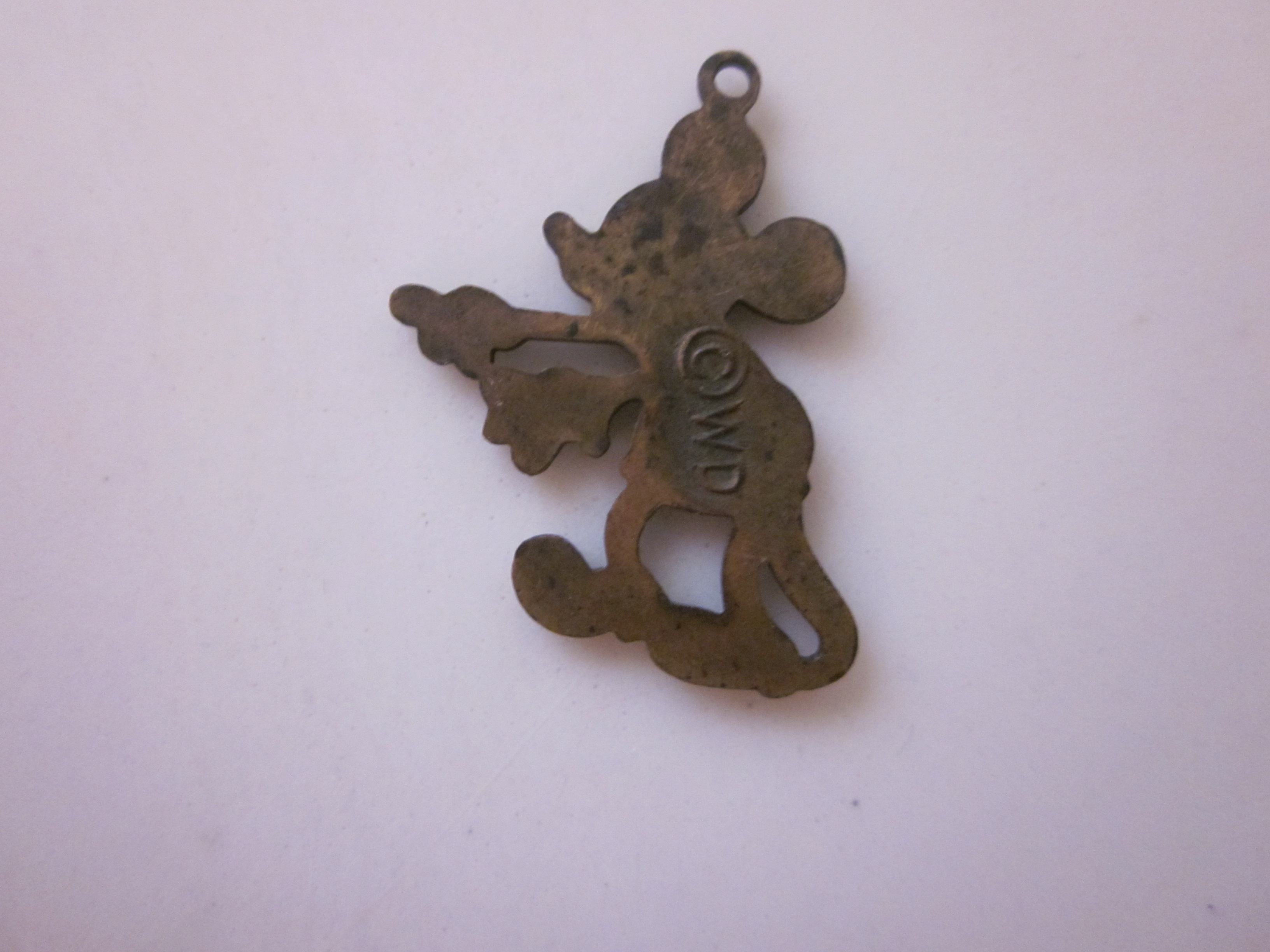 Small (11/12 of an inch) metal Mickey Mouse pendant/charm (small loop at top) "Bronze" color back with "c WD" on back. Arms and legs are the "bronze" color but Mickey and clothes are enamel. I couldn't find anything comparable to it on the net in my searches and was wondering about it. I purchased it at an estate sale.